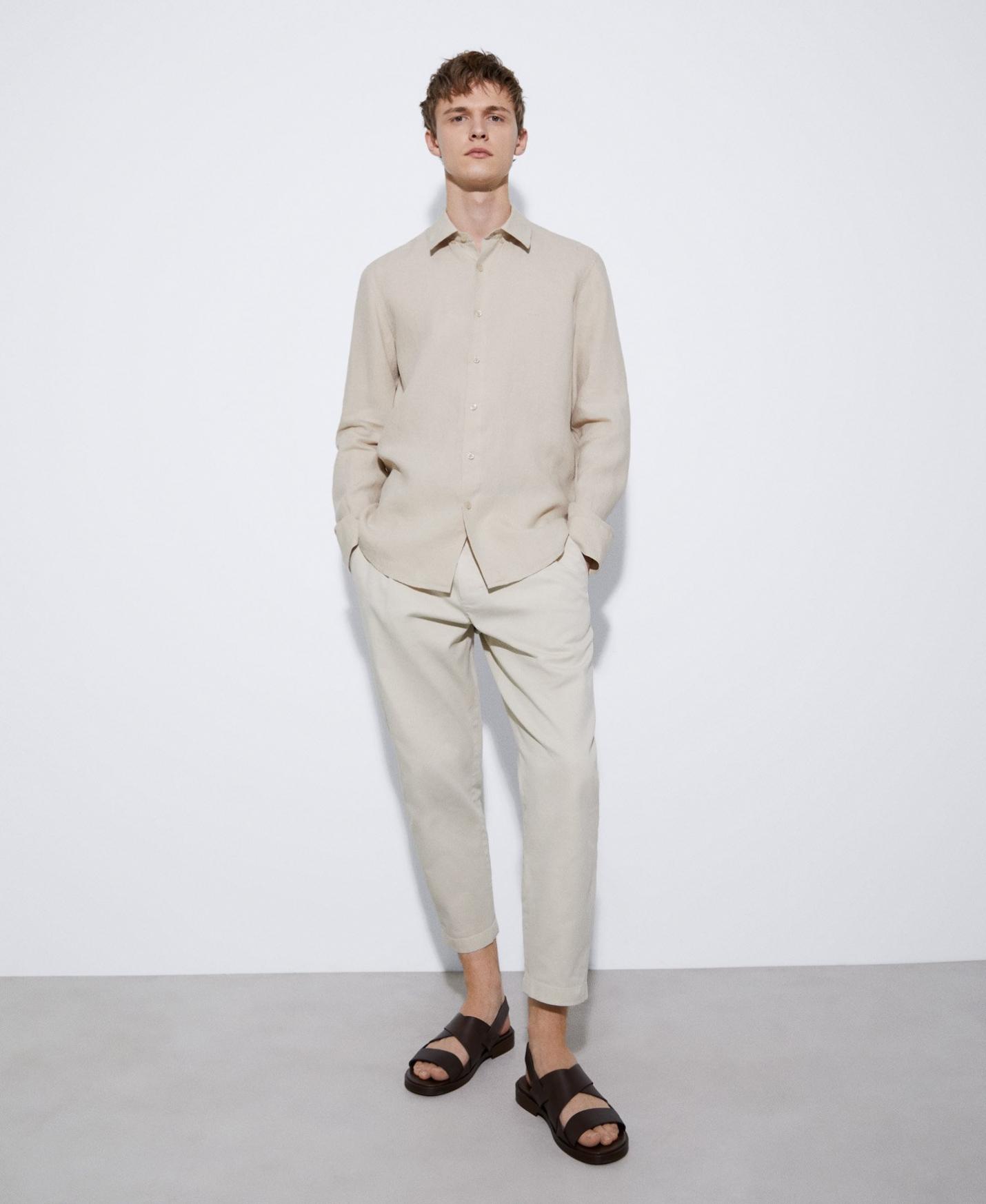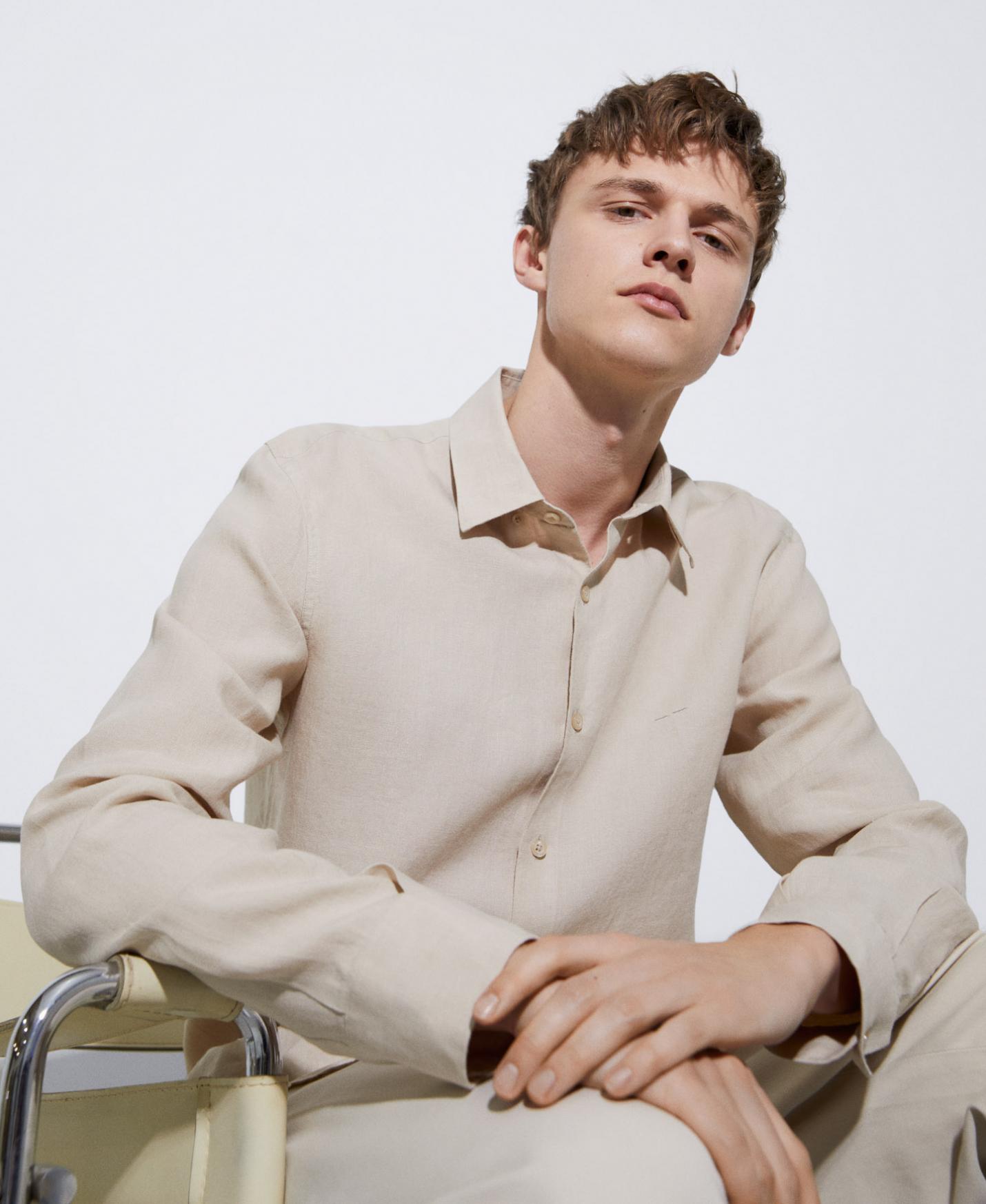 Camisa cuello solapa en lino 100%. Tiene botón bajo el cuello, cierre de botonadura central y manga larga rematada en puño con botones.