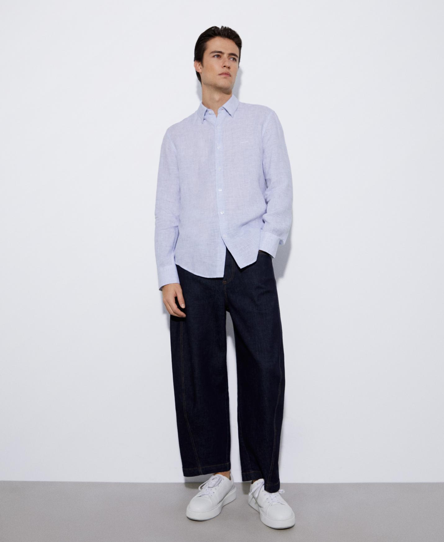 Camisa cuello solapa en lino 100%. Tiene botón bajo el cuello, cierre de botonadura central y manga larga rematada en puño con botones.