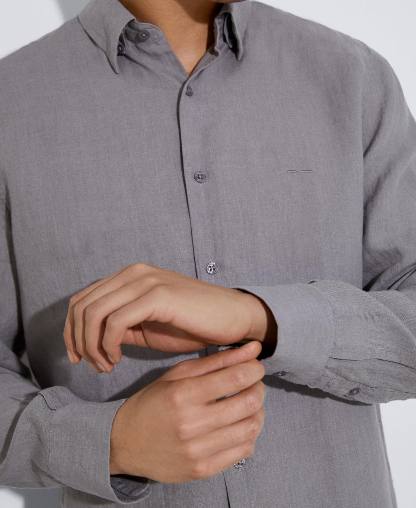 DescripciónRef.120092004221 Camisa en lino 100%. Cierre de botonadura central con botón bajo cuello. Manga larga con pu…