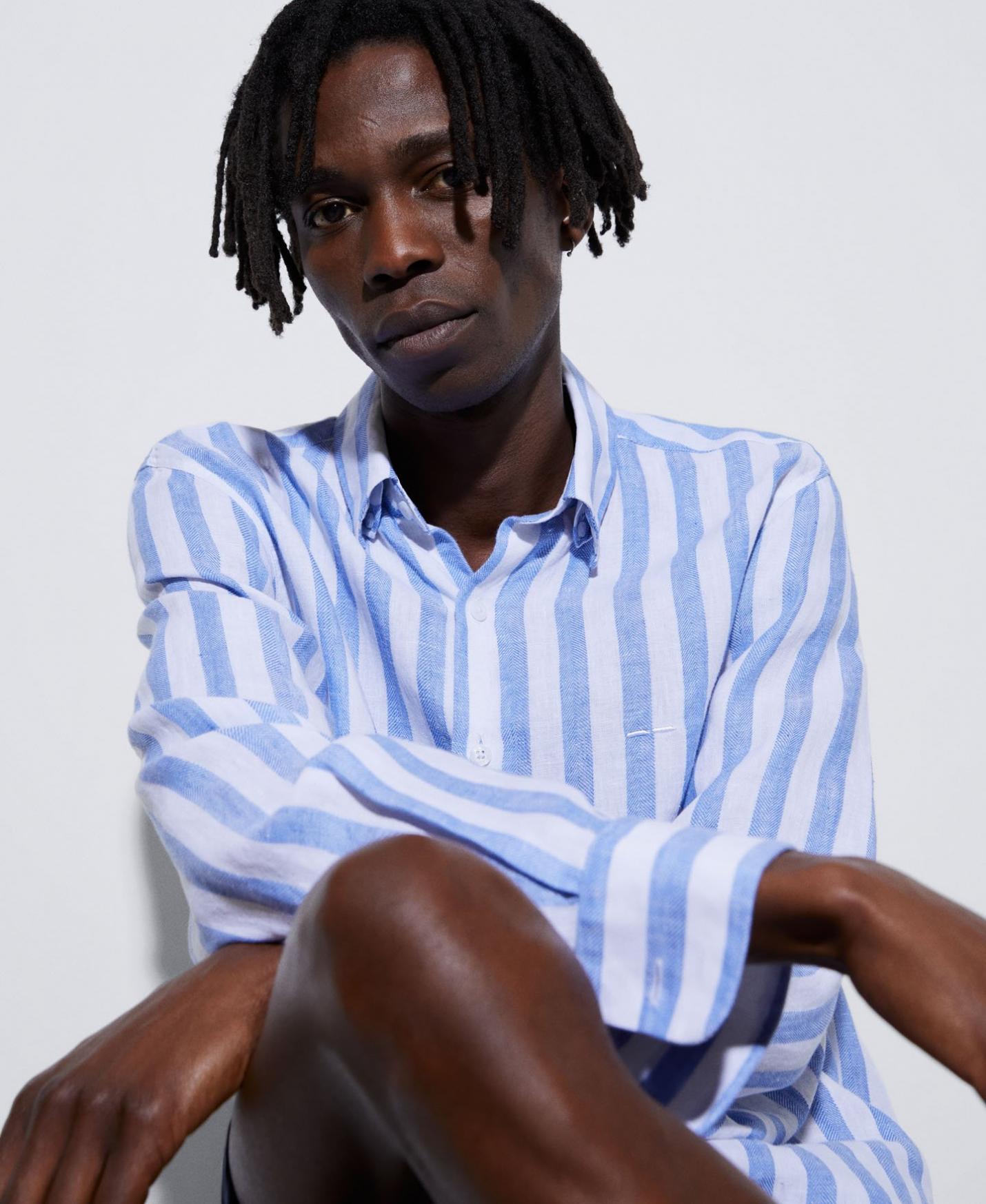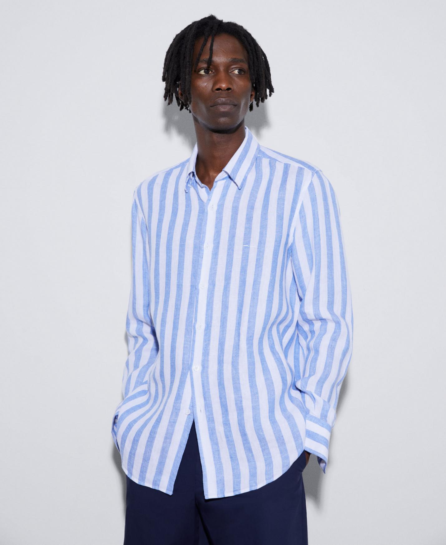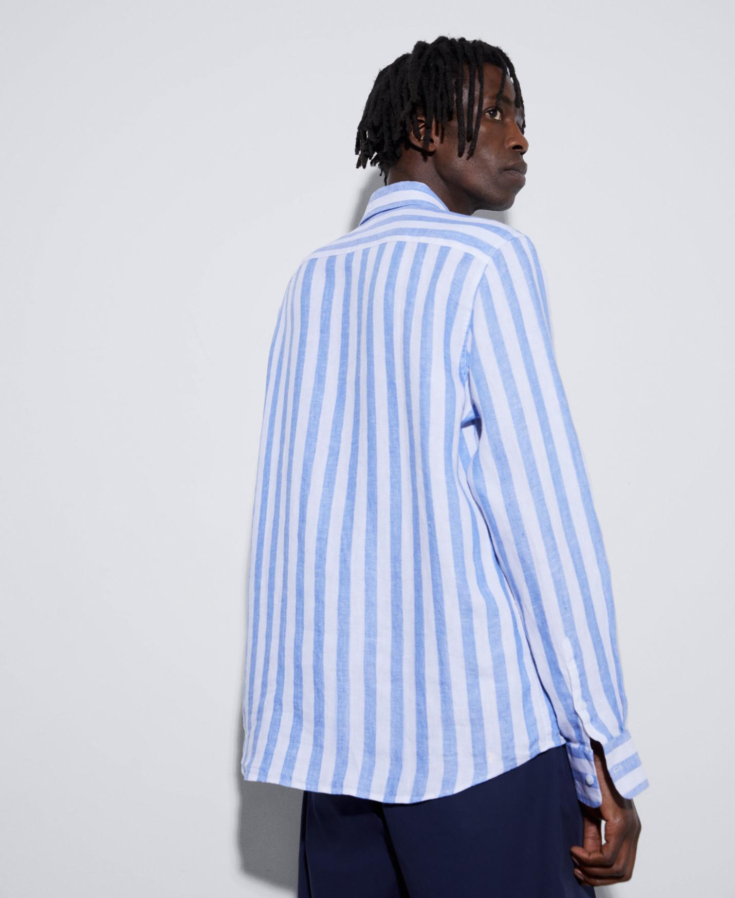 Camisa rayas cuello solapa en 100% lino. Botones bajo el cuello. Bajo redondeado.