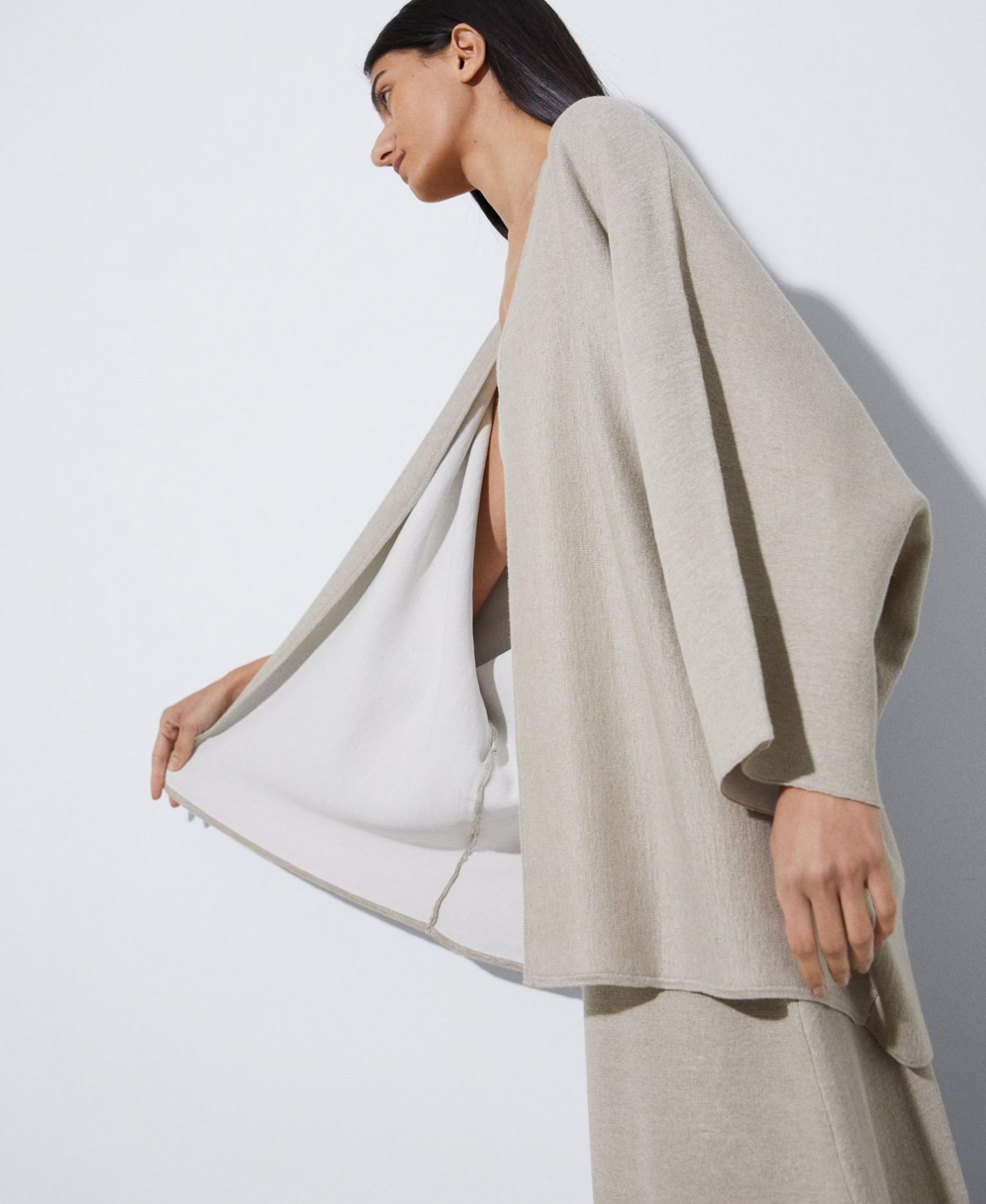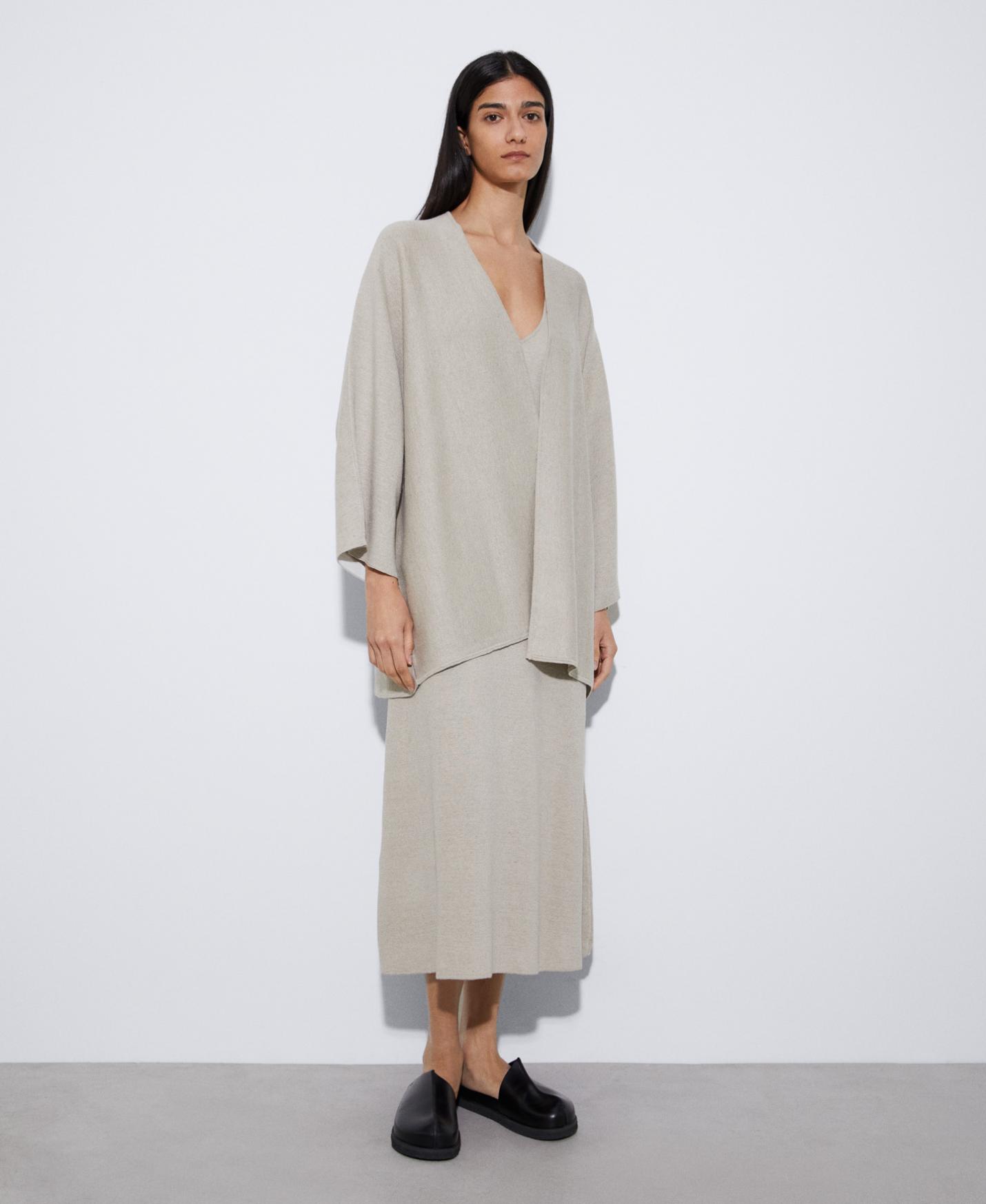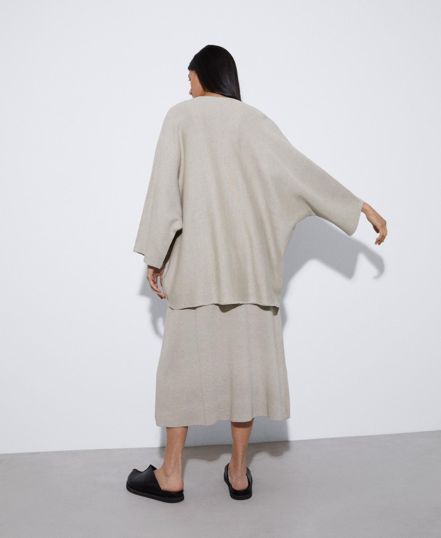 Chaqueta en punto de lino, nylon y viscosa. Tiene caída asimétrica, sin cierres y manga larga.