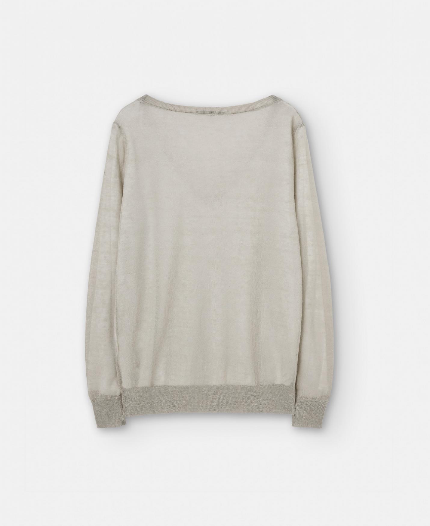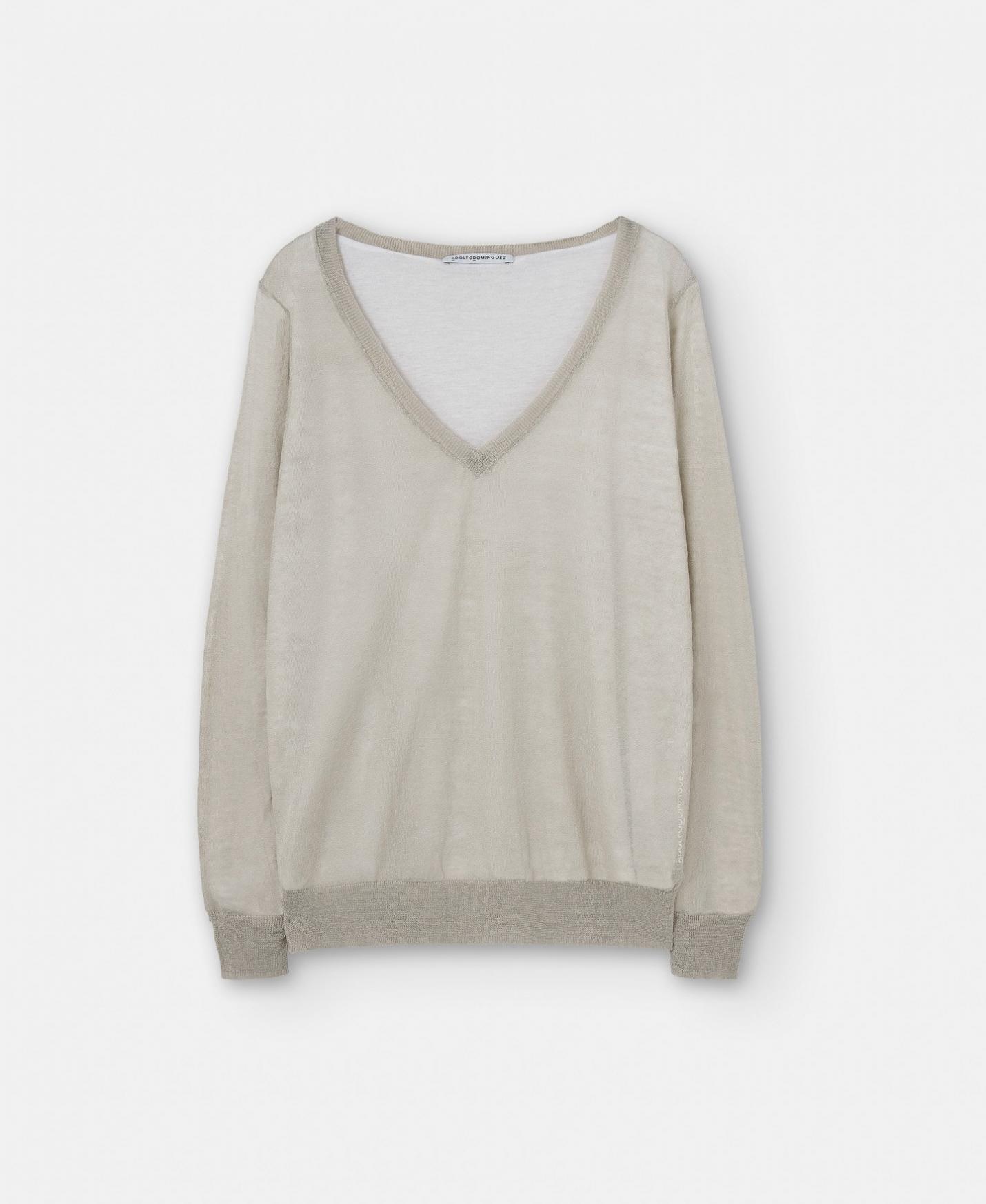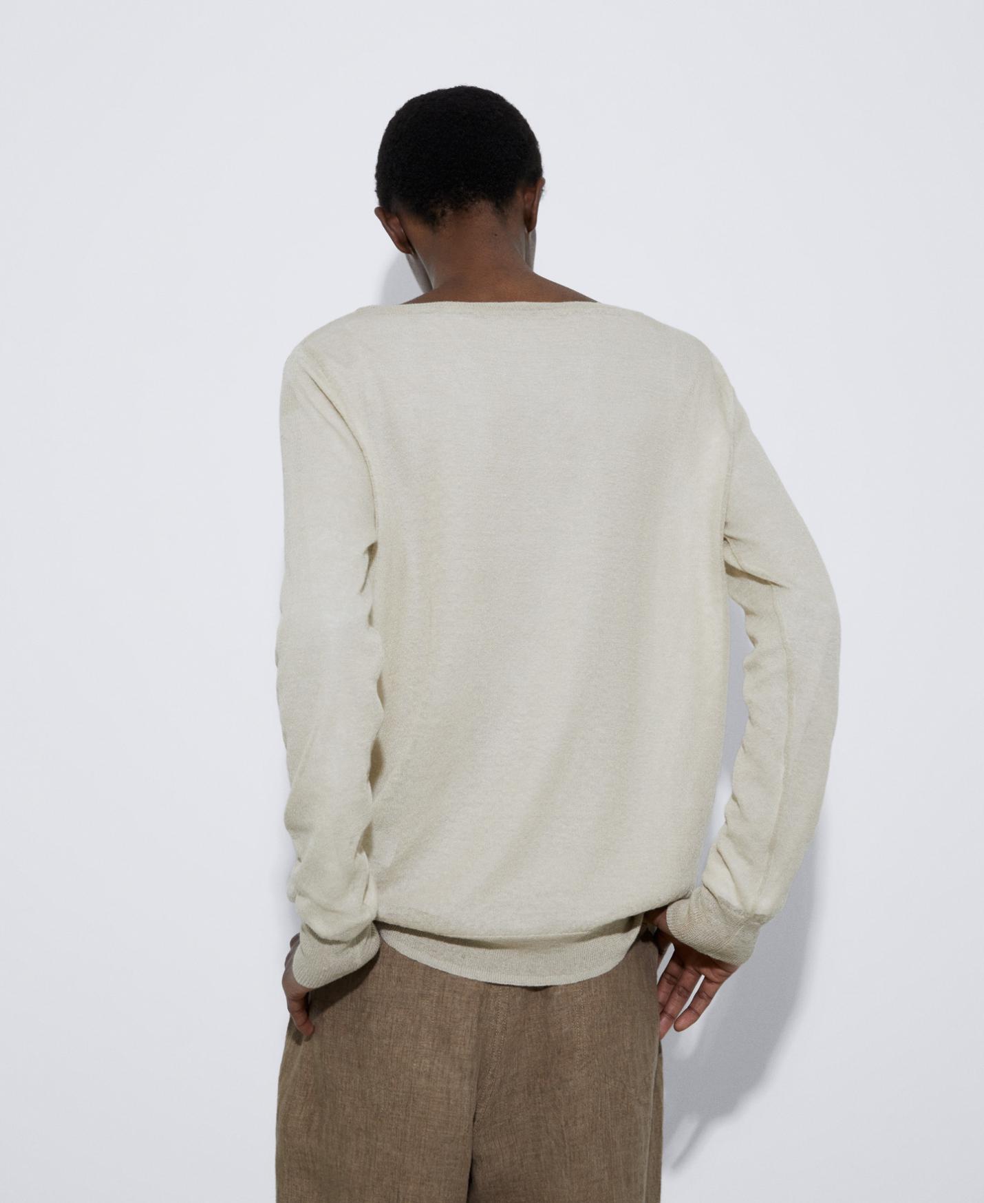 Jersey de punto fino en lino y nylon. Tiene forro interior, escote pico, manga larga y rib en puños y bajo.
