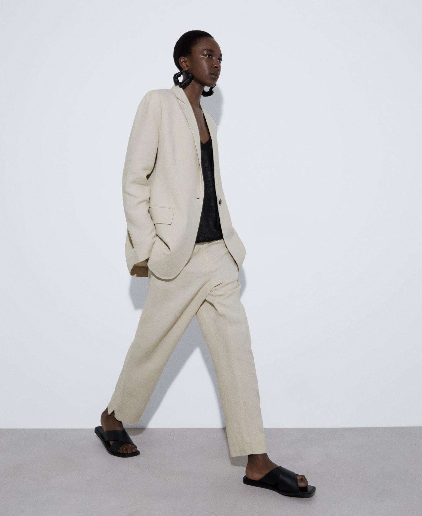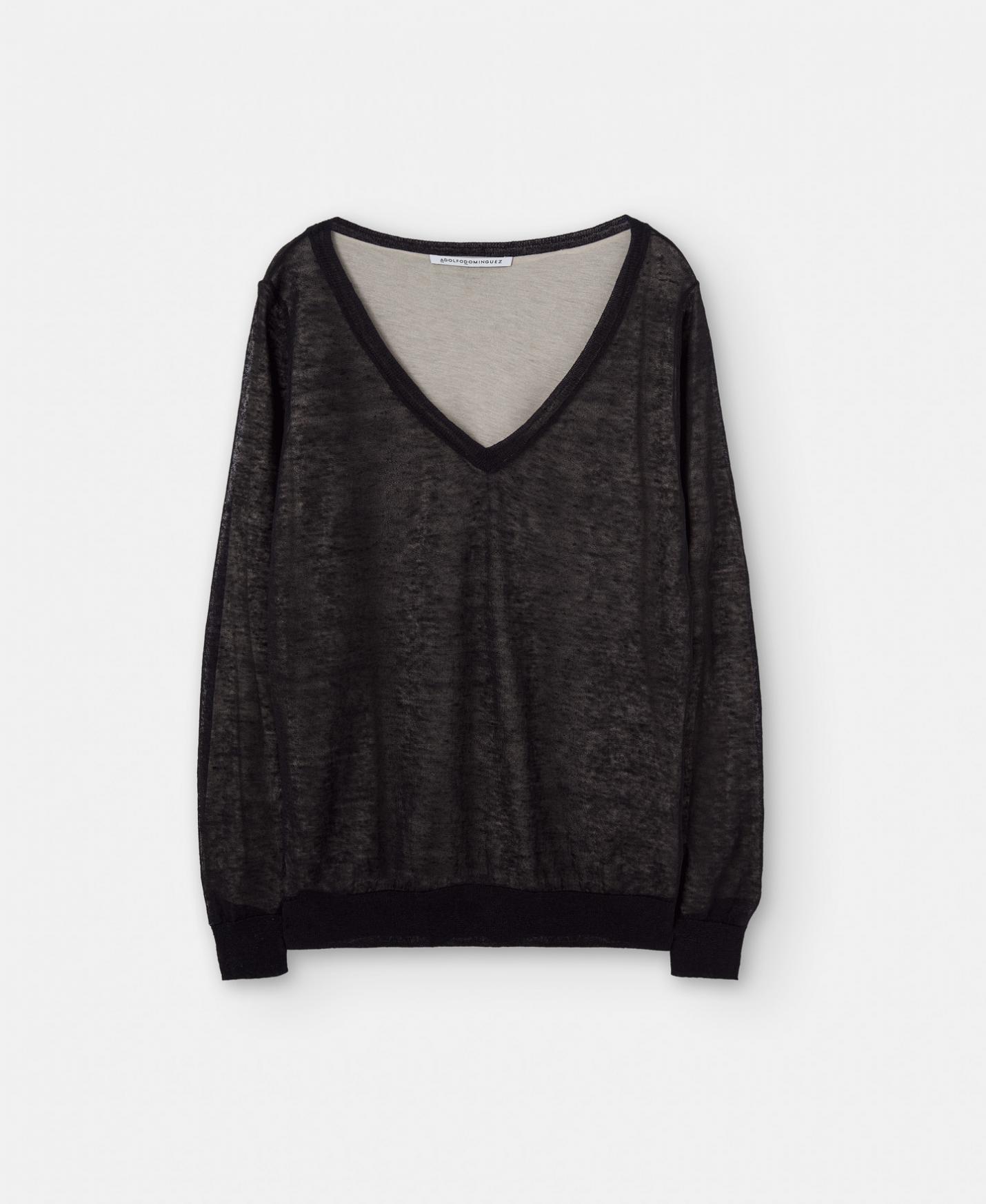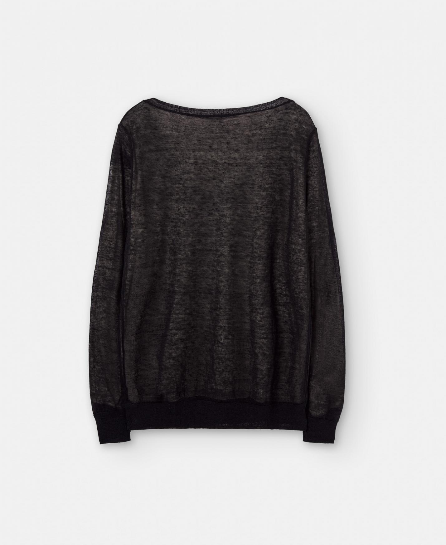 Jersey de punto fino en lino y nylon. Tiene forro interior, escote pico, manga larga y rib en puños y bajo.