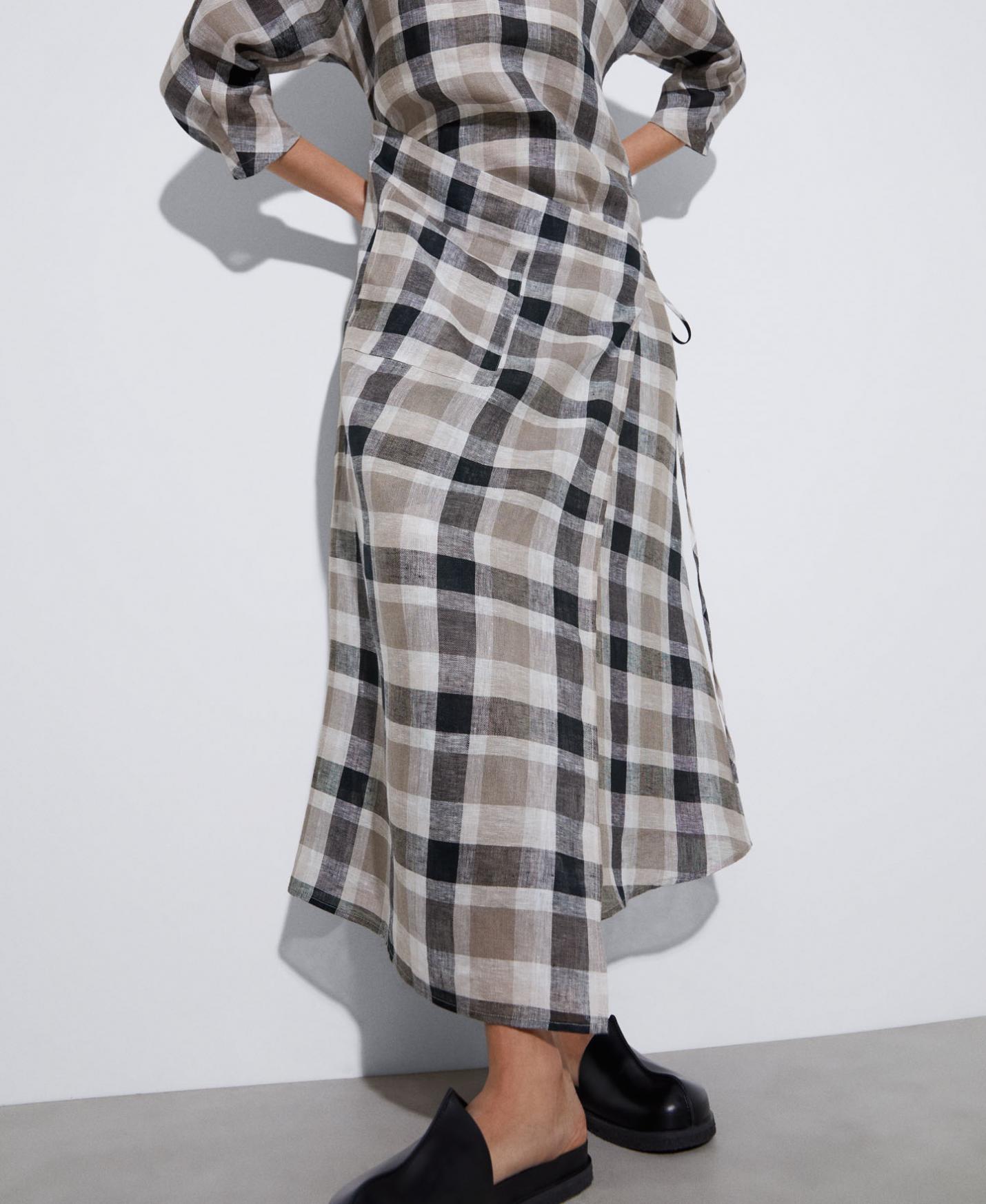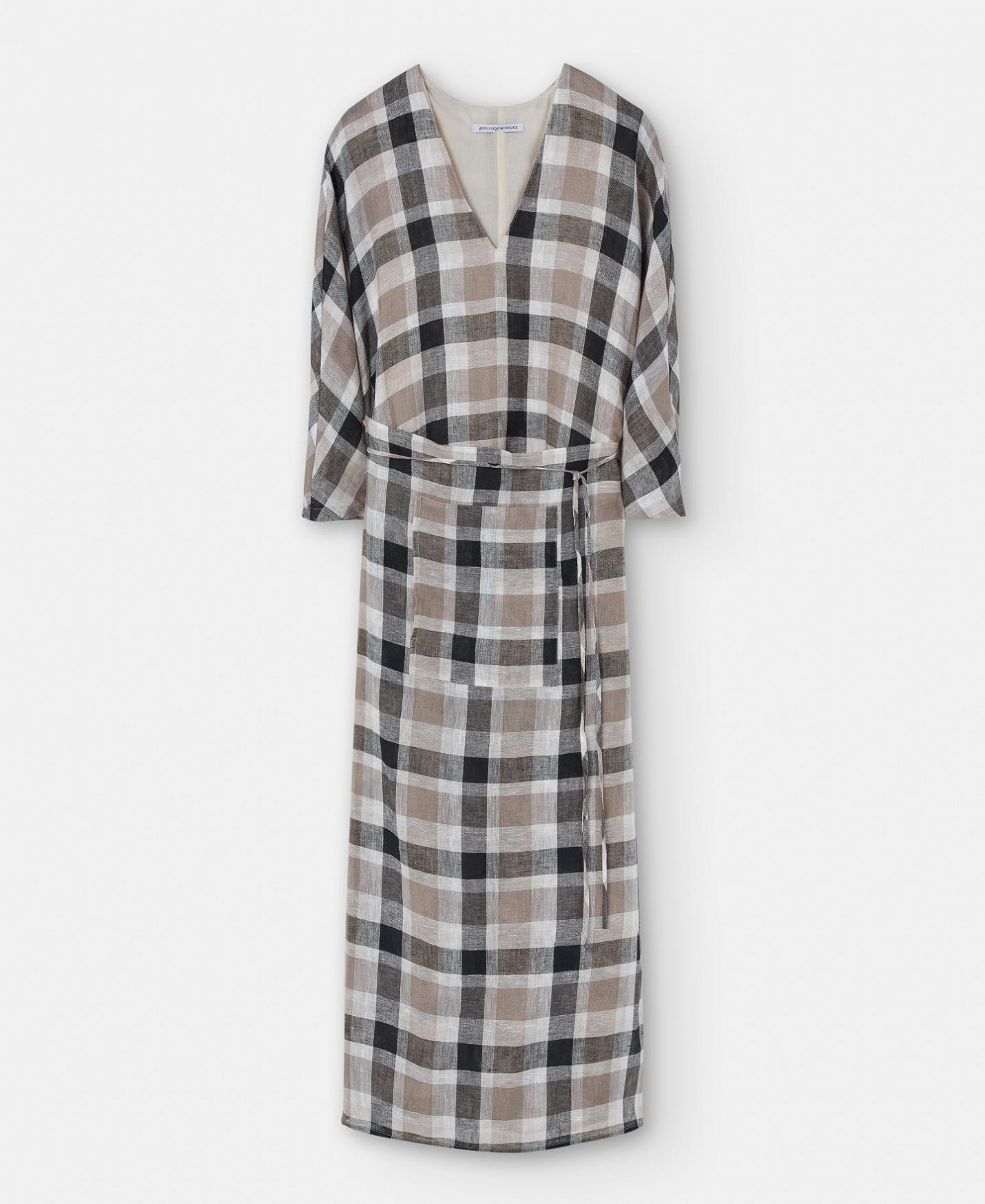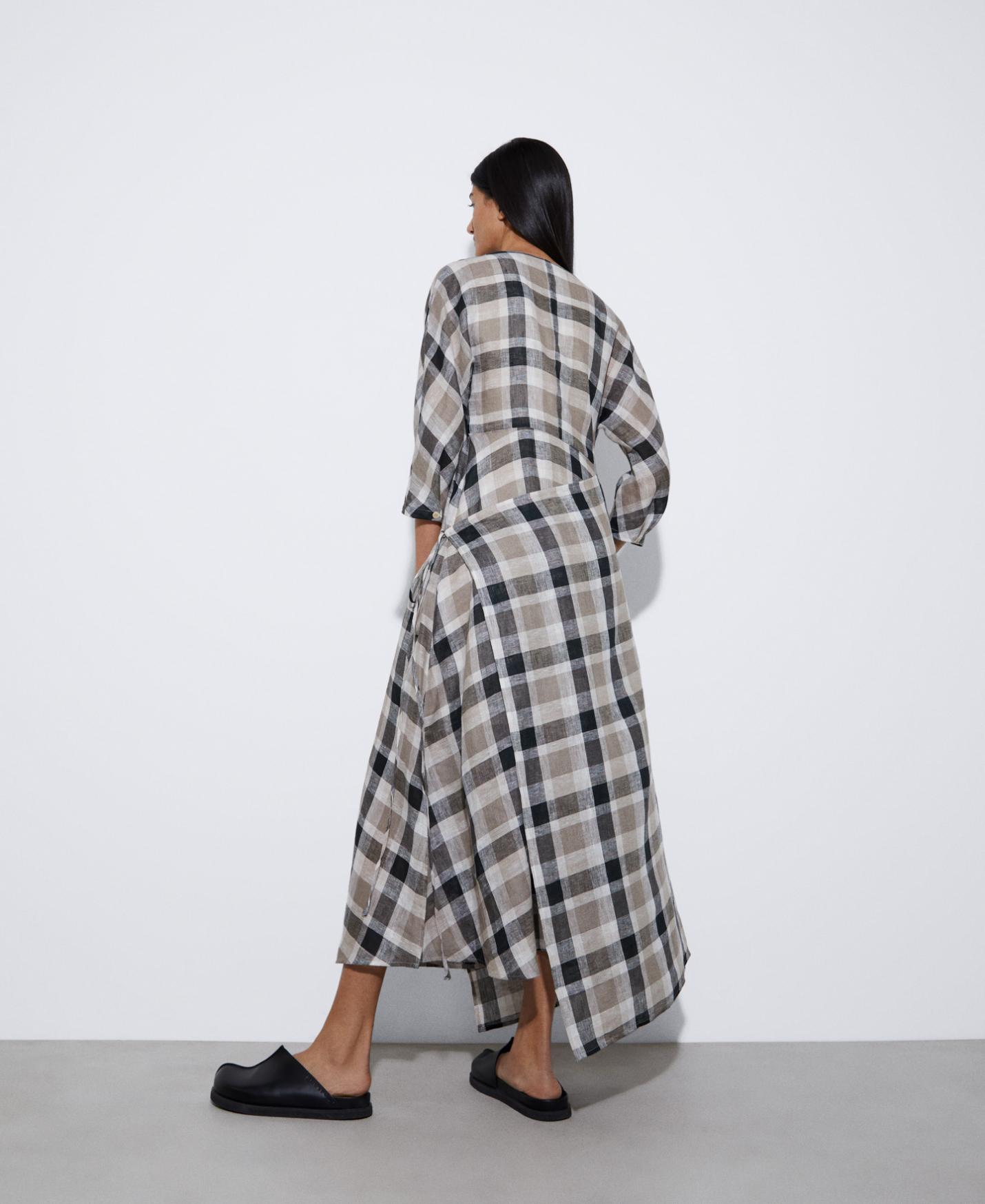 Vestido midi de cuadros en 100% lino. Tiene manga japonesa, escote pico y detalle de nudo en cintura.