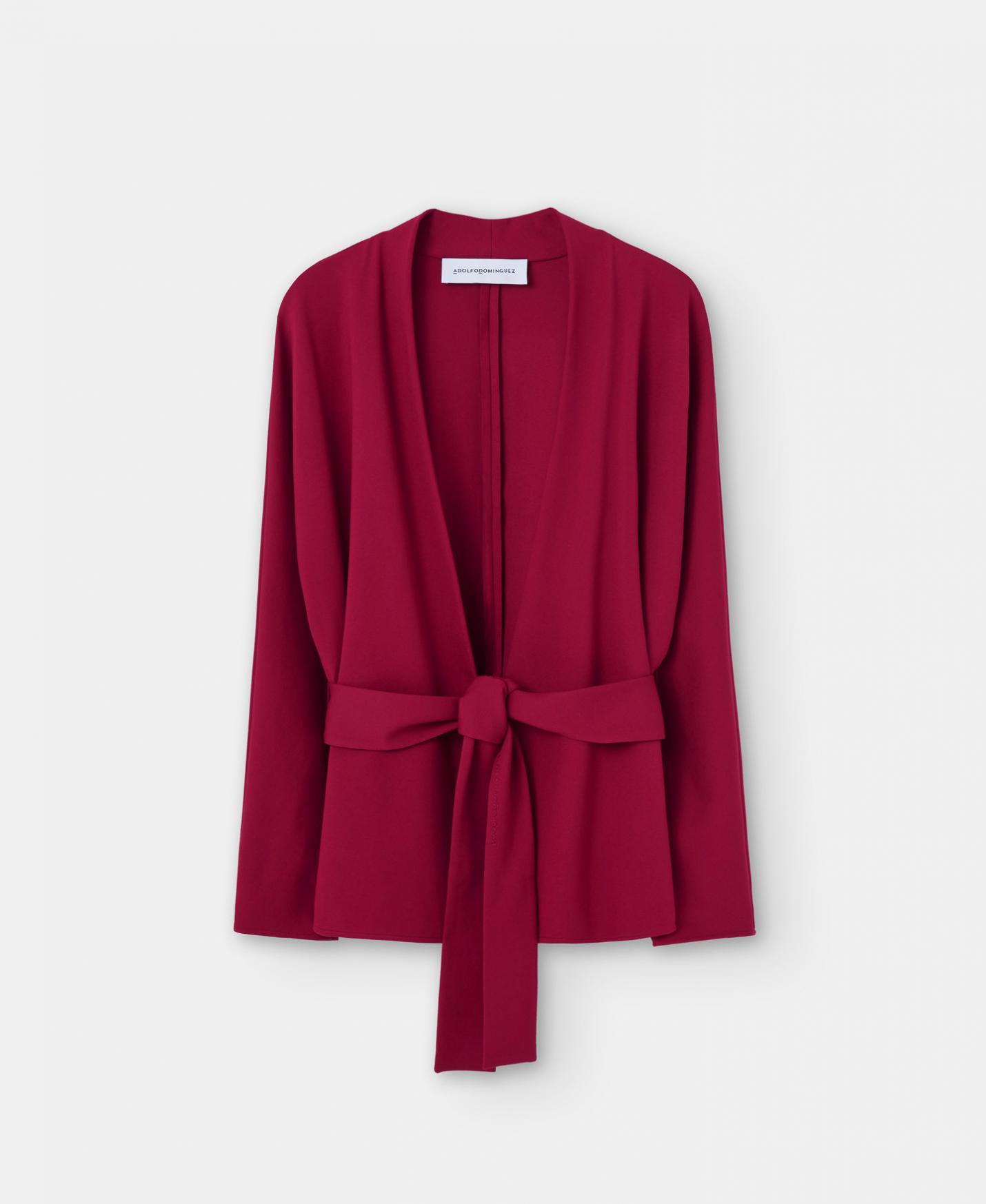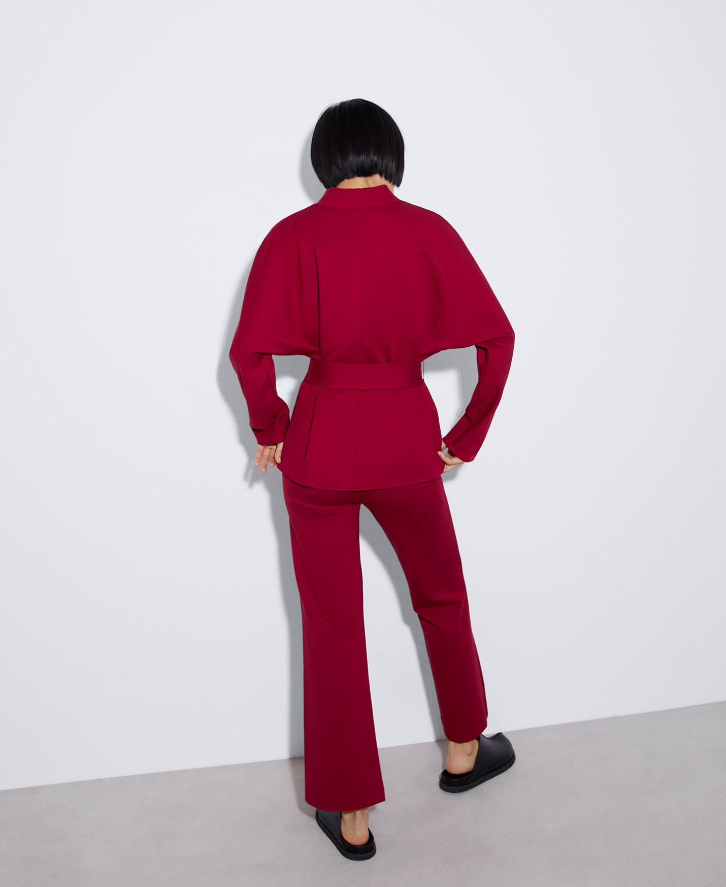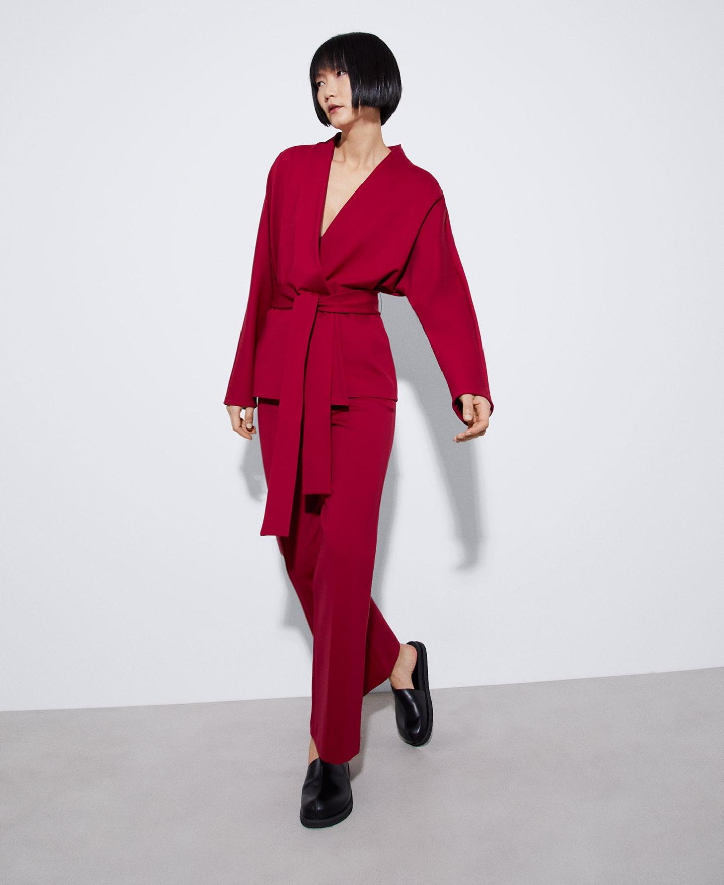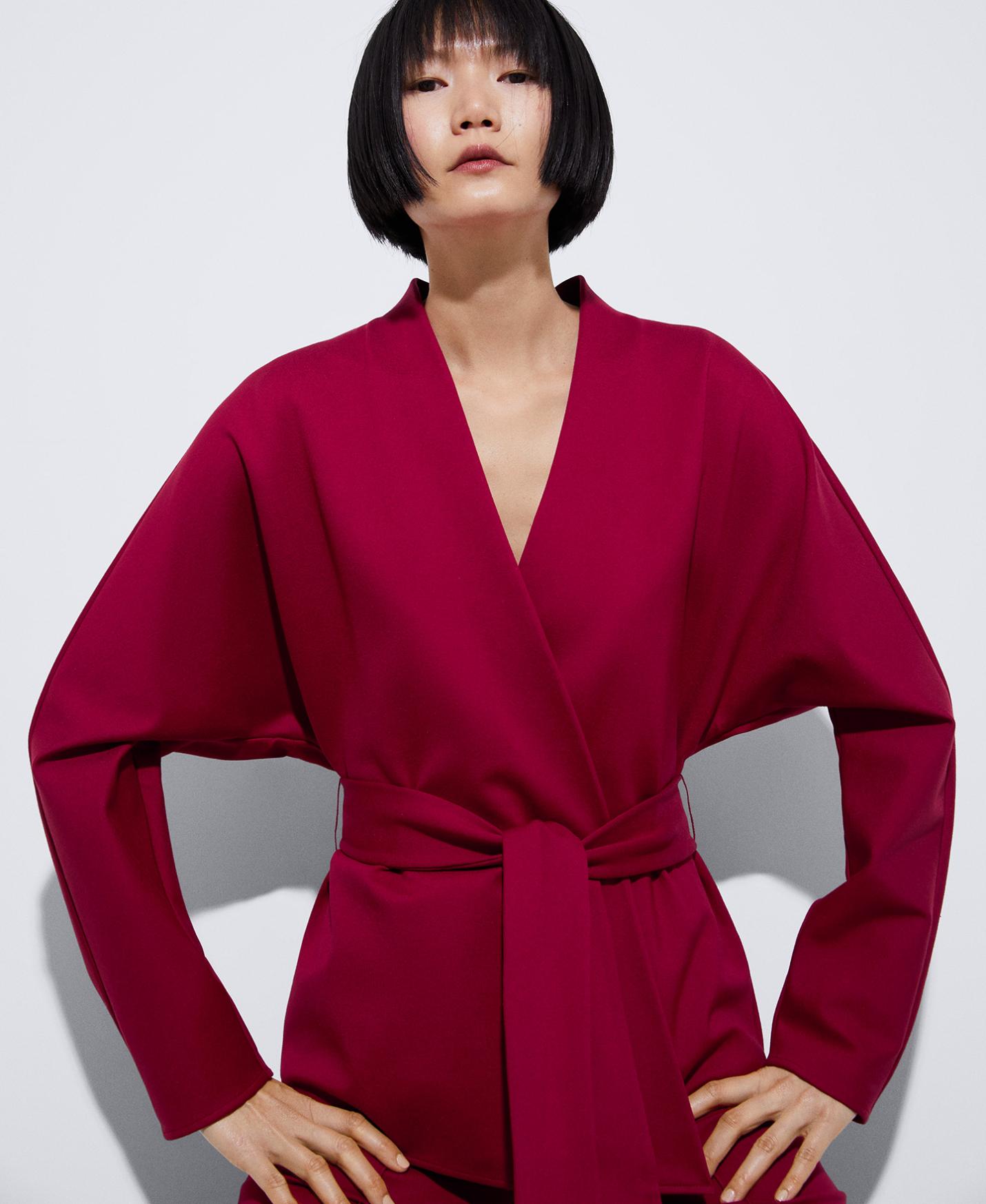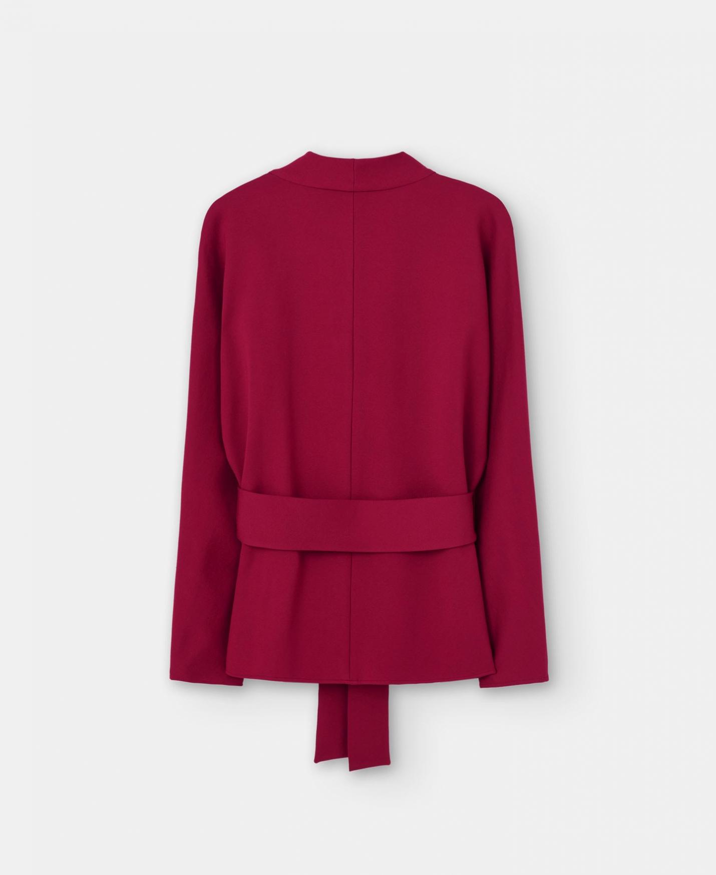Chaqueta en punto roma de viscosa responsable de Lenzing™. Tiene manga japonesa, cinturón y bajo asimétrico.