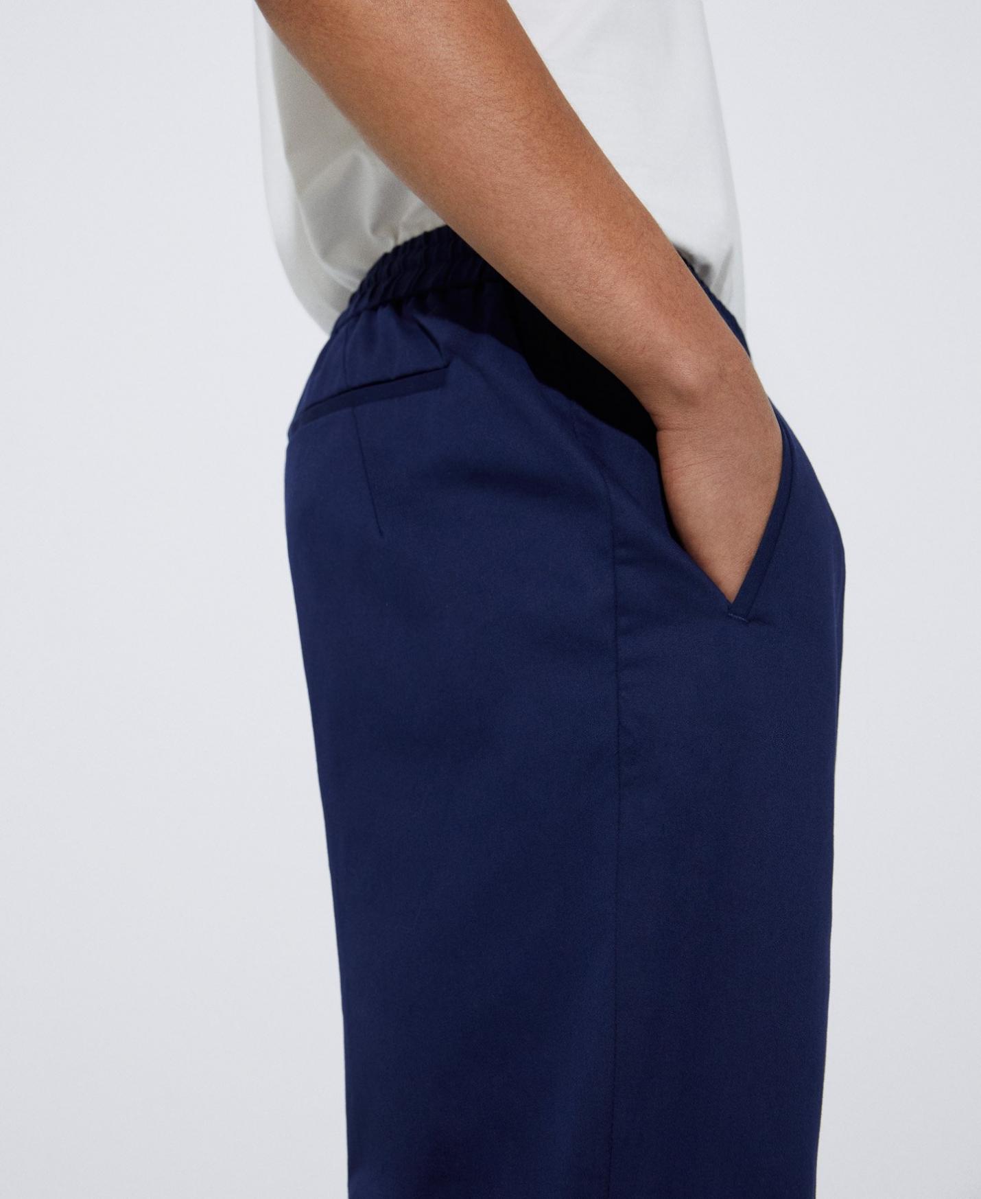 Pantalón en algodón y elastano. Tiene elástico en cintura y silueta zanahoria.