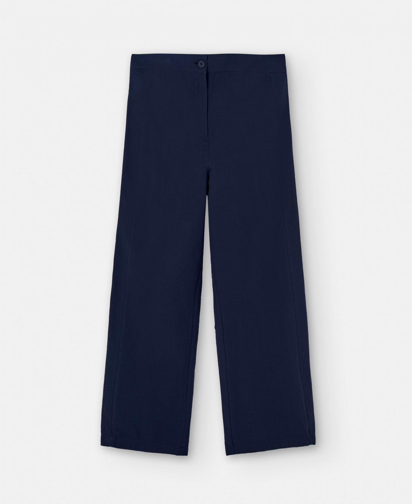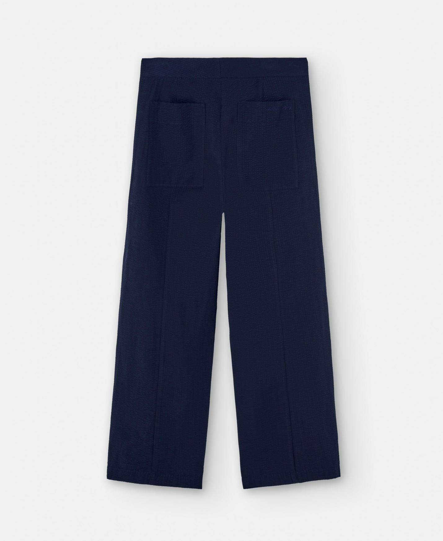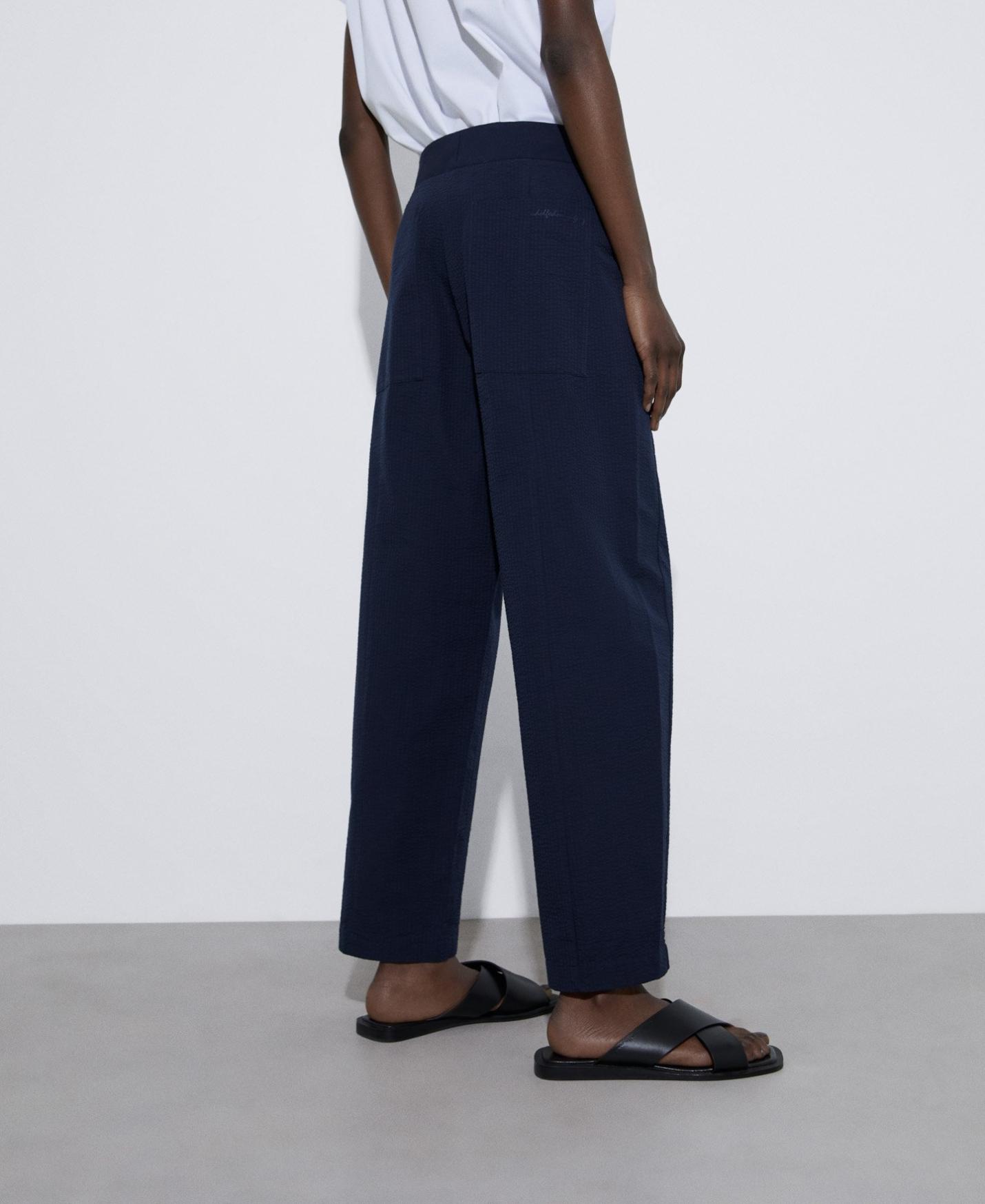 Pantalón zanahoria seersucker de algodón responsable. Bolsillos delanteros. Cierre botón y cremallera.