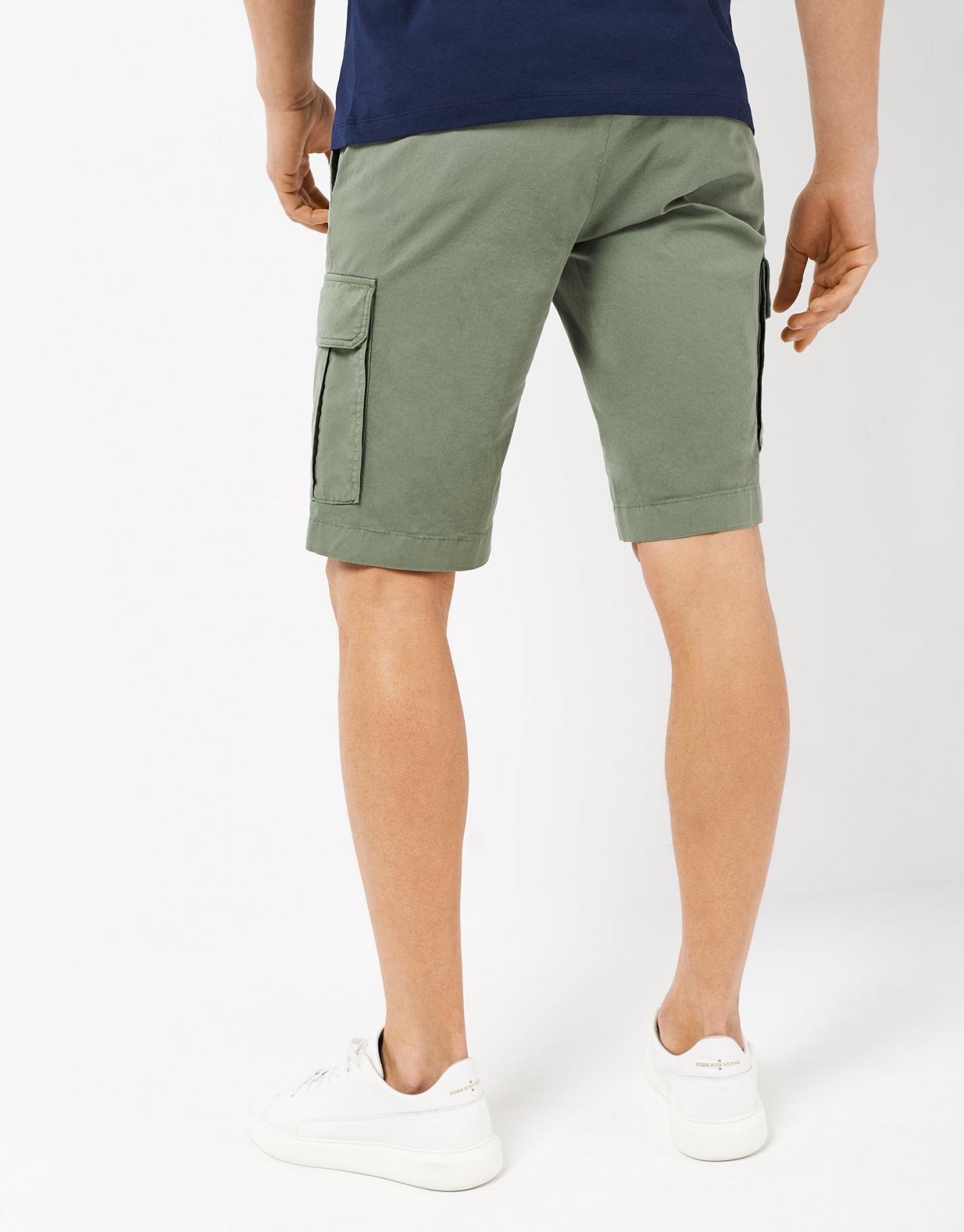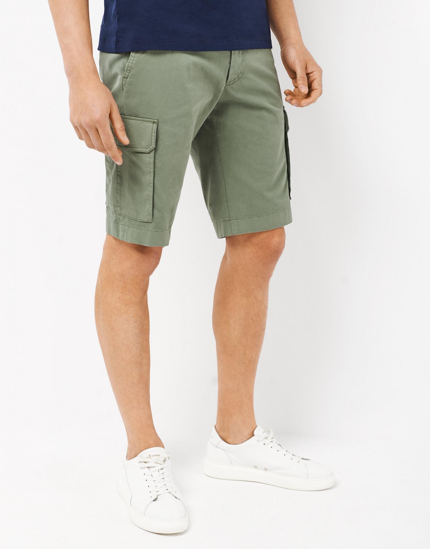 Pantalón bermuda tipo cargo confeccionado en un algodón tintado color verde caqui. Bolsillos francés y dos bolsillos de parche en laterales. Corte regular fit.