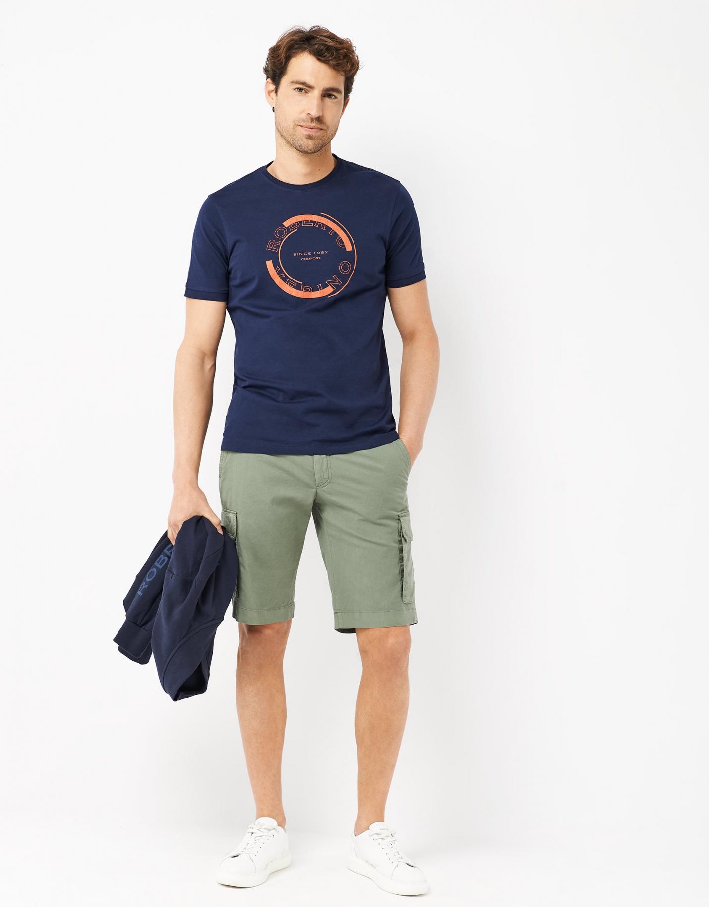 Pantalón bermuda tipo cargo confeccionado en un algodón tintado color verde caqui. Bolsillos francés y dos bolsillos de parche en laterales. Corte regular fit. …