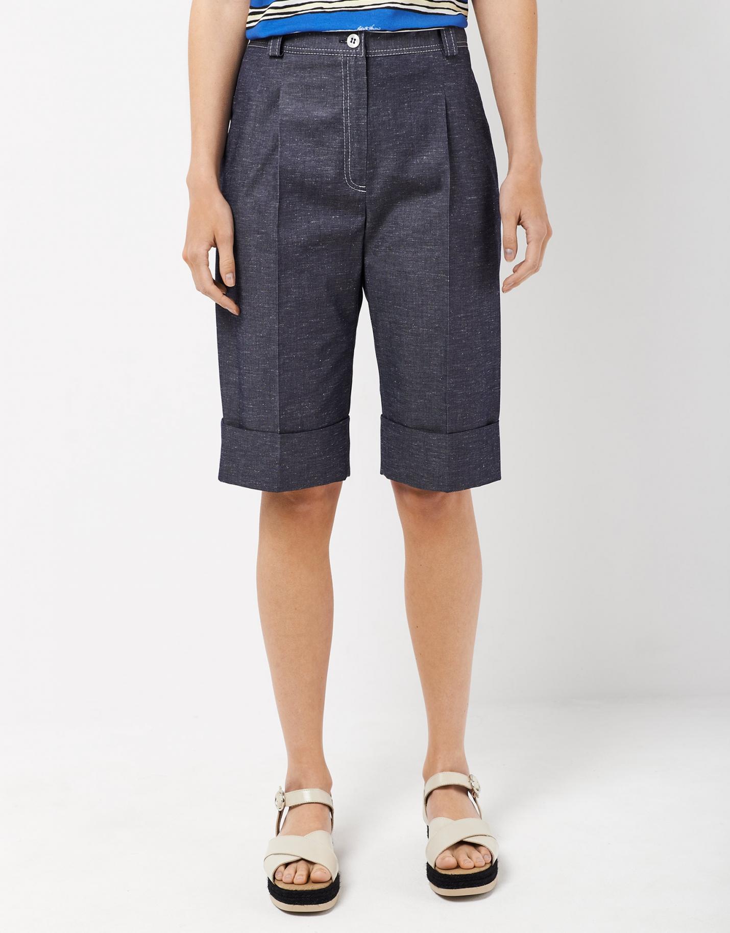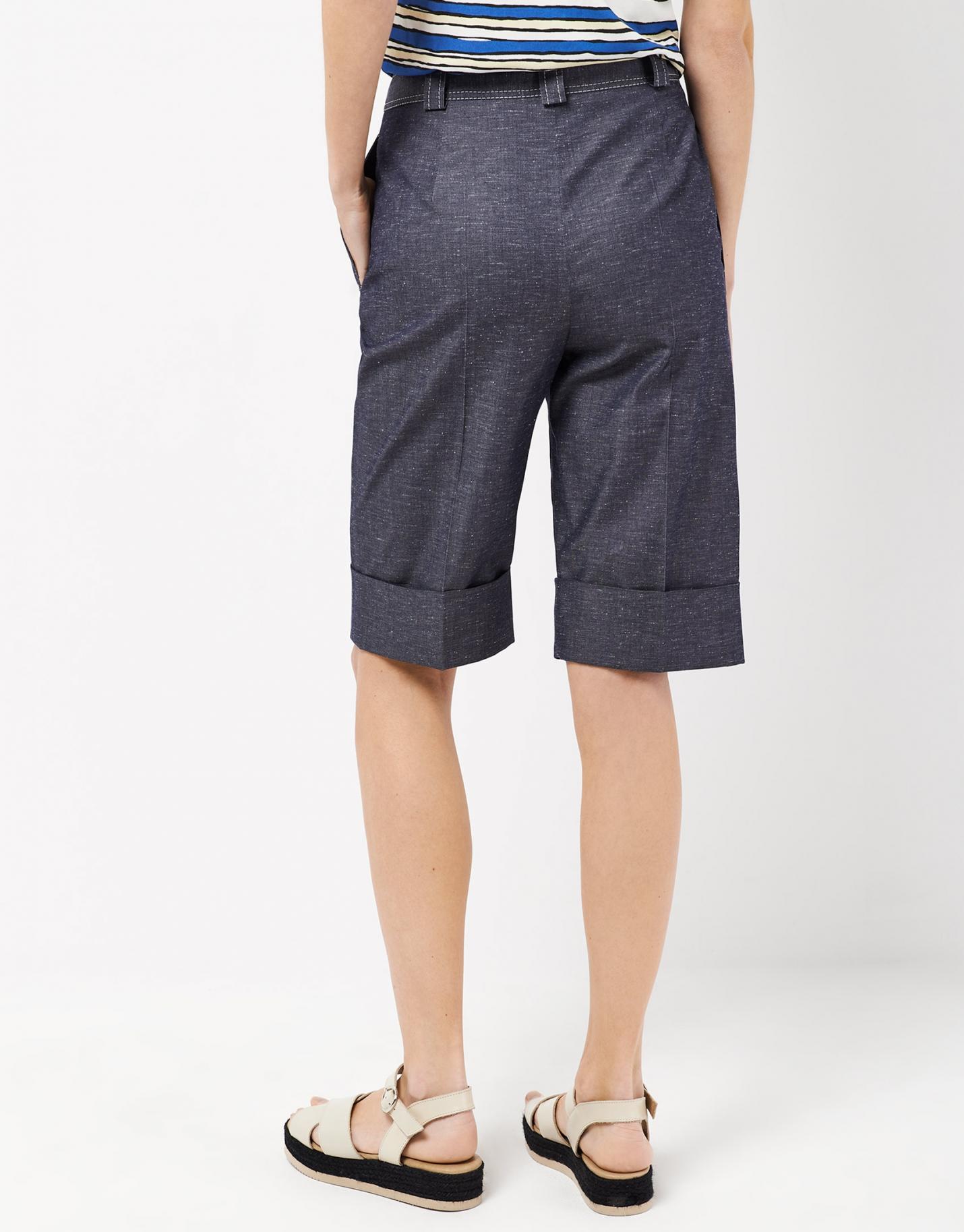 Pantalón bermuda confeccionada en un tejido estilo jean azul jaspeado con trabillas en cintura, pinzas en delantero y cierre de botón. Dos bolsillos laterales y bajo con vuelta.