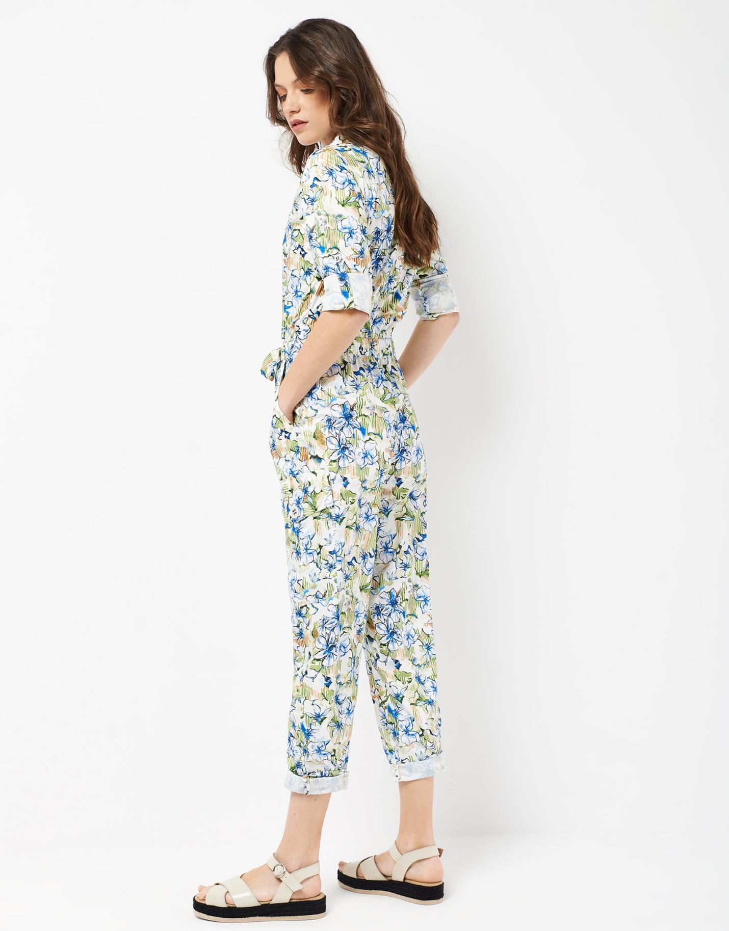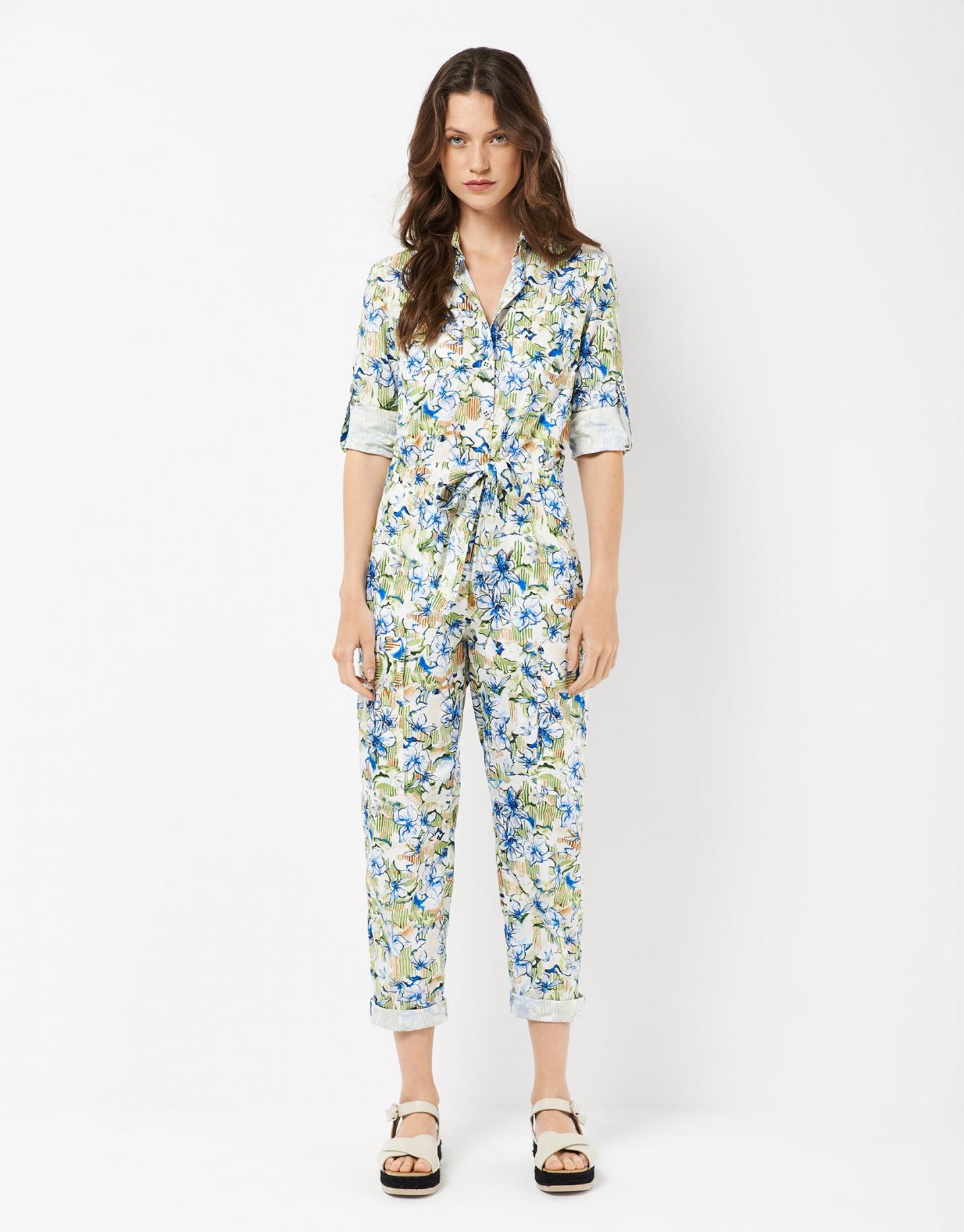 Mono largo confeccionado en un tejido estampado floral en tonos amarillos y azules. Cuello camisero, dos bolsillos de plastrón en pecho, cierre con botones y tapeta en pecho y manga larga ajustable rematada con puño. Pantalón largo con goma en cintura, dos bolsillos cargo de solapa en laterales y bajo recogido con vuelta.