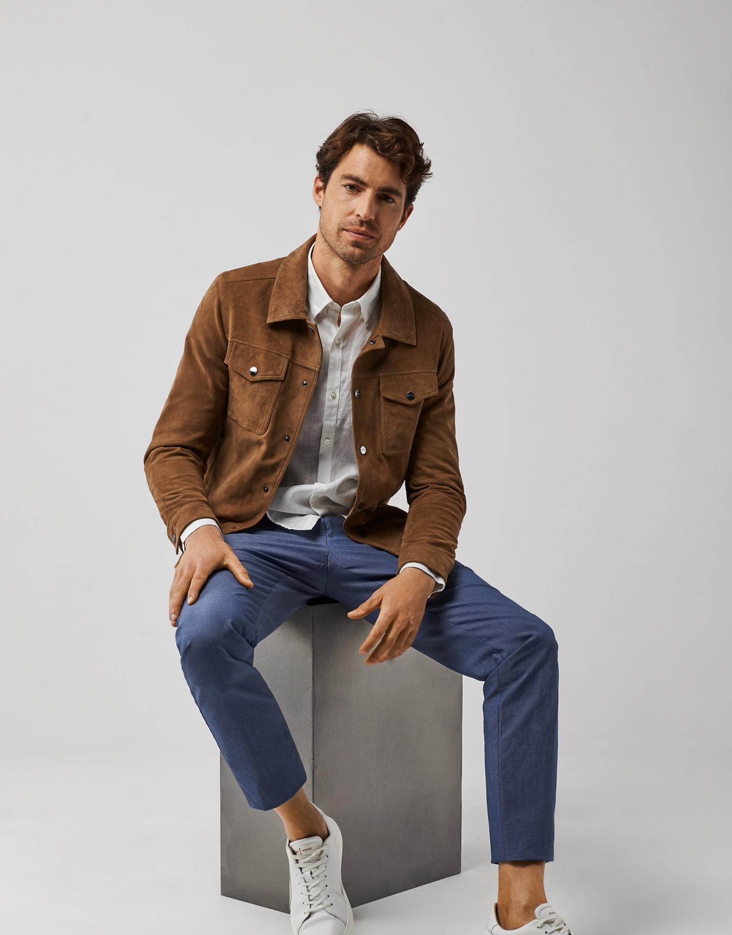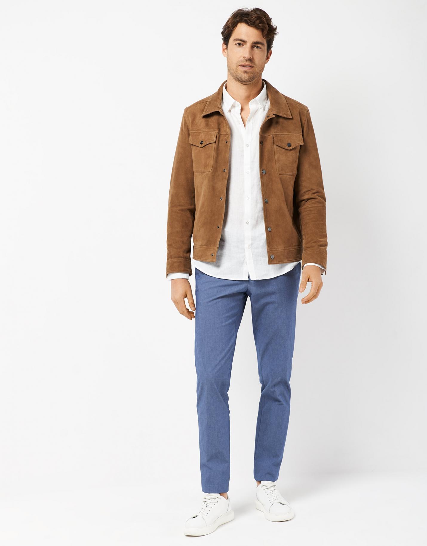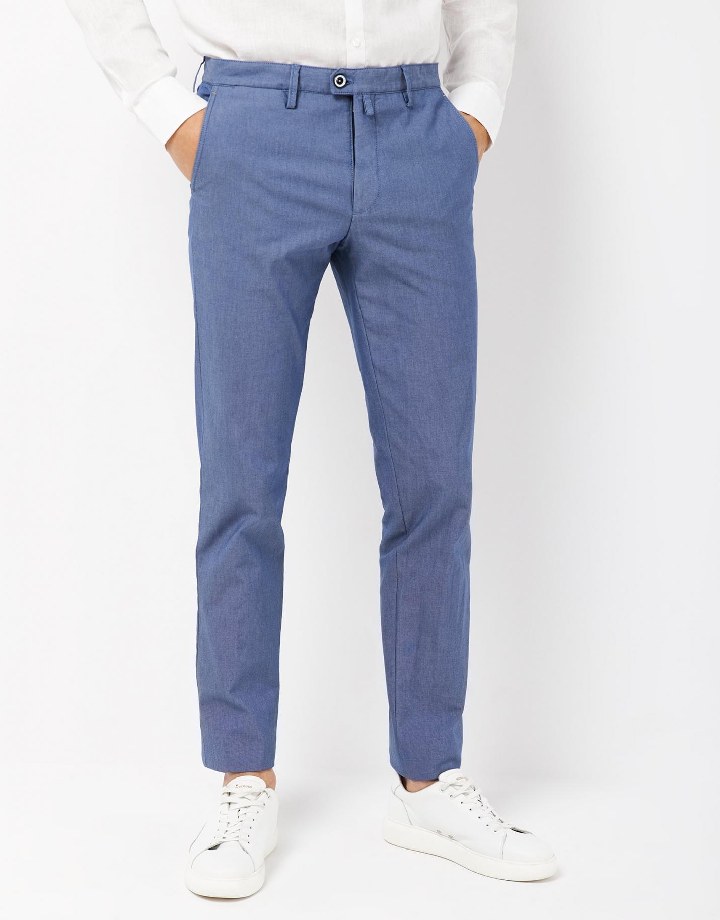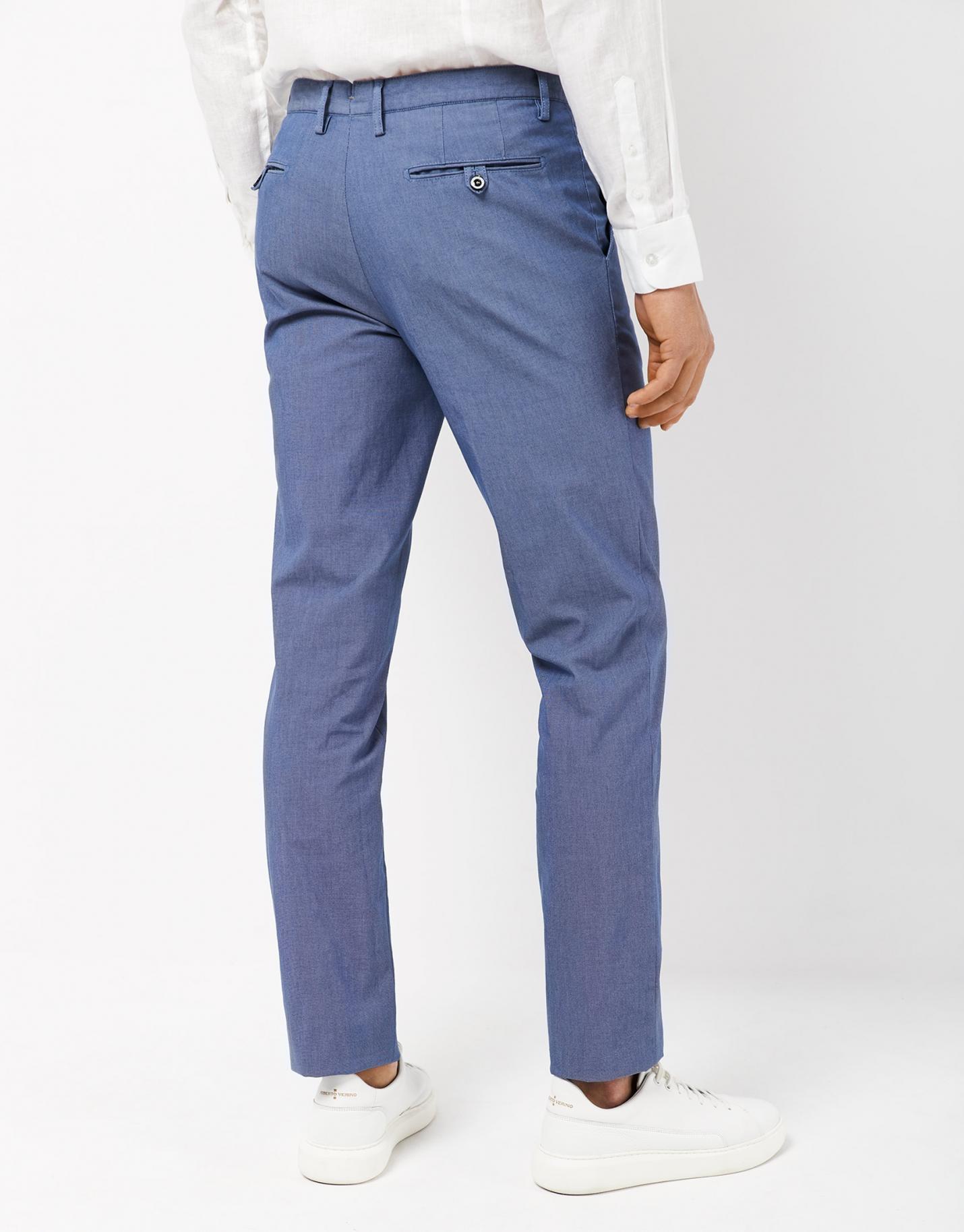 Pantalón chino regular fit confeccionado en un tejido de algodón con estructura color azul. Bolsillos franceses en el delantero y de vivo con trabilla y botón en la espalda.