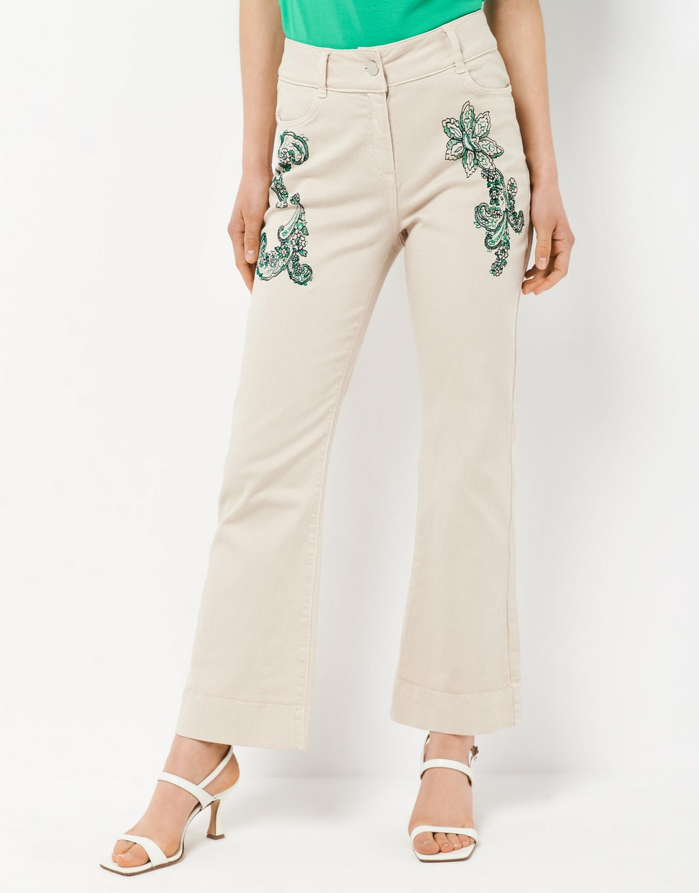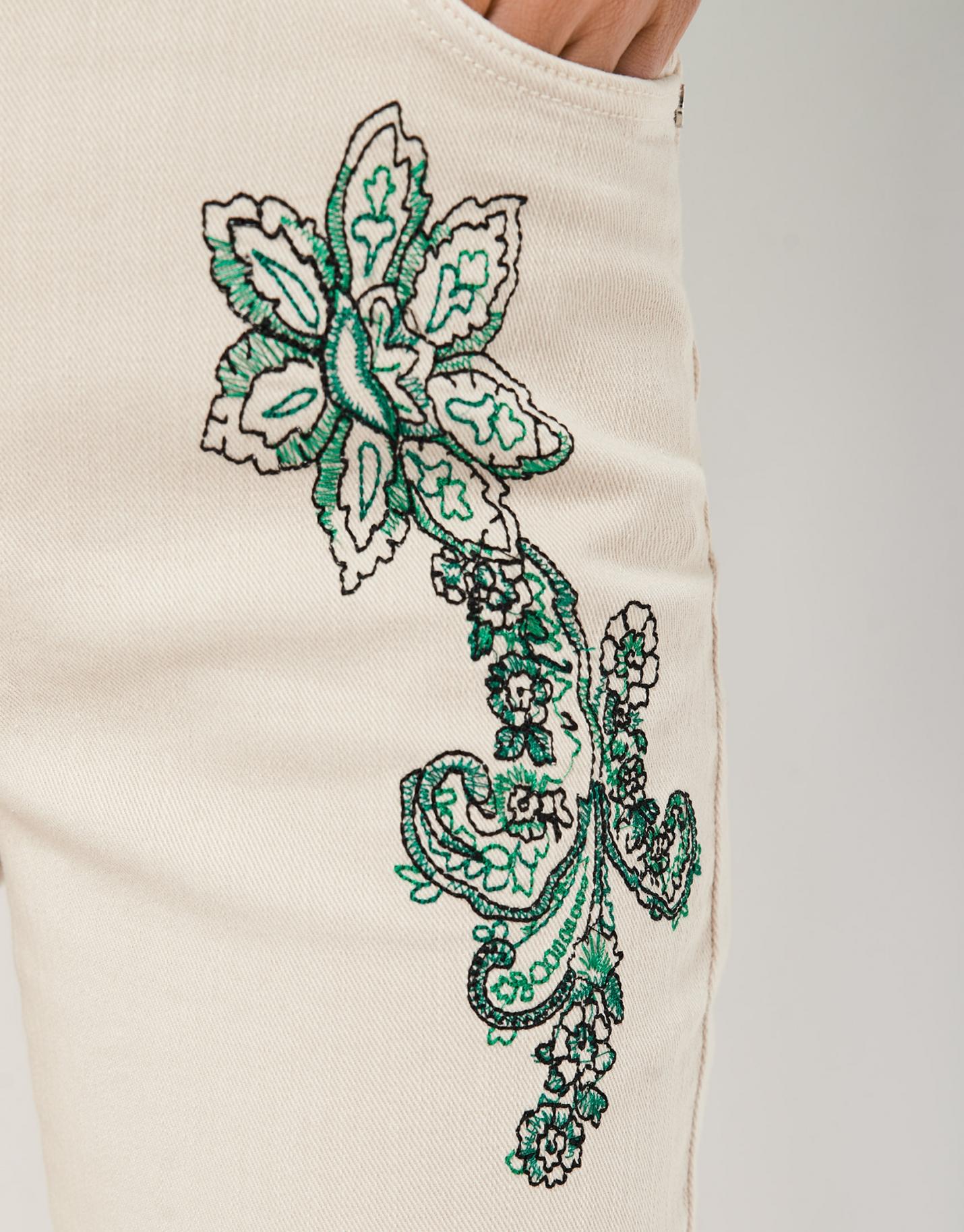 Pantalón recto confeccionado en un tejido vaquero color beige claro con bordado floral en tonos verdes debajo de los bolsillos delanteros. Cintura con trabillas, bajo pespunteado y dos bolsillos de plastrón en espalda.