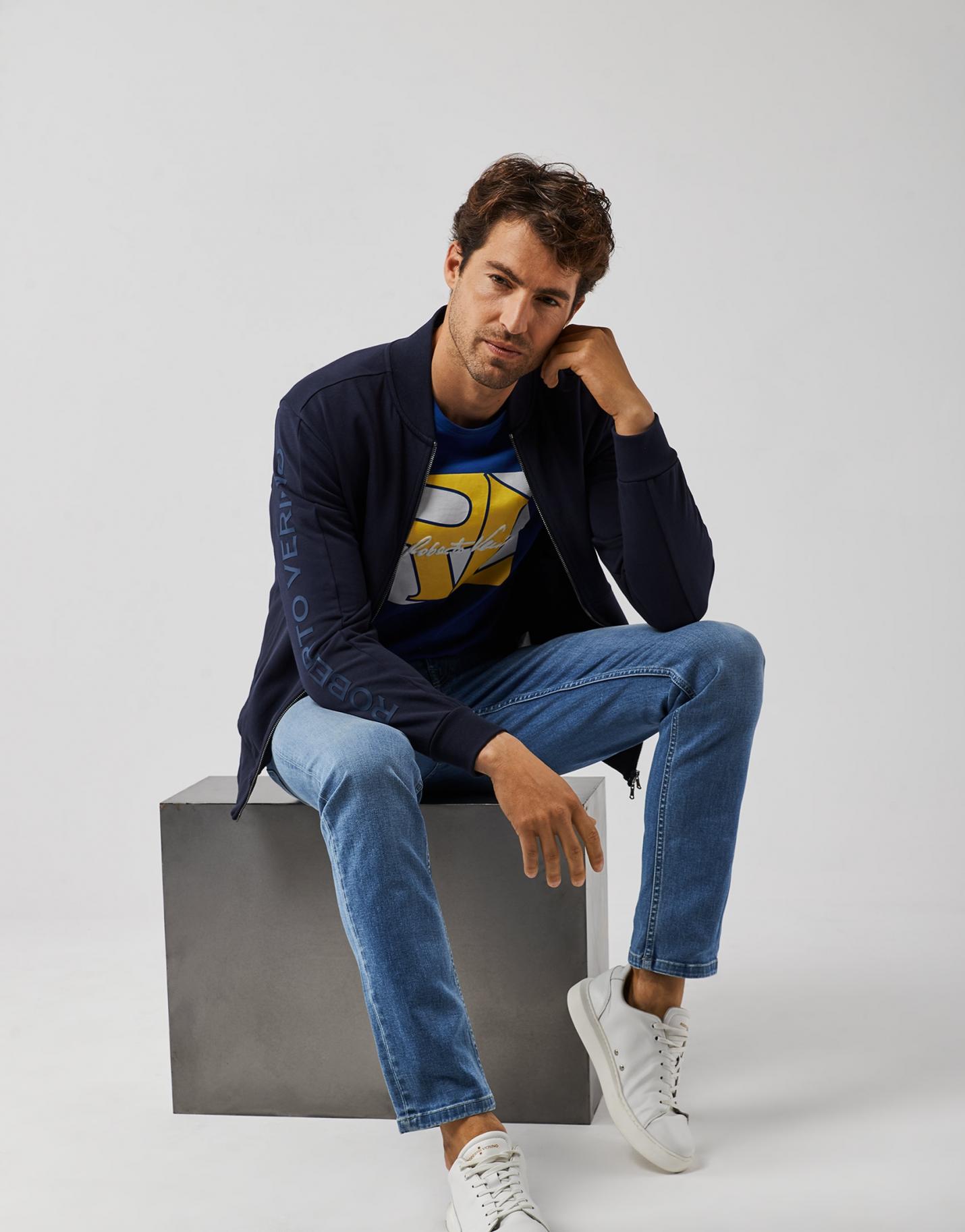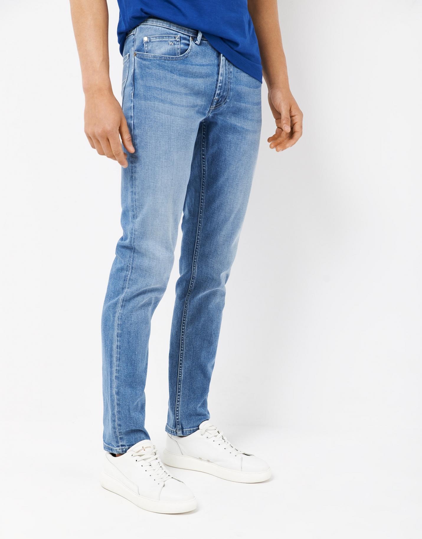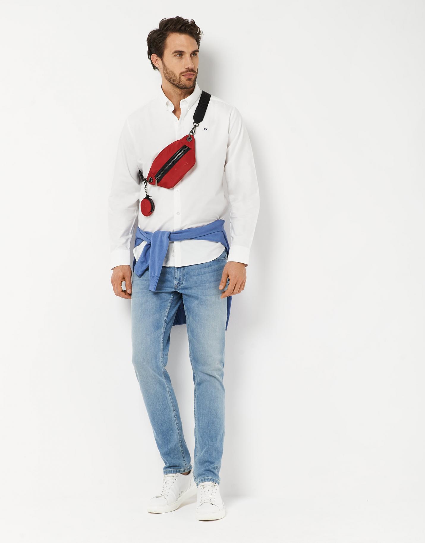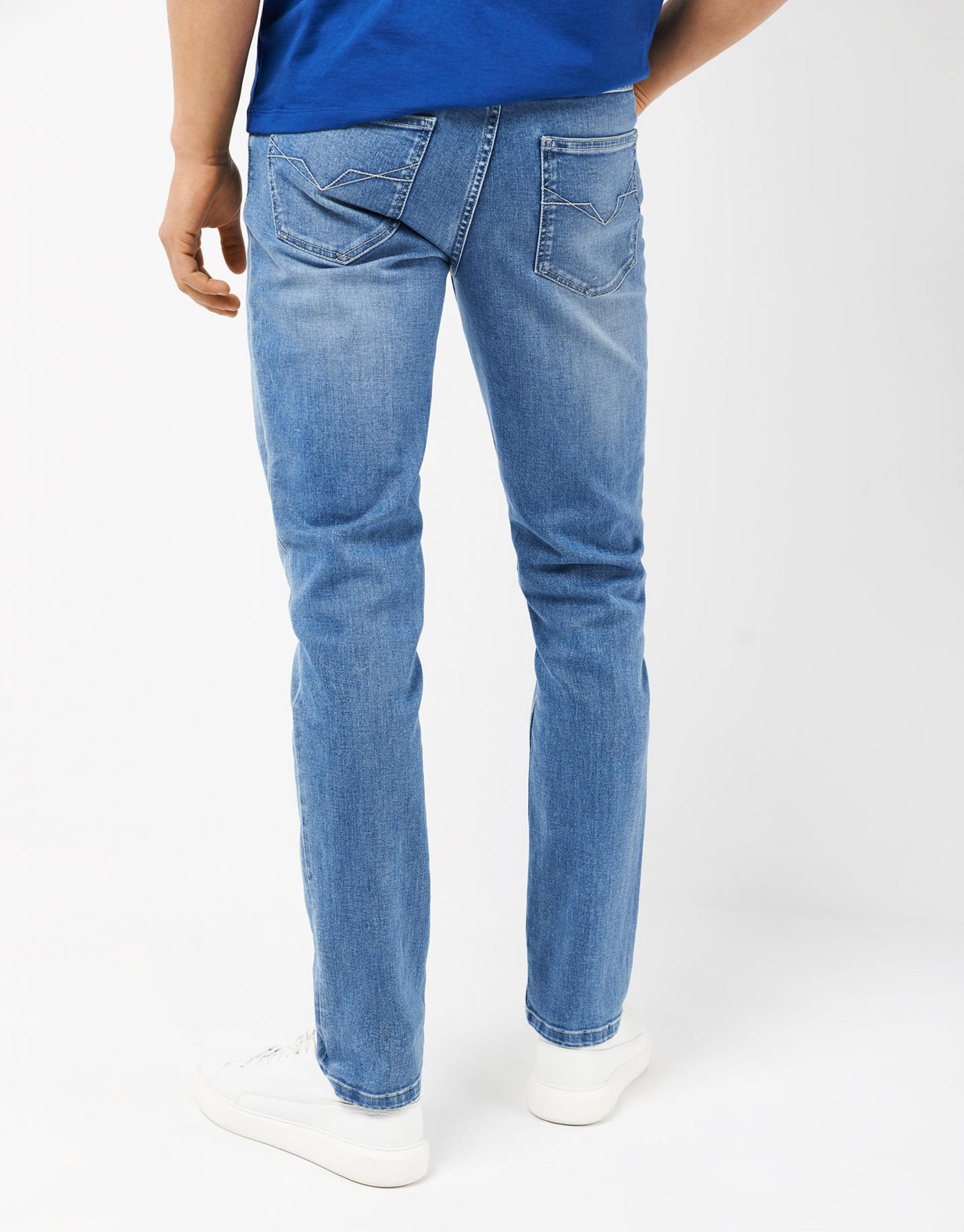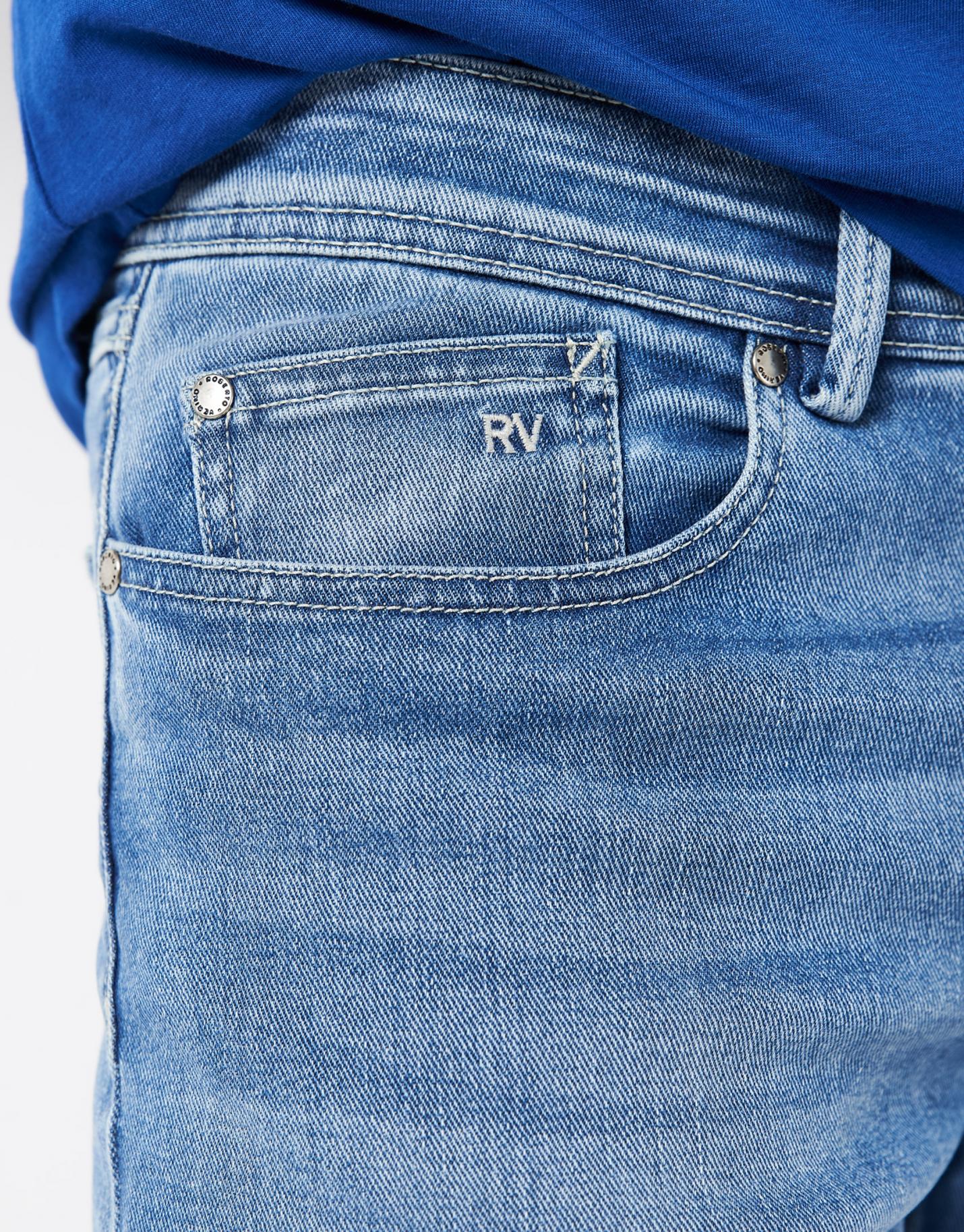 Pantalón vaquero de corte slim confeccionado en un algodón ligeramente elástico color azul claro con acabado blanqueado. Bordado personalizado RV en bolsillo relojero.