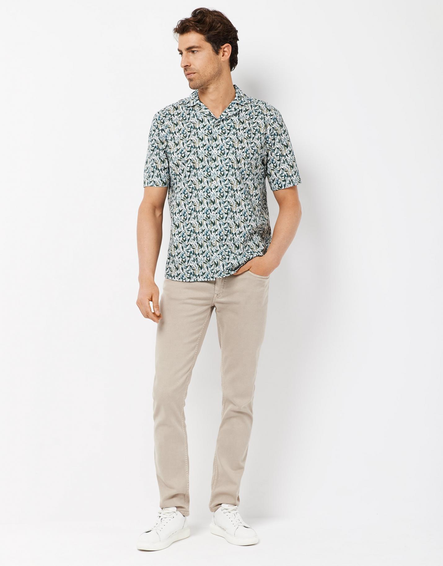 Pantalón cinco bolsillos de corte vaquero confeccionado en una sarga de algodón ligeramente elástico color arena y acabado old dye. Corte regular fit. …
