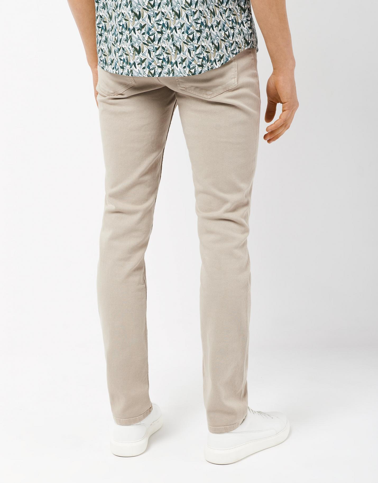 Pantalón cinco bolsillos de corte vaquero confeccionado en una sarga de algodón ligeramente elástico color arena y acabado old dye. Corte regular fit.