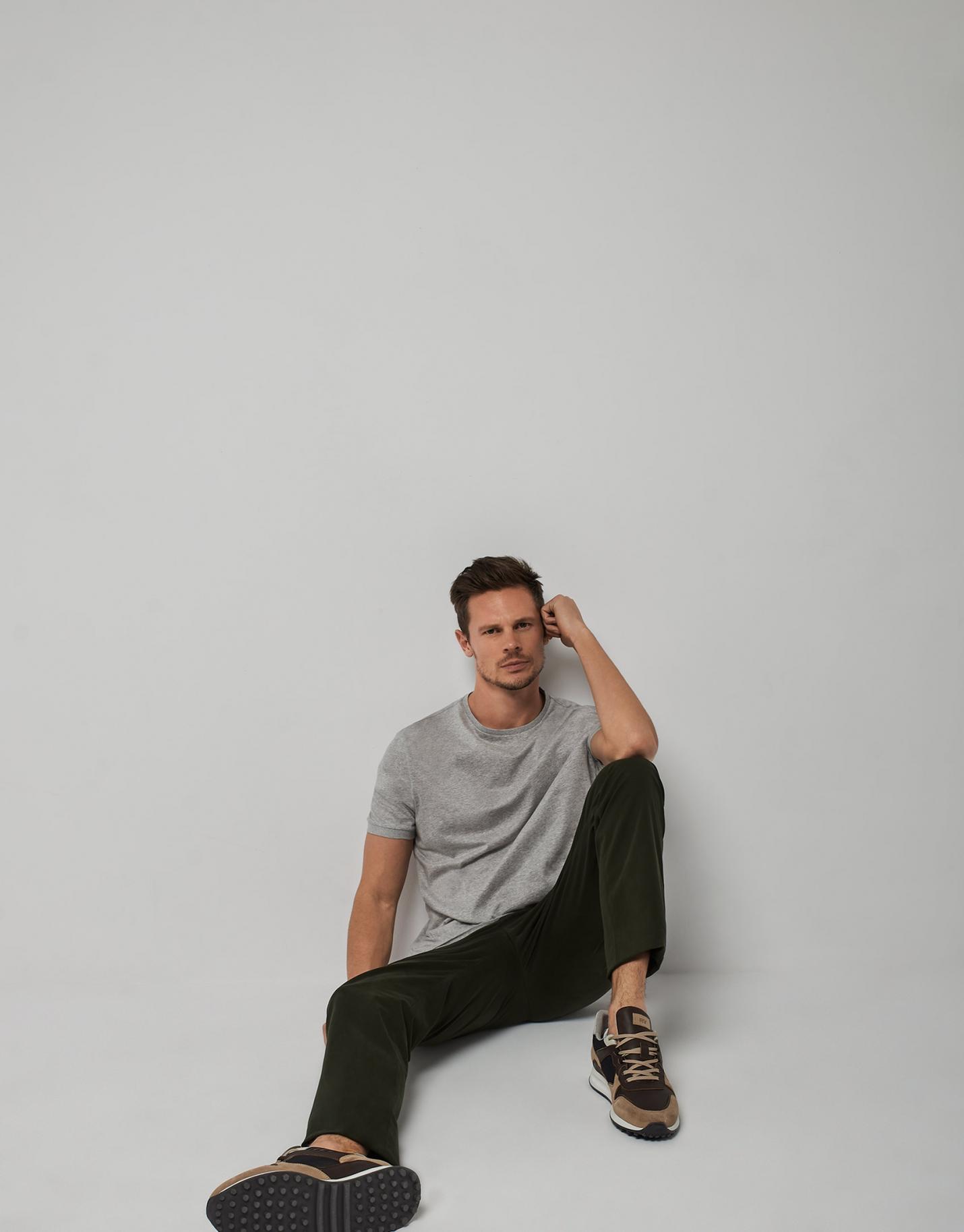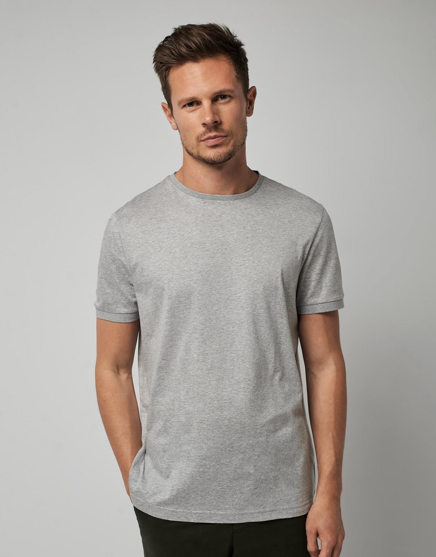Camiseta de manga corta confeccionada en un algodón liso doble mercerizado color gris melange. Escote redondo y l…
