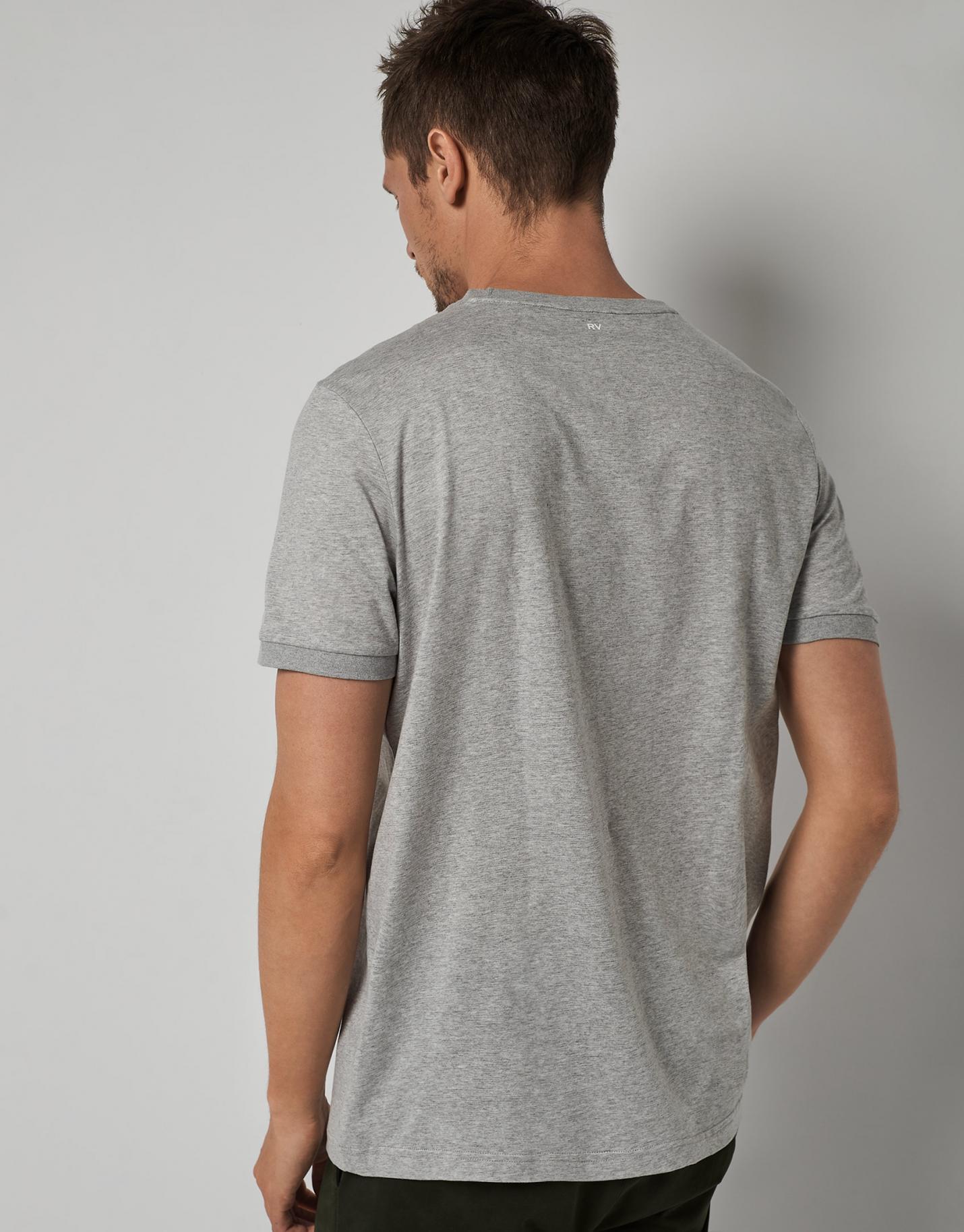 Camiseta de manga corta confeccionada en un algodón liso doble mercerizado color gris melange. Escote redondo y logo impreso en bajo cuello espalda.