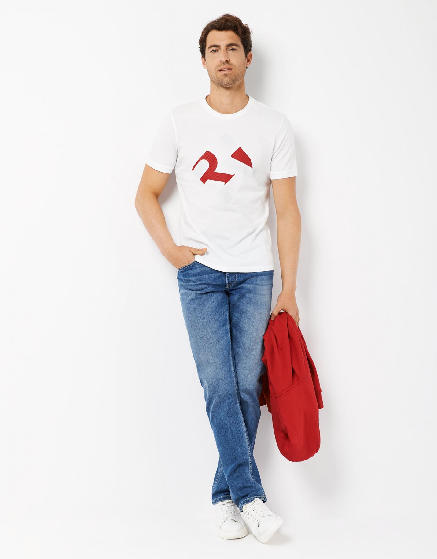 Camiseta de manga corta confeccionada en un algodón liso color blanco con logo RV impreso con textura color rojo y gris.