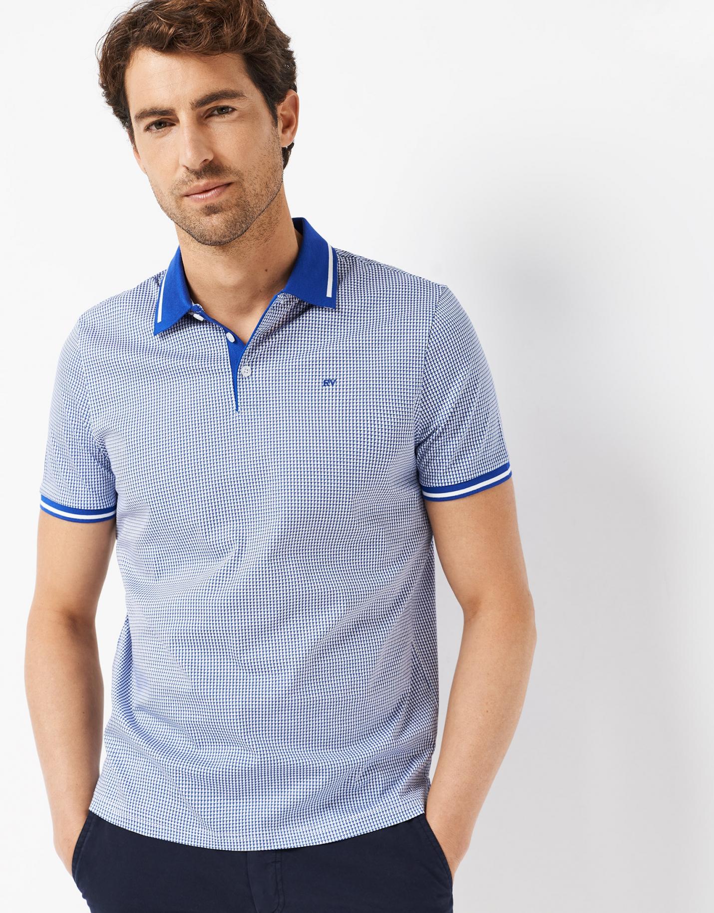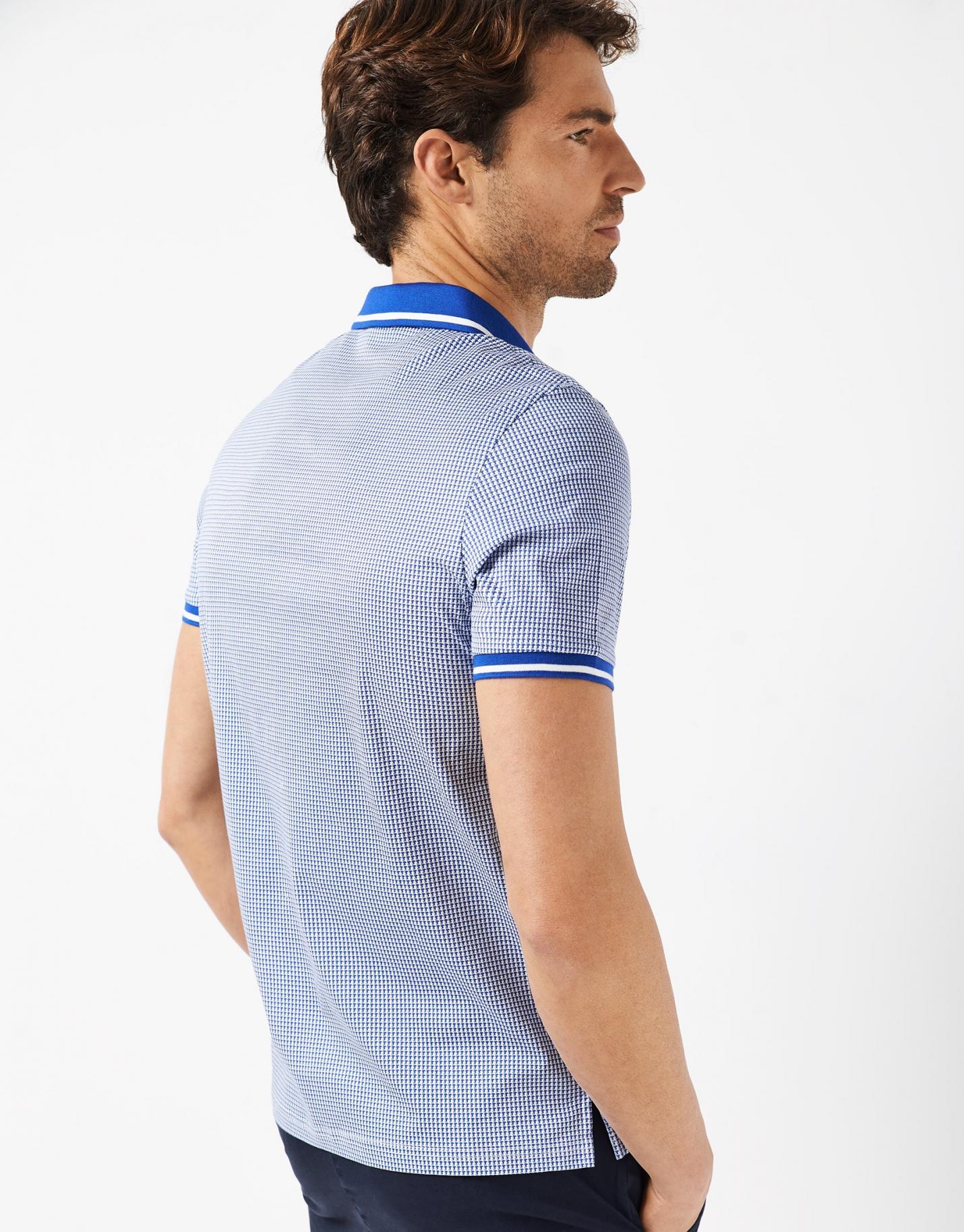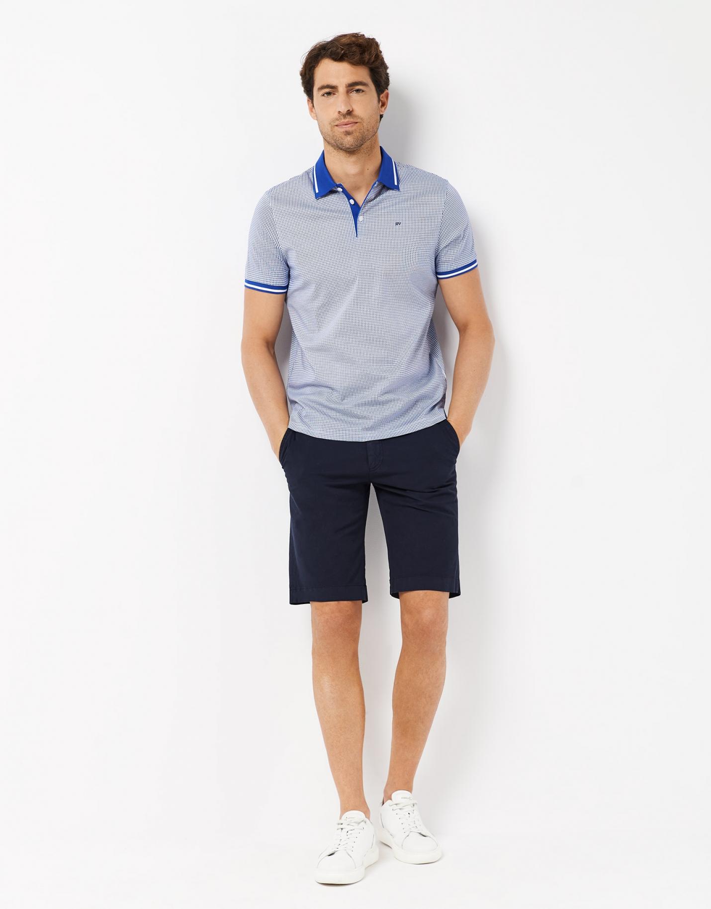 Polo de manga corta confeccionado en un jacquard de algodón mercerizado en tonos azules y blanco con cuello y puños a contrase en azulón y perfiles en blanco. Tapeta de tres botones y logo RV bordado en pecho.