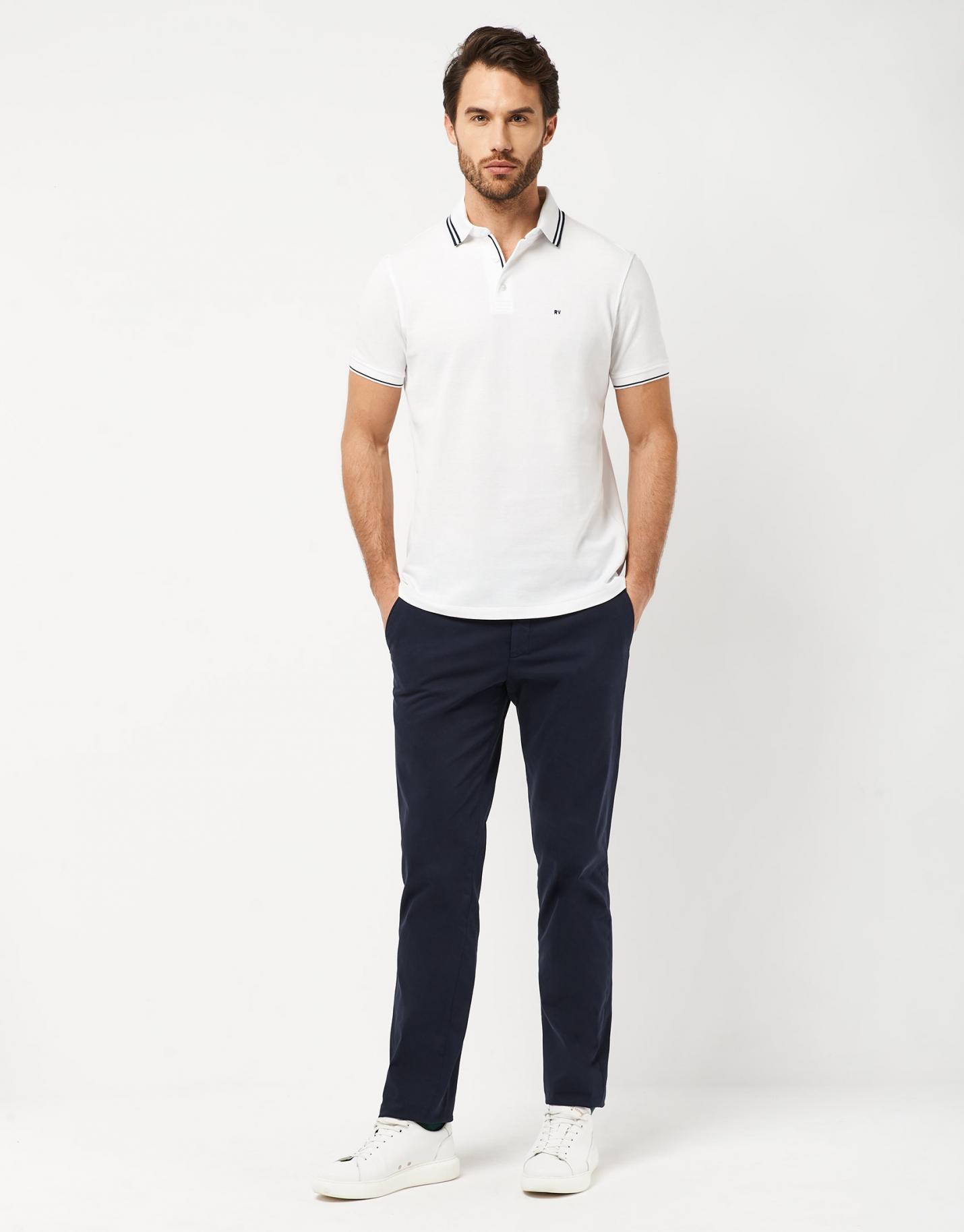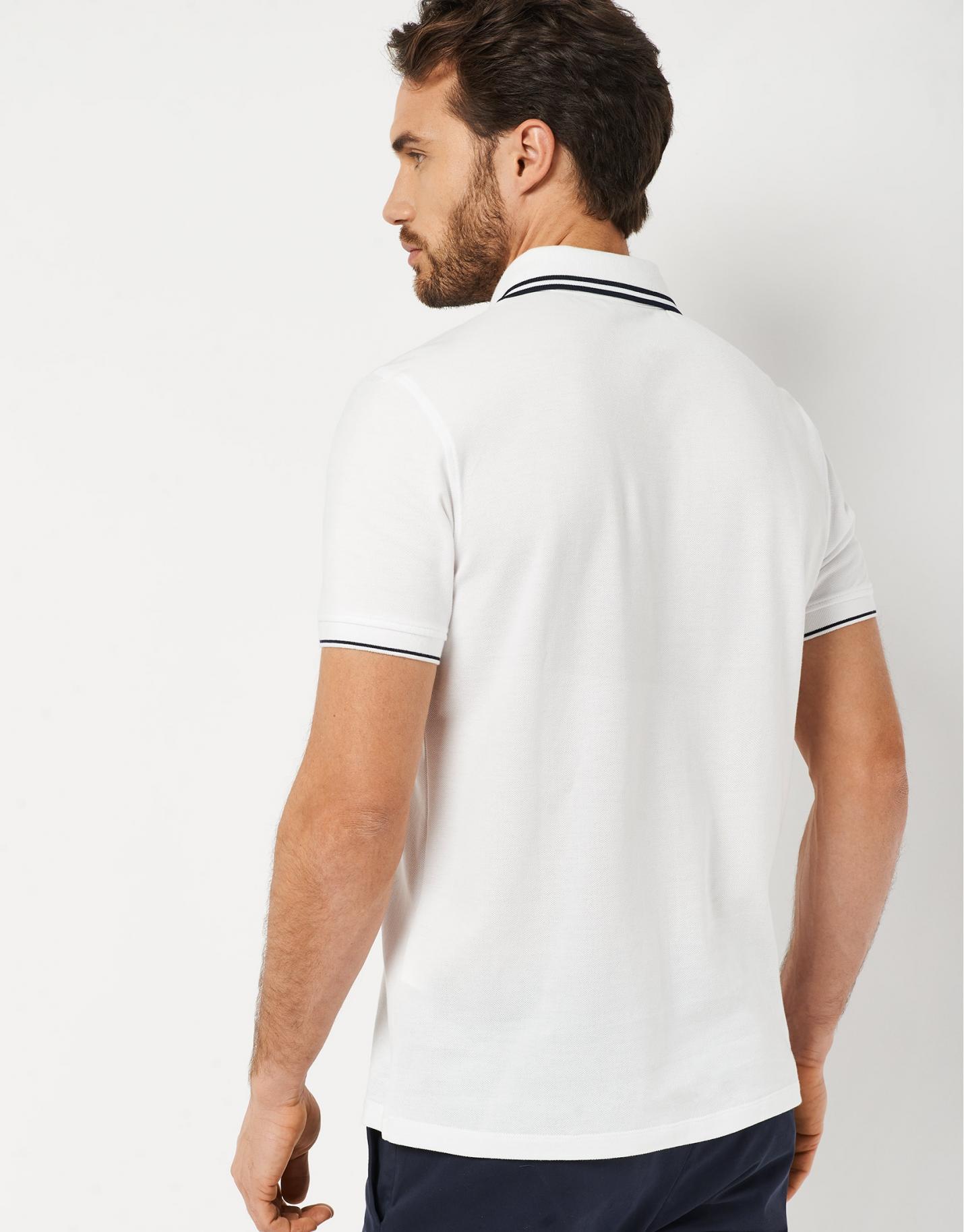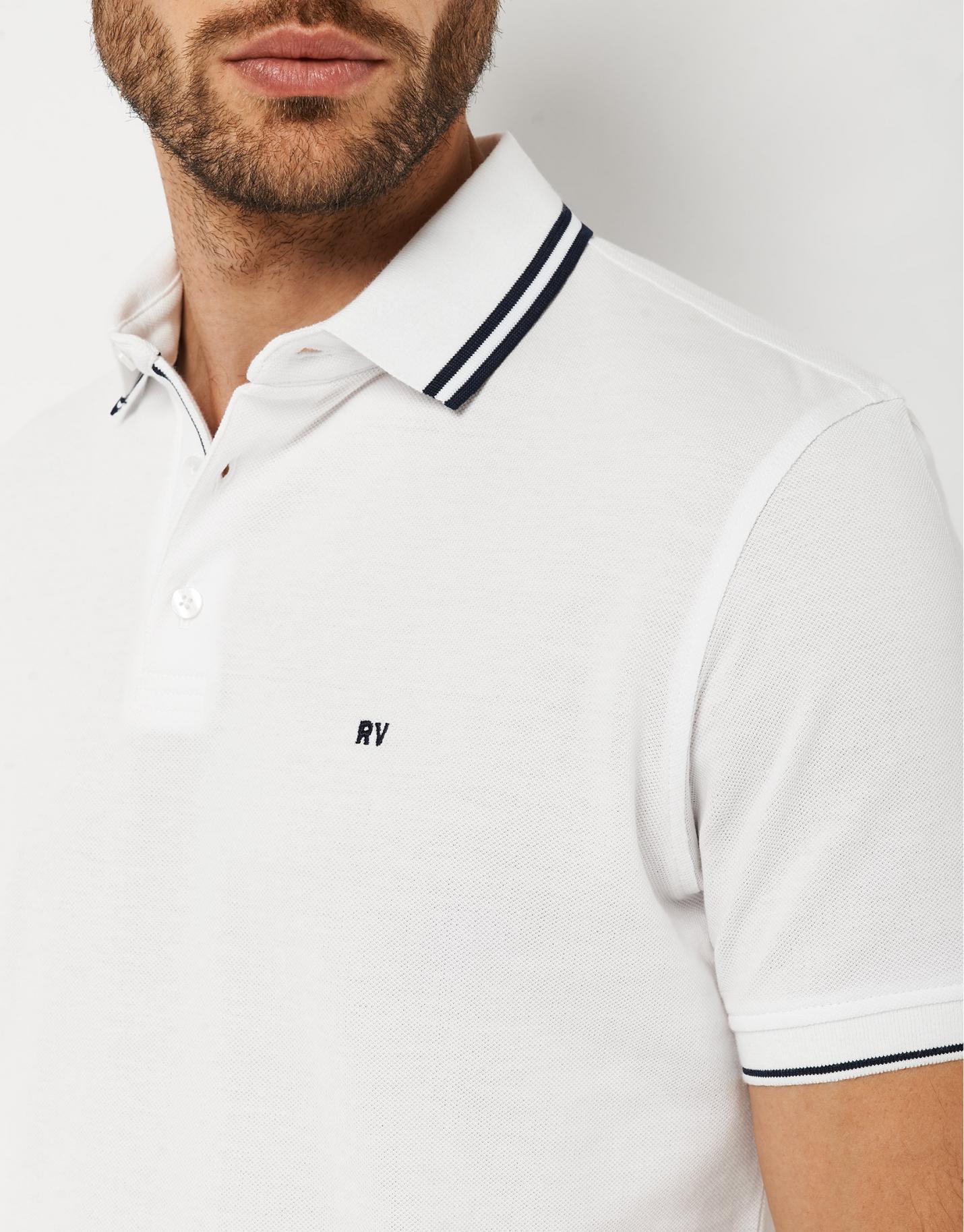 Polo de manga corta confeccionado en un piqué de algodón color blanco con listas a contraste marino en cuello y puños. Tapeta de tres botones y logo RV bordado en pecho.