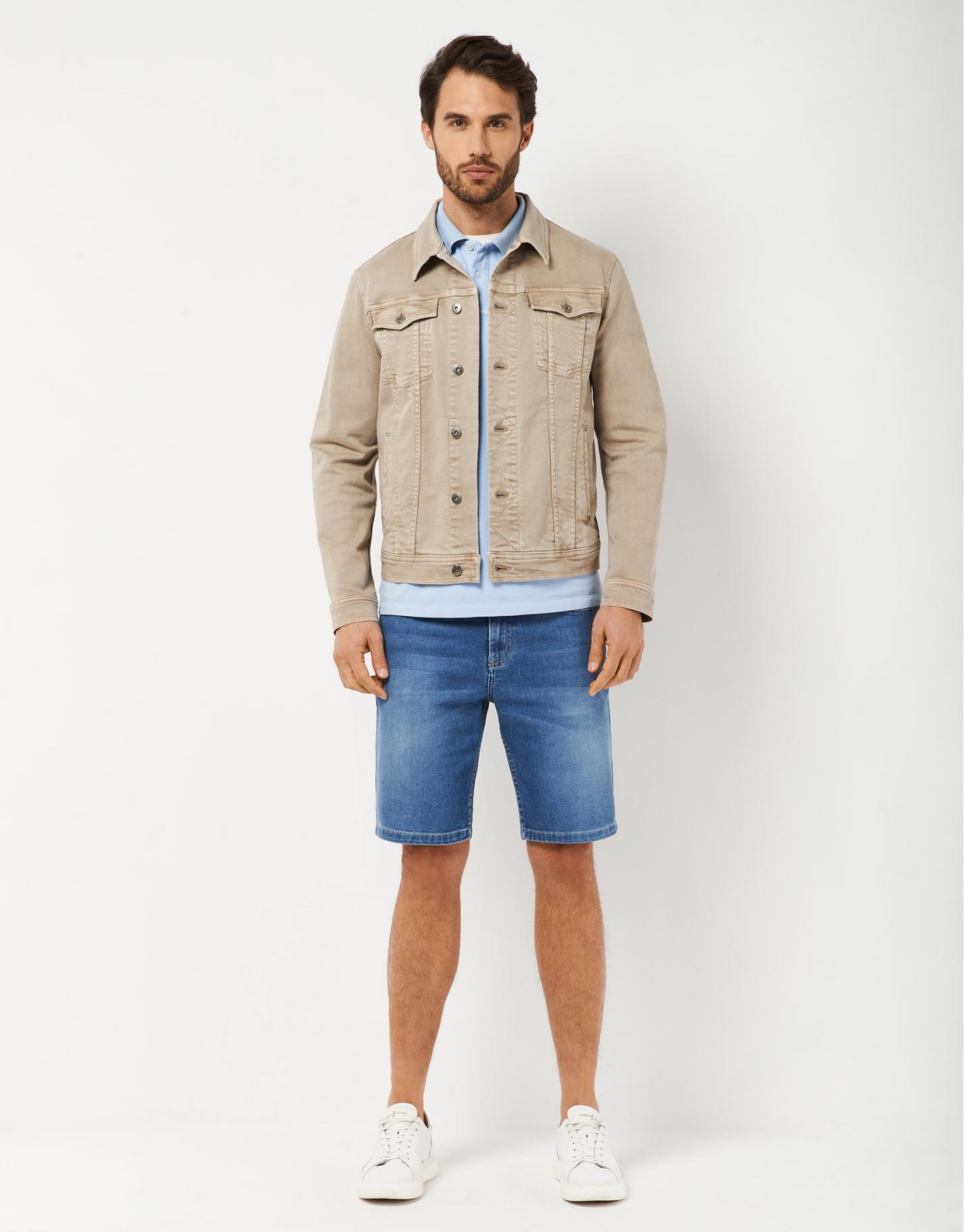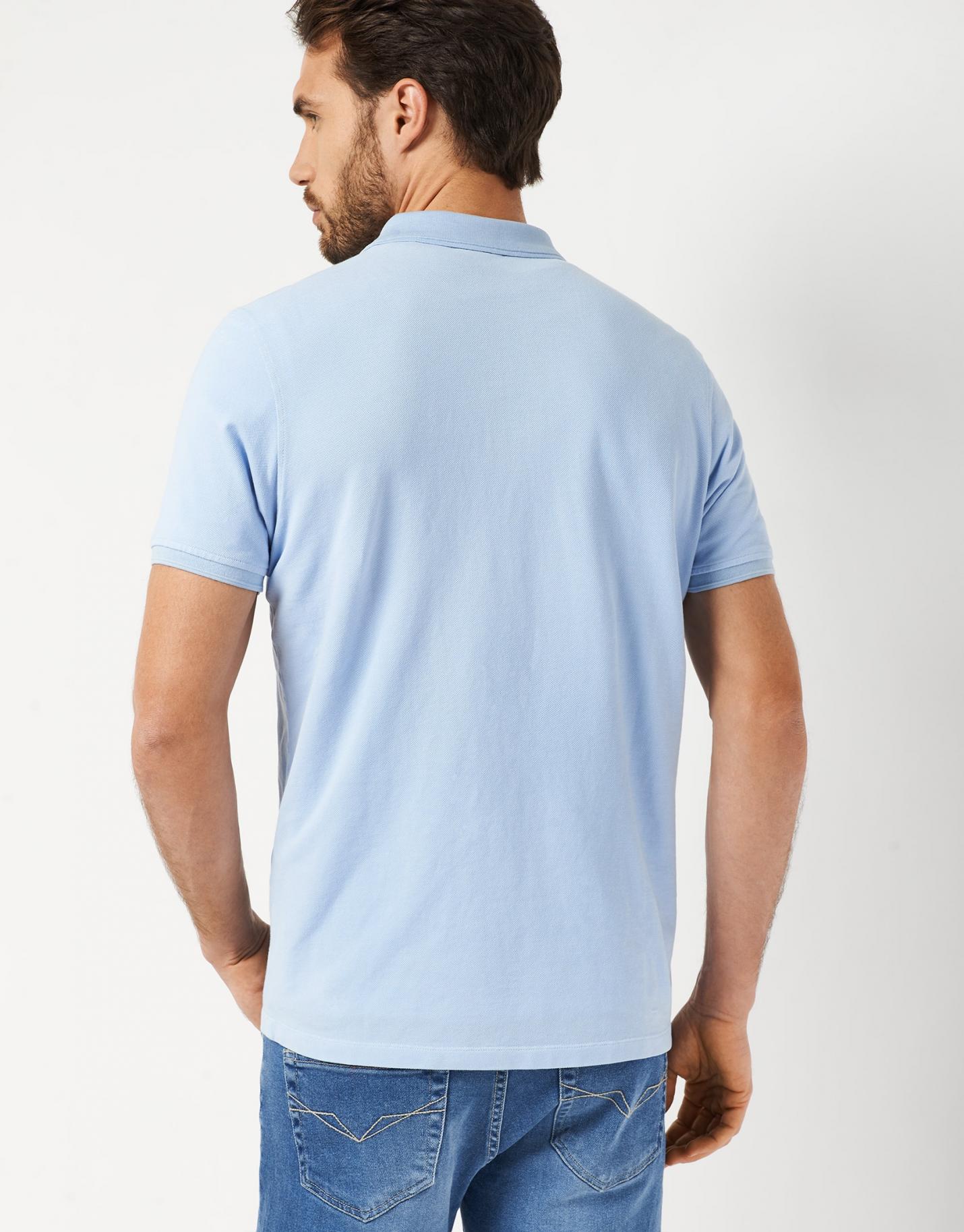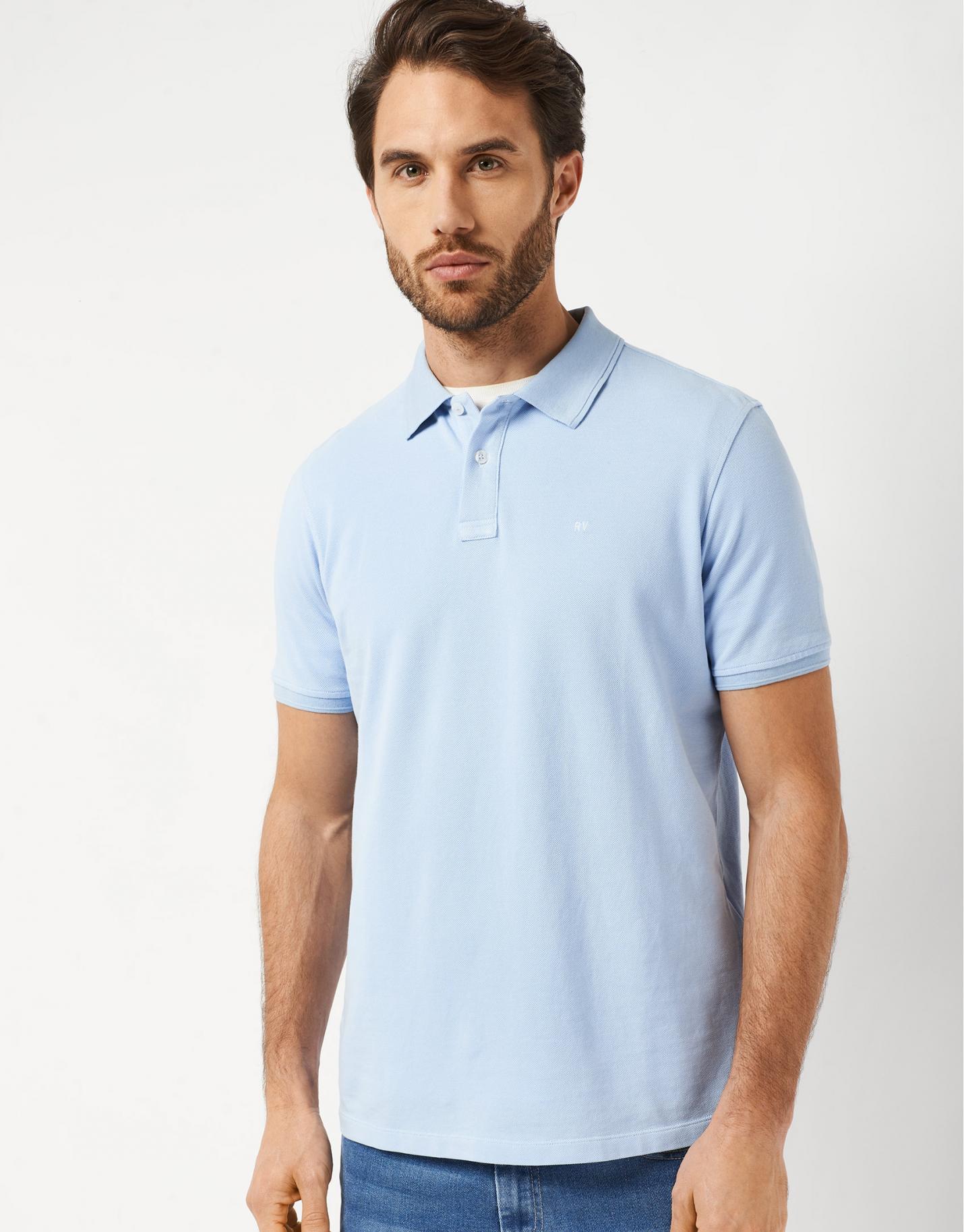 Polo de manga corta confeccionado en un piqué de algodón tintado color celeste con listas en relieve en cuello y puños. Tapeta de tres botones y logo RV bordado en pecho.