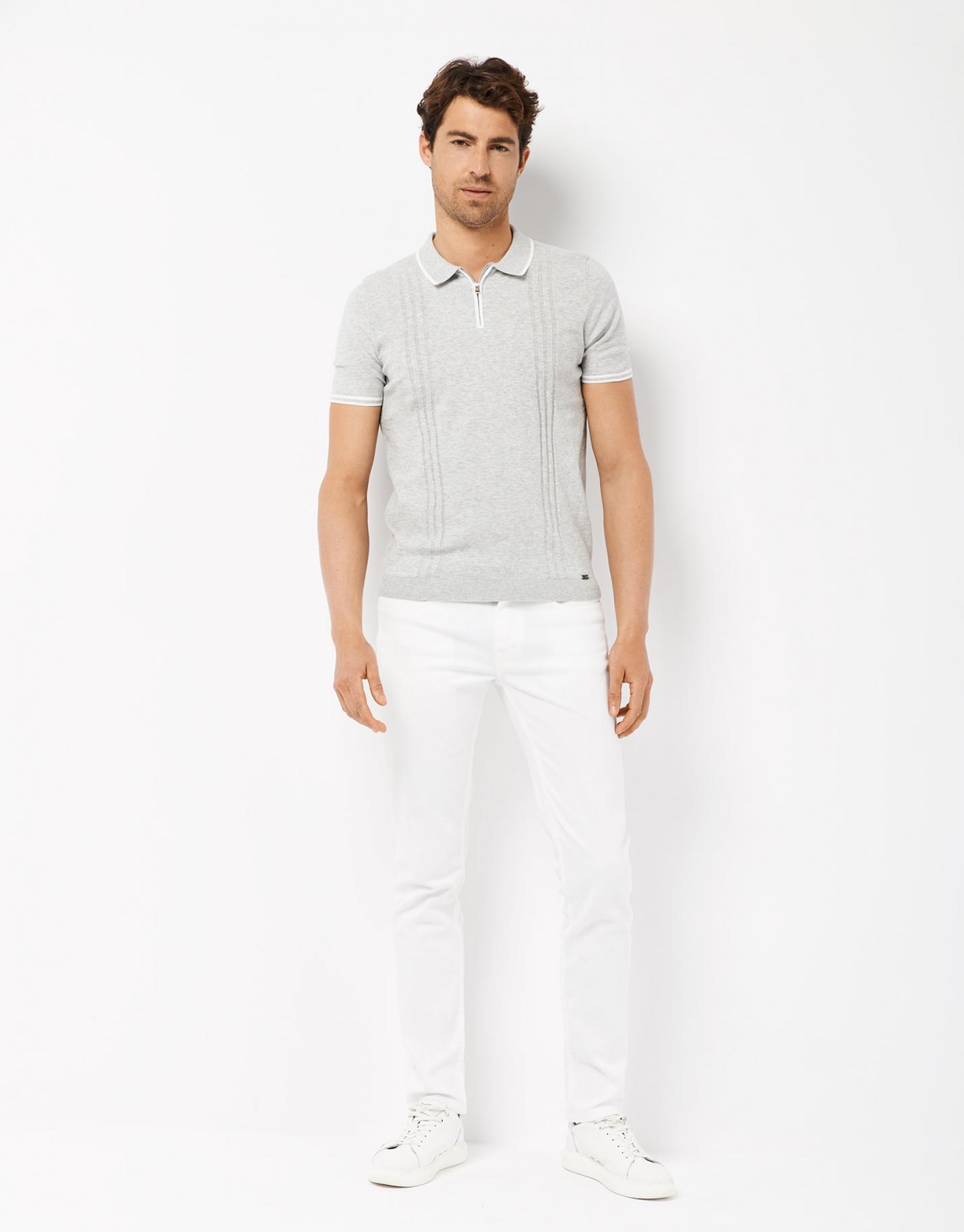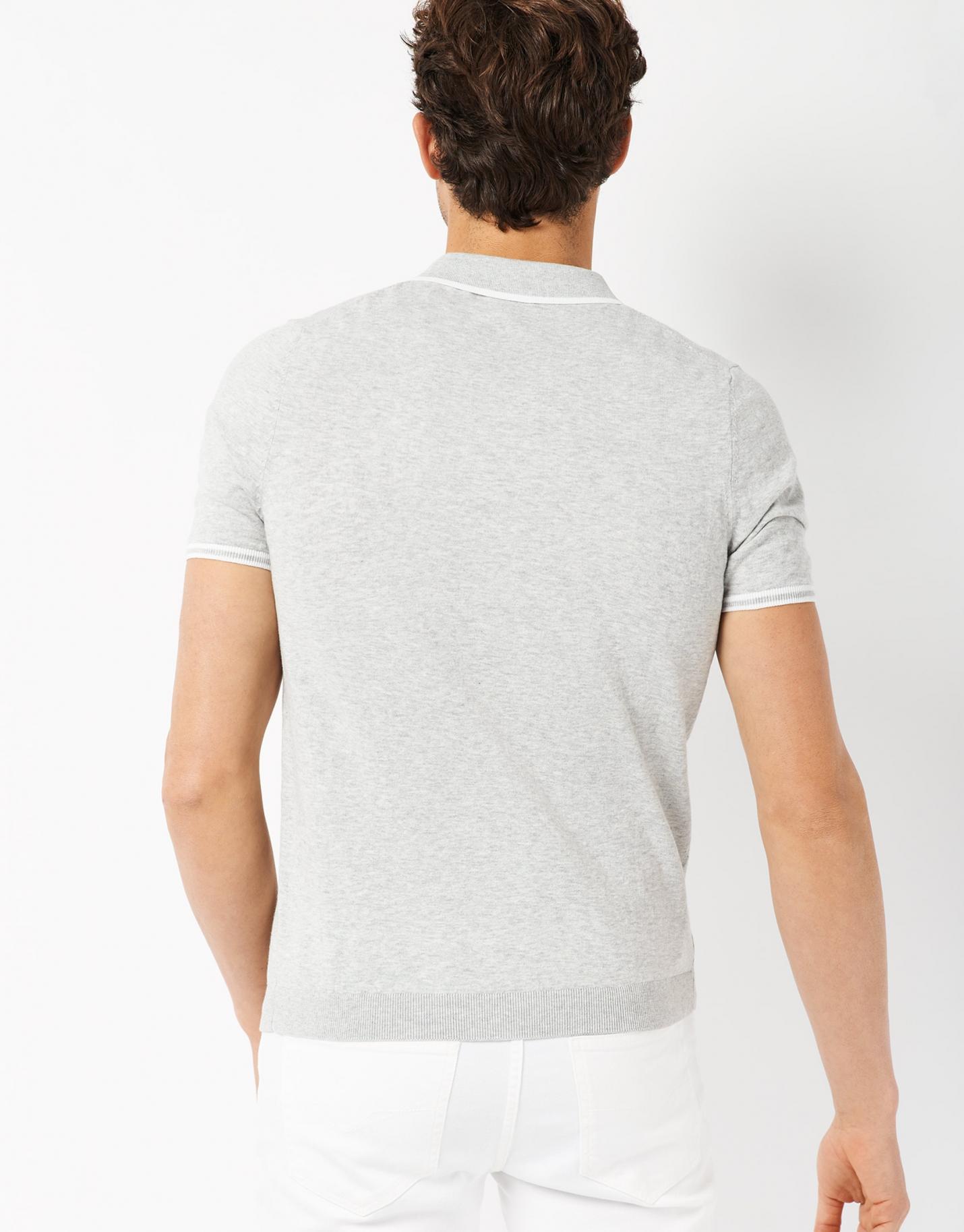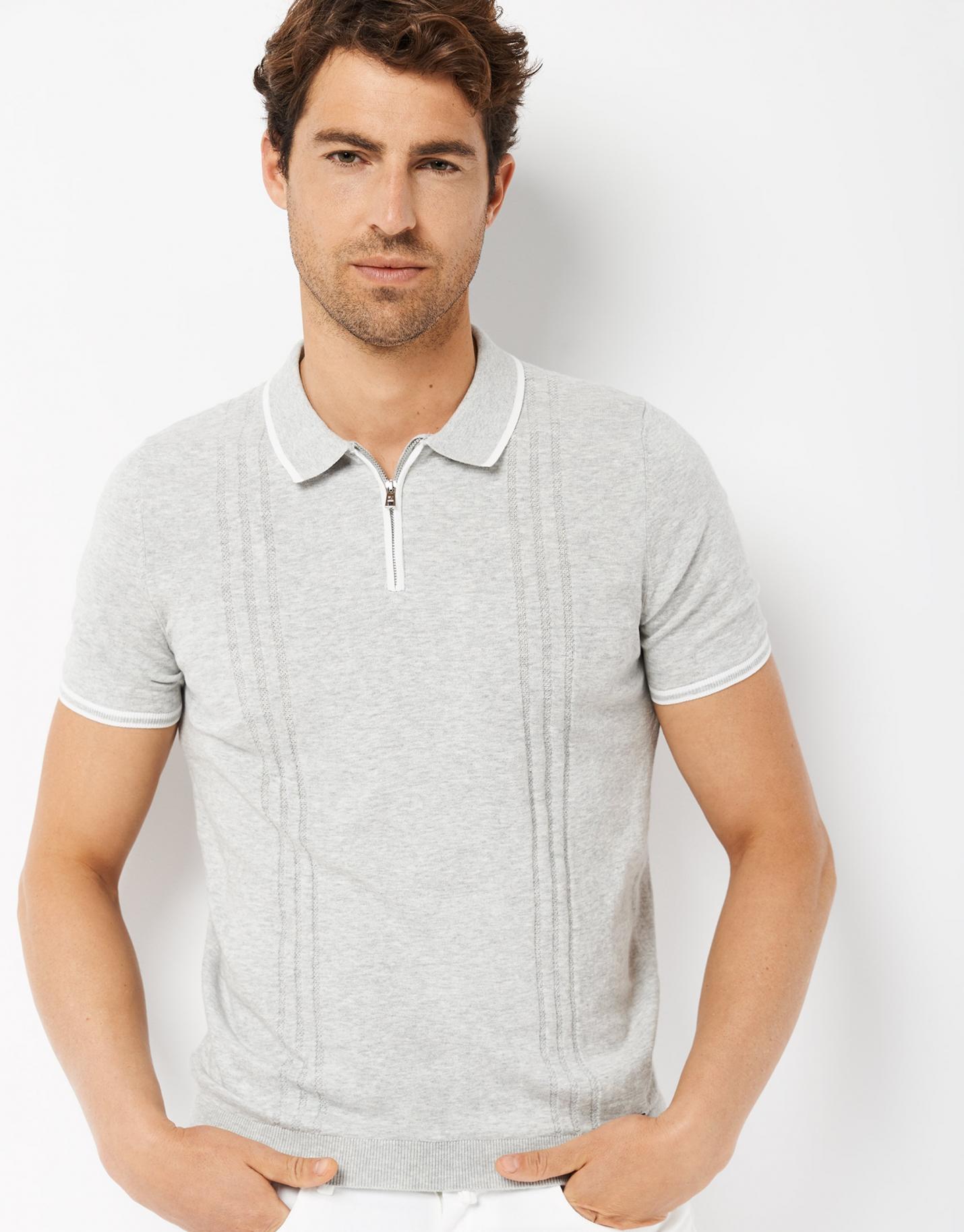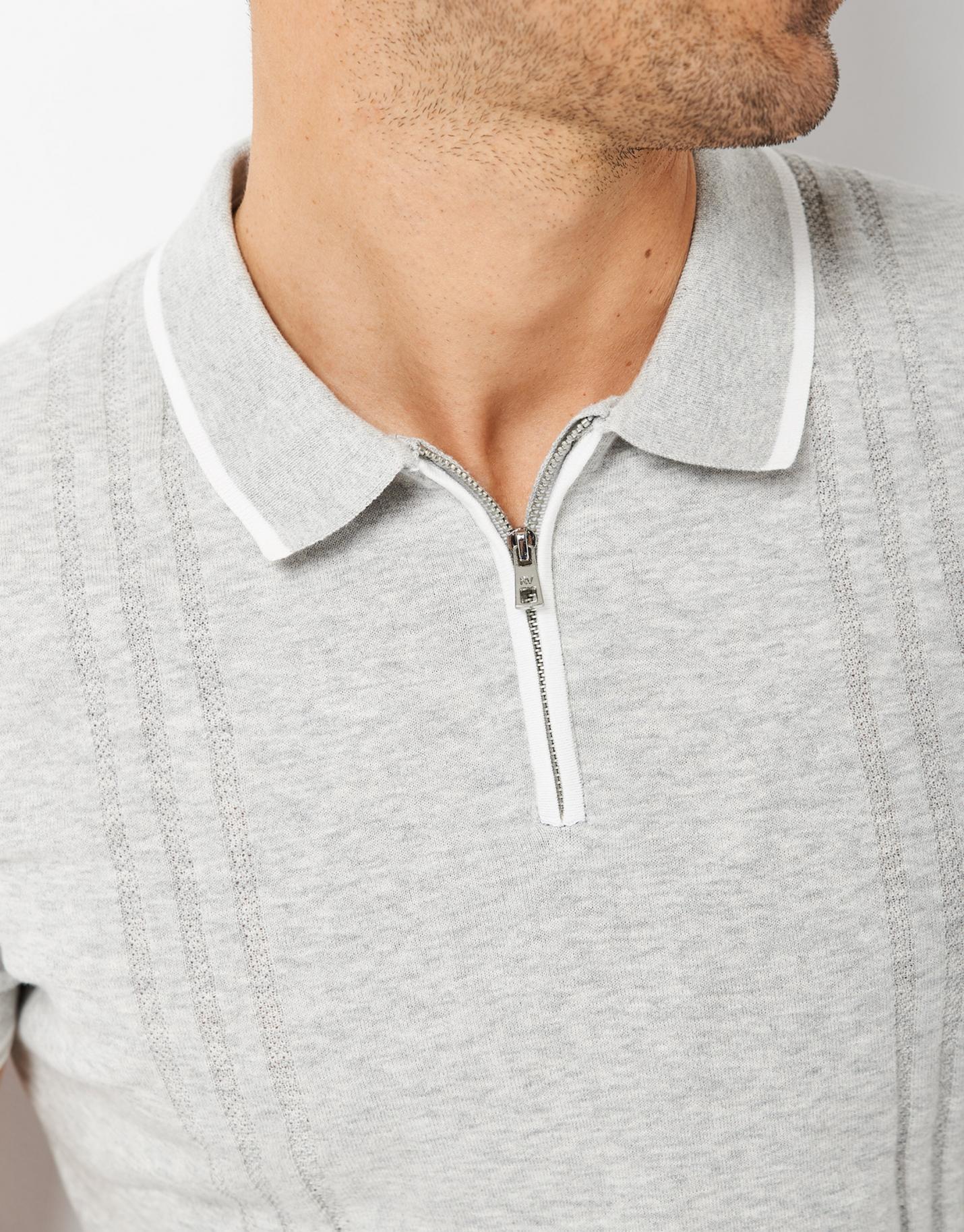 Polo de manga corta confeccionado en un algodón high twist gris claro con detalle de listas tricotadas en delantero y abertura de cuello con cremallera. Acabados de perfil blanco en el cuello, puños y tapeta de cremallera.