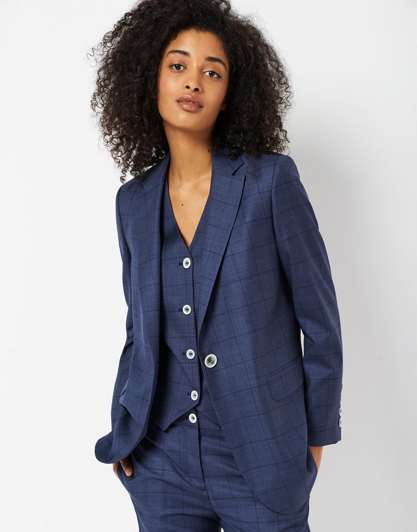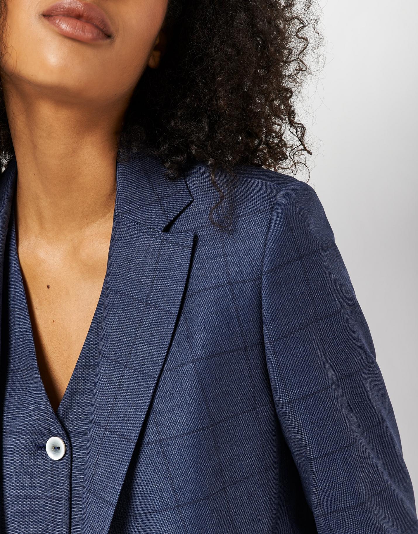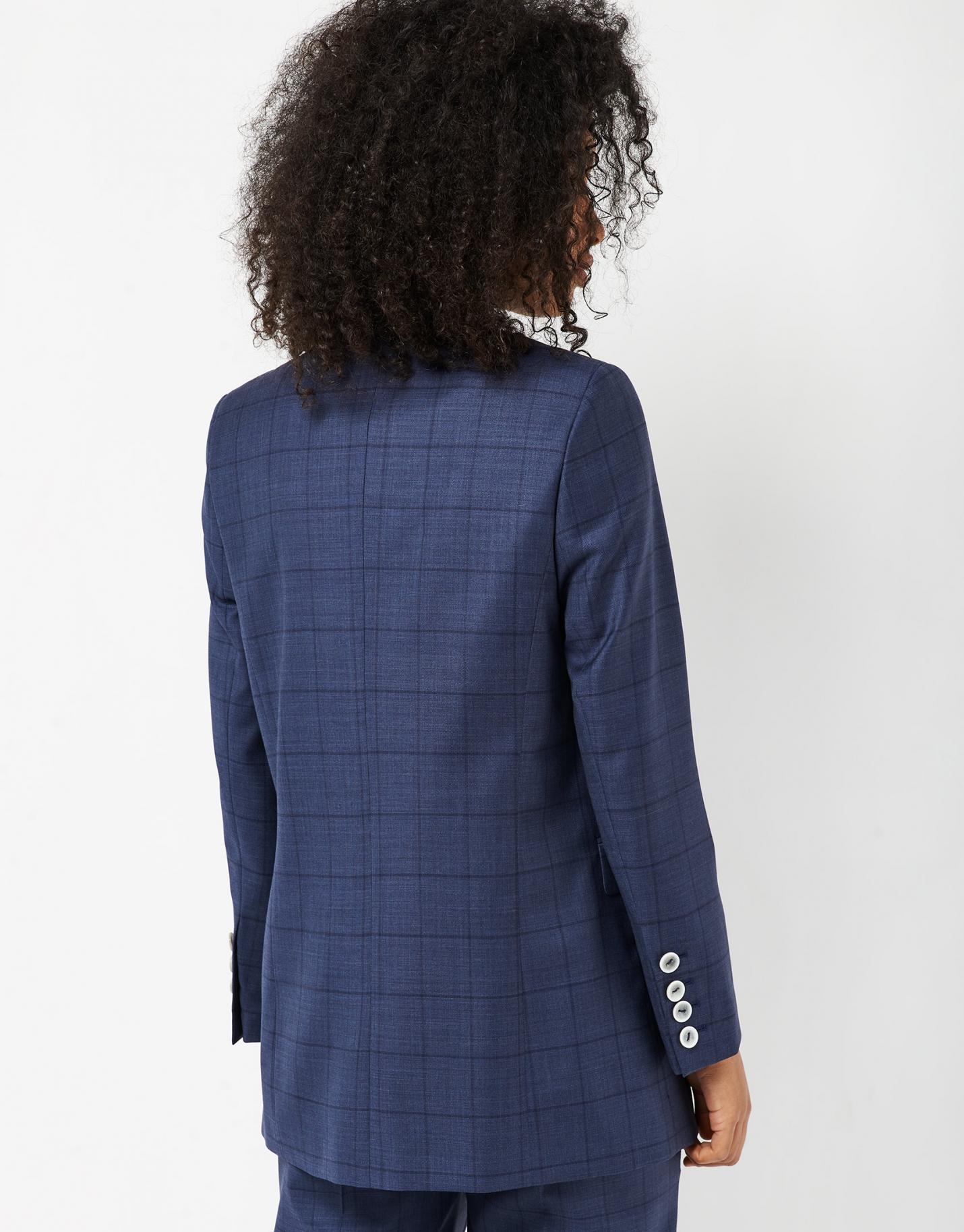 Blazer larga confeccionada en un tejido de lana fresca con cuadro ventana azul y perfil azul oscuro. Cuello solapa, cierre de un botón, bajo ligeramente redondeado y dos bolsillos de solapa en delantero
