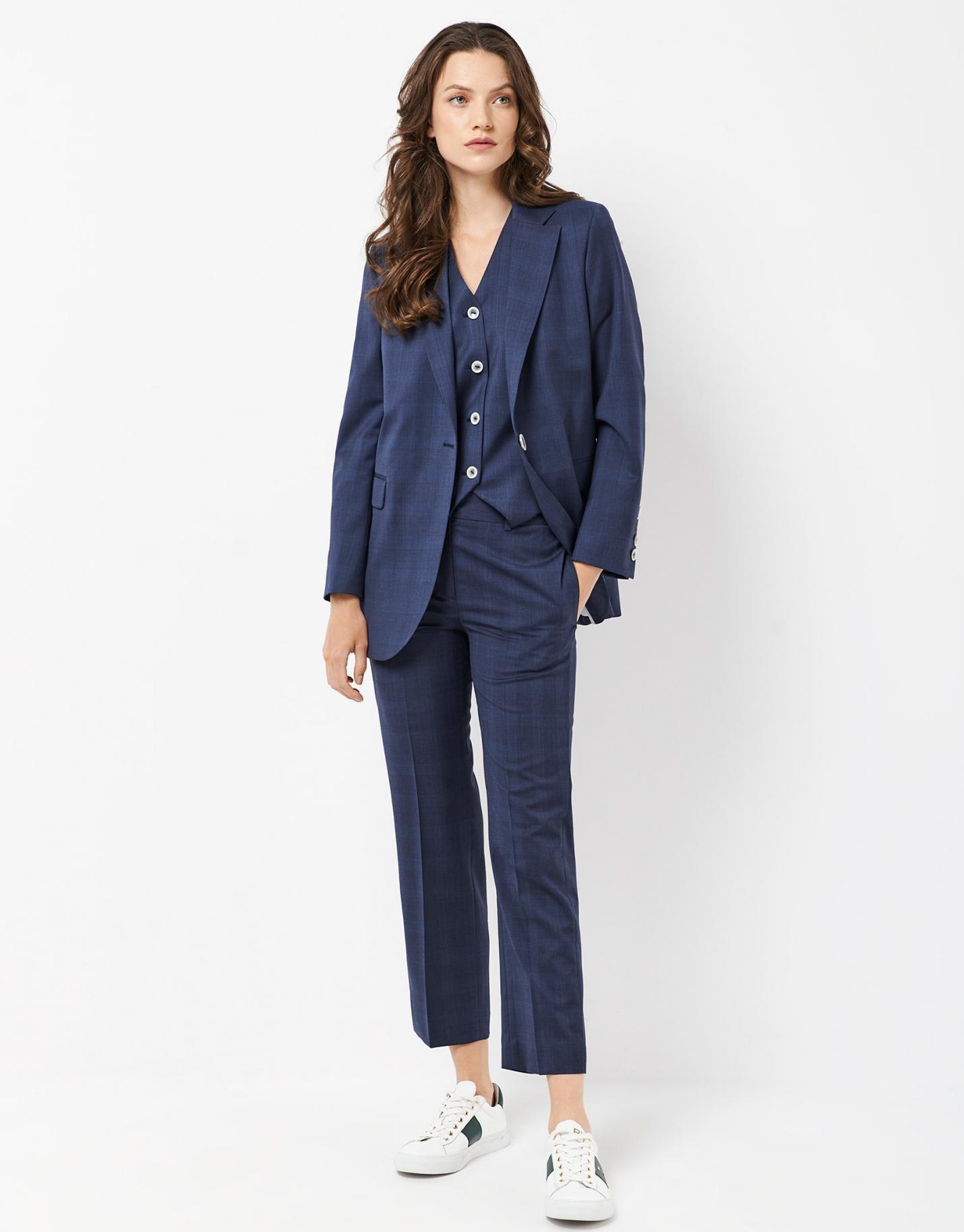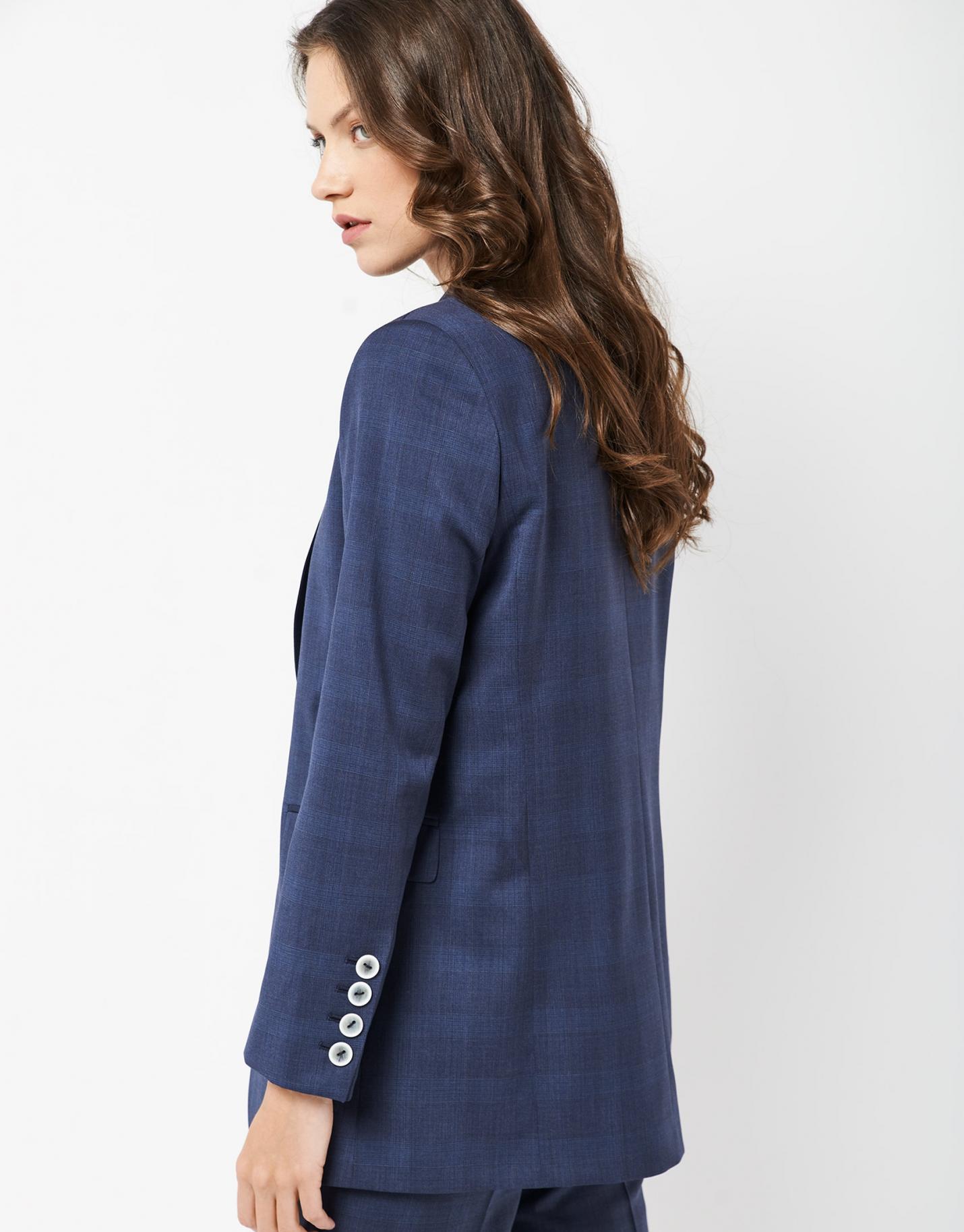 Blazer larga confeccionada en un tejido falso liso de lana fresca color azul. Cuello solapa, cierre de un botón, bajo ligeramente redondeado y dos bolsillos de solapa en delantero.