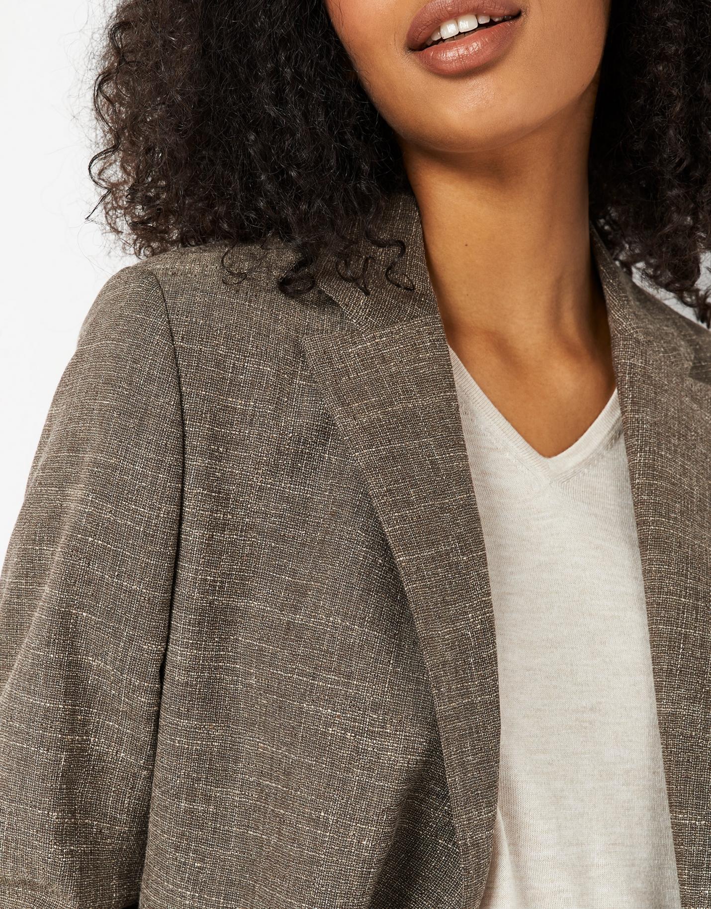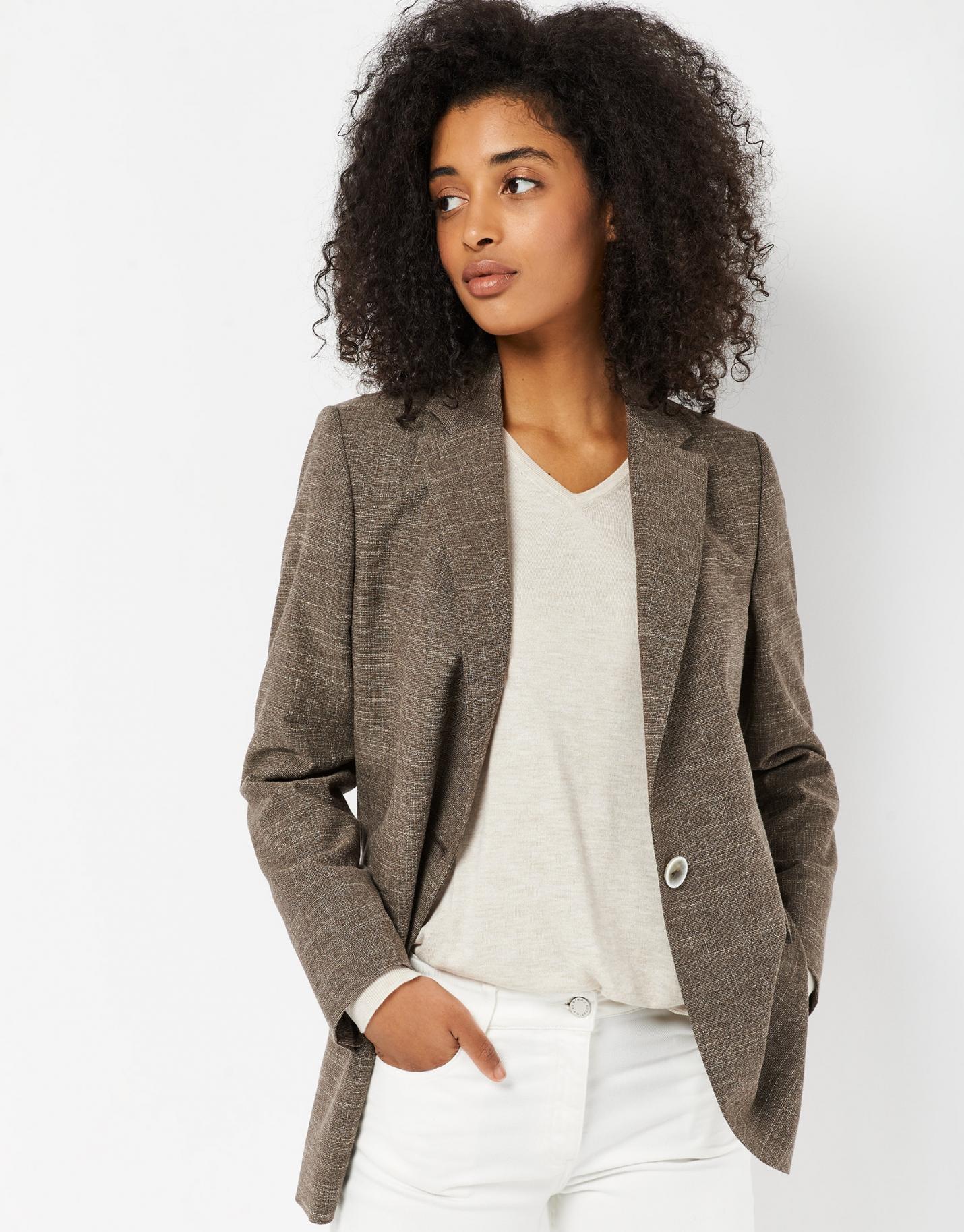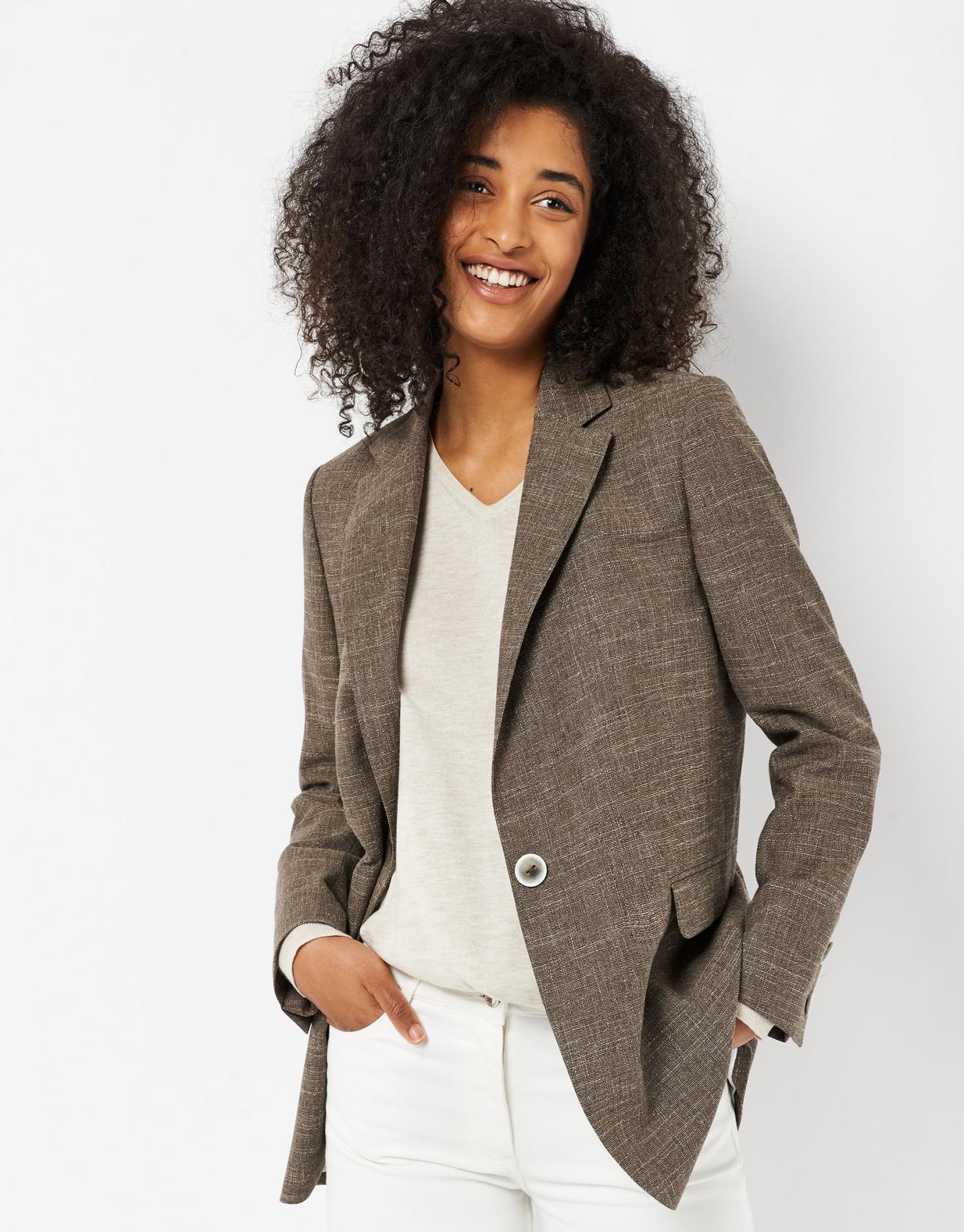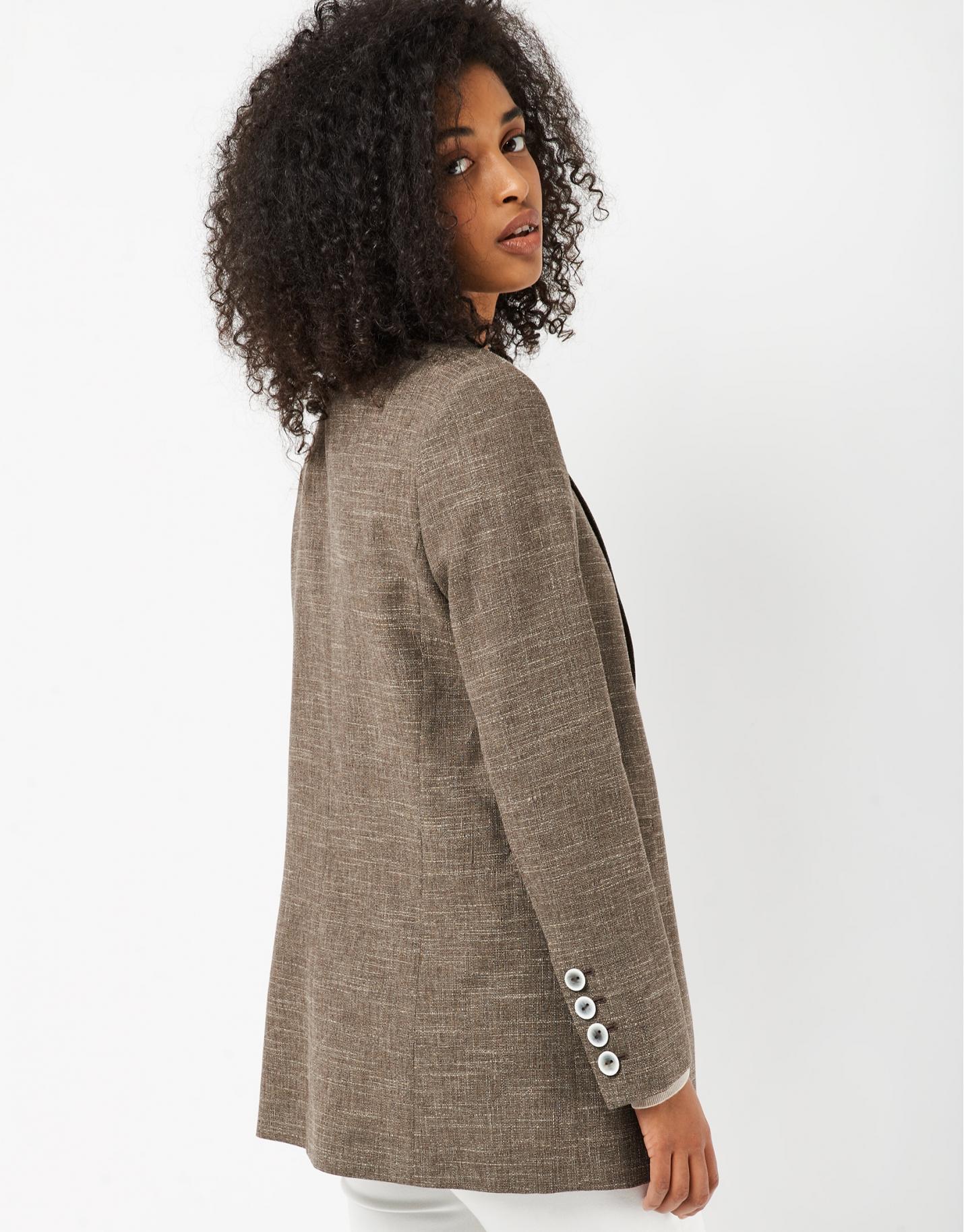 Blazer larga confeccionada en un tejido trabajado de lana, algodón y lino en tonos marrones. Cuello solapa, cierre de un botón, bajo ligeramente redondeado y dos bolsillos de solapa en delantero.