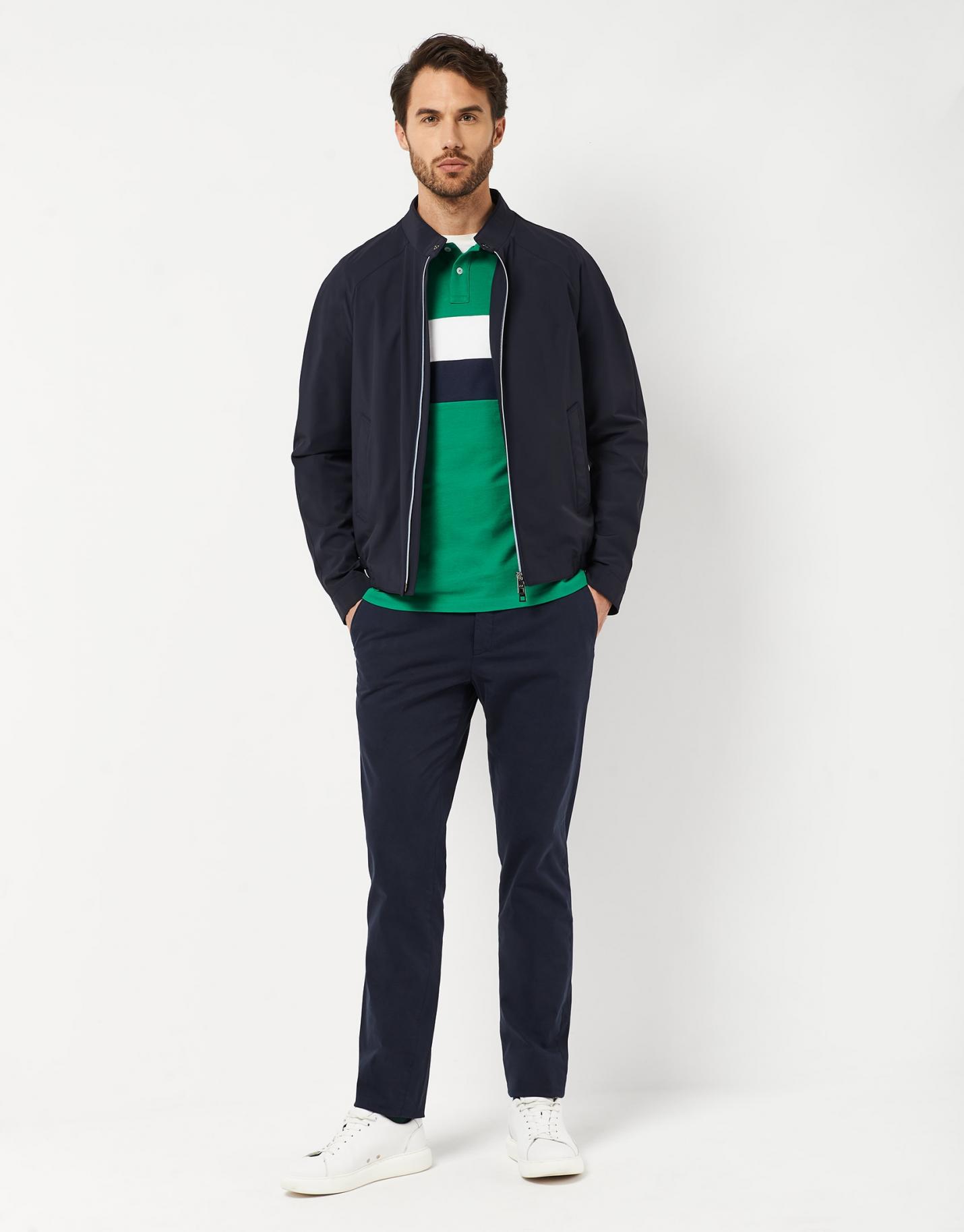 Cazadora deportiva ligera confeccionada en un tejido de nailon color azul marino. Cierre con cremallera y broche en cuello, dos bolsillos de vivo en delantero y puños ceñidos con ajustador. …