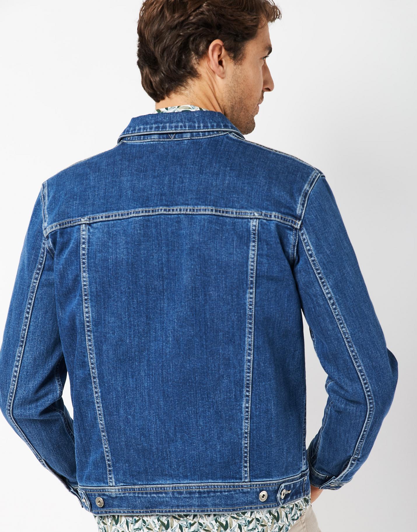 Cazadora vaquera confeccionada en un algodón ligeramente elástico color azul lavado piedra. Cuello camisero y cierre con botones. Dos bolsillos laterales insertados en cortes delanteros y dos de tapeta con botón en pecho.