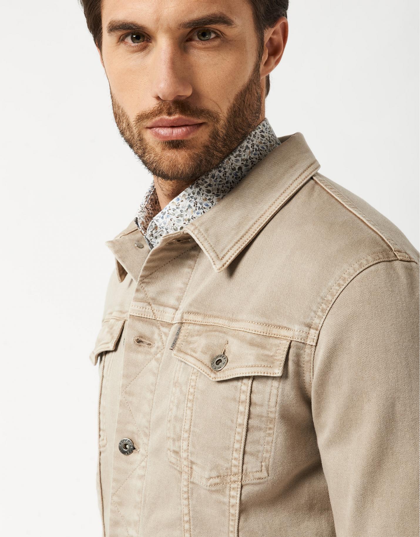 Cazadora vaquera confeccionada en un algodón ligeramente elástico color tintada en color arena y lavado suavizado. Cuello camisero, manga larga rematada en puño con botón, cierre con botones en delantero, dos bolsillos laterales insertados en cortes delanteros y dos en pecho de tapeta con botón.