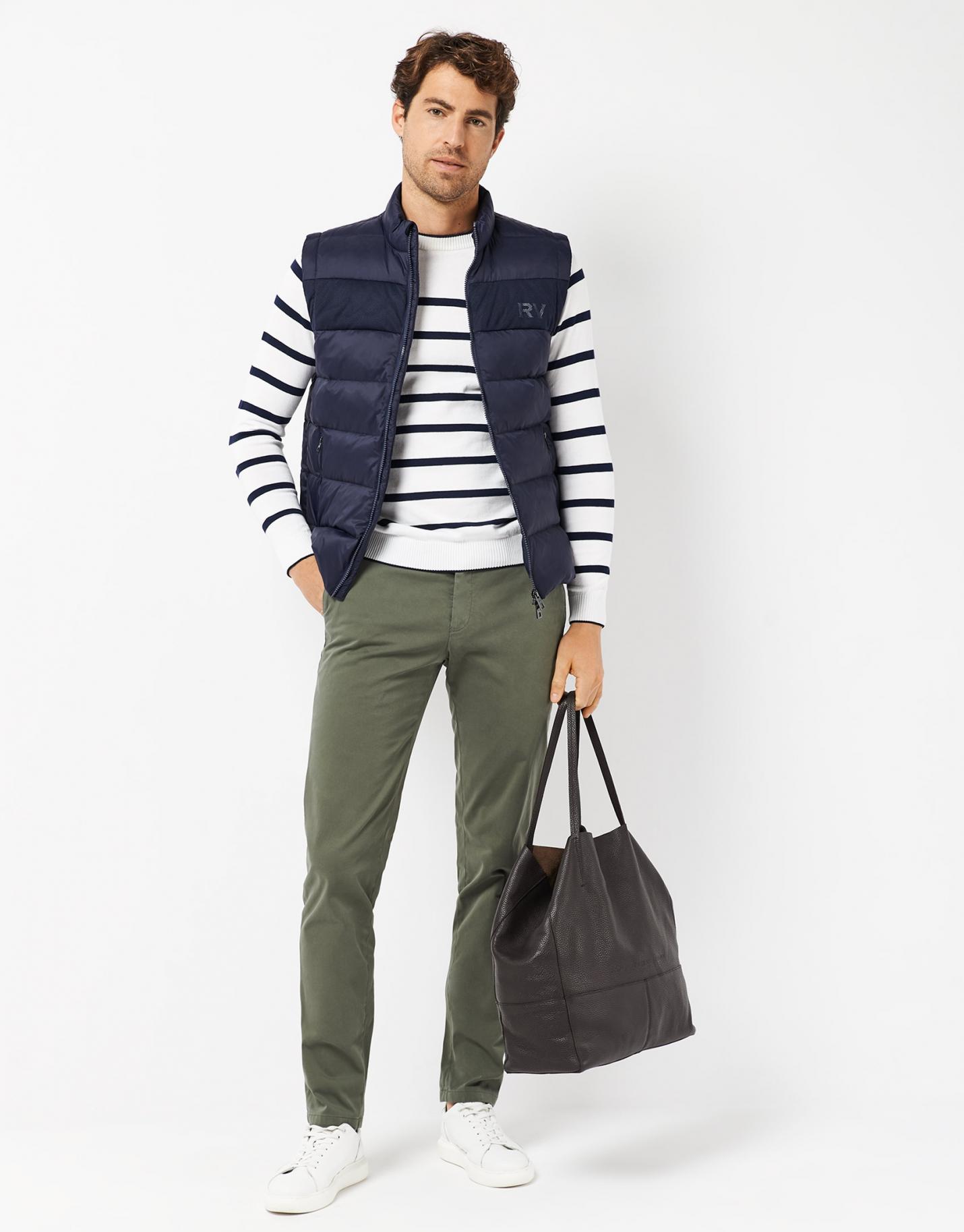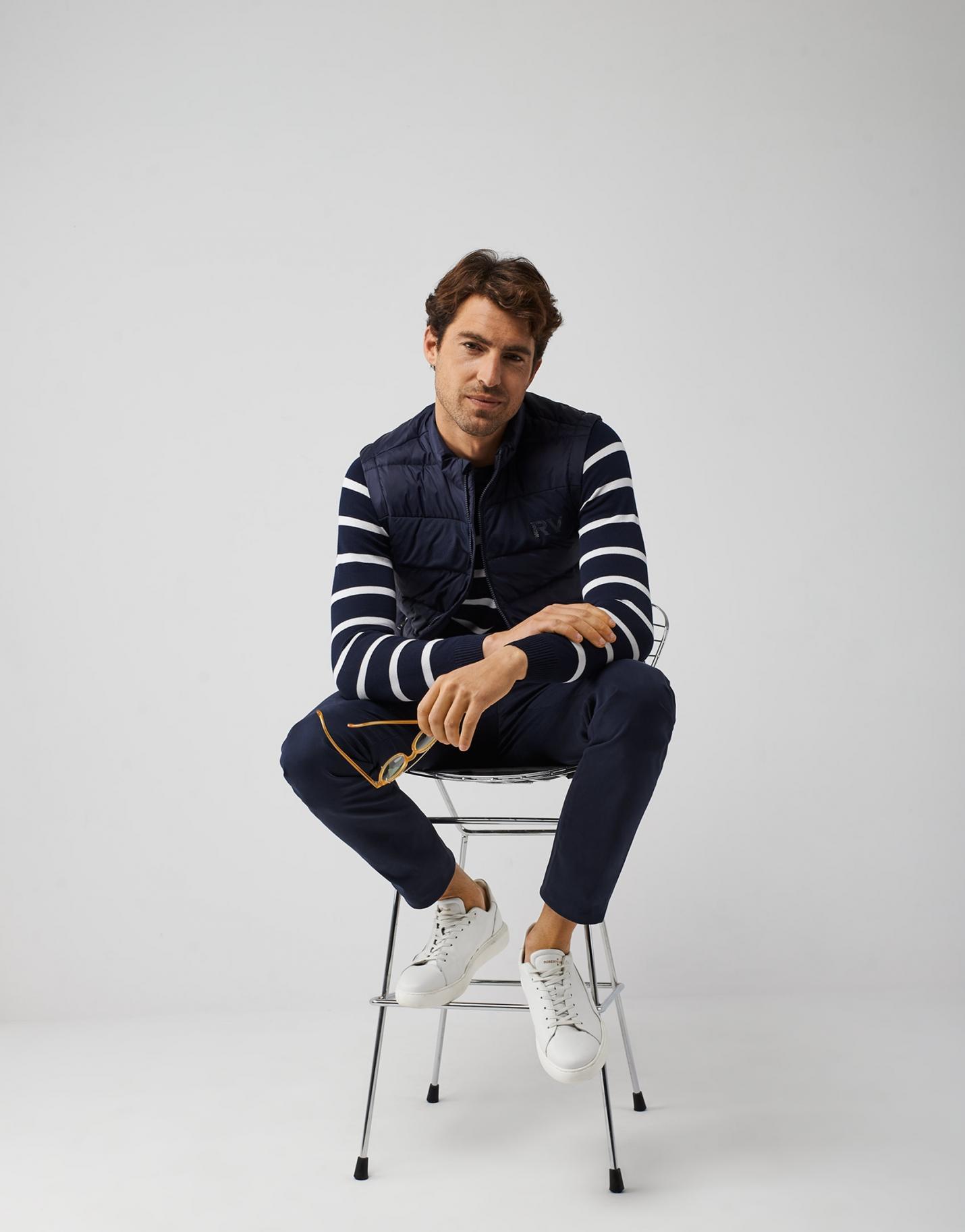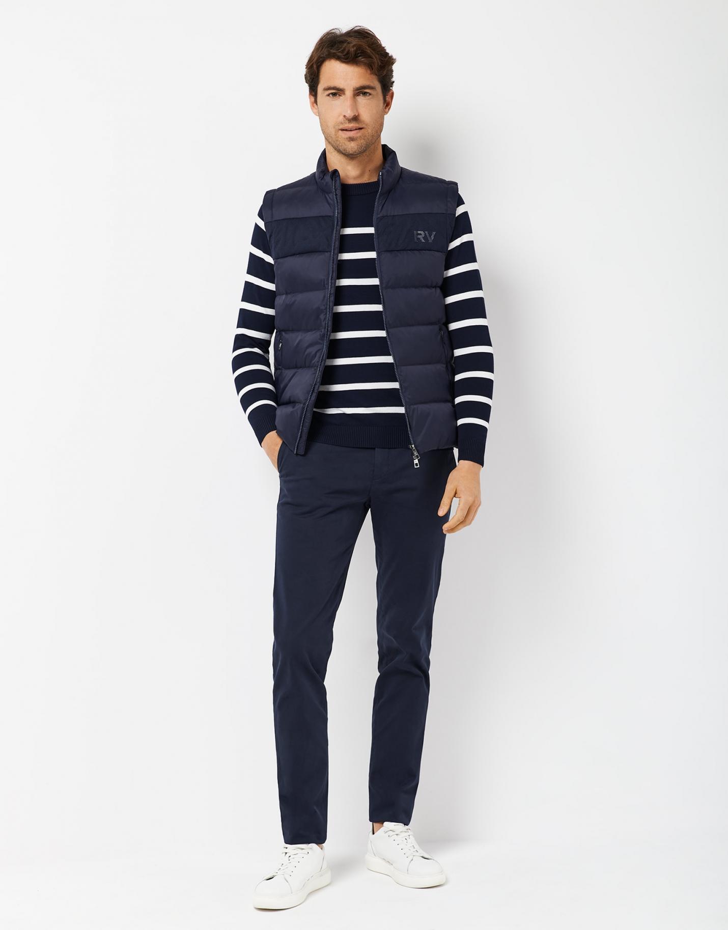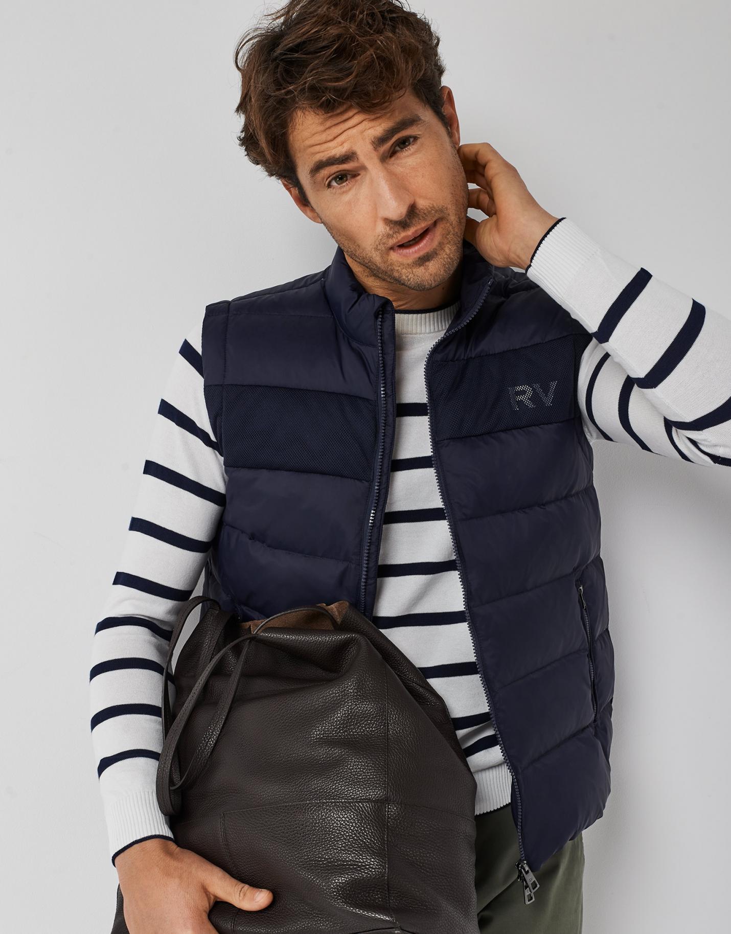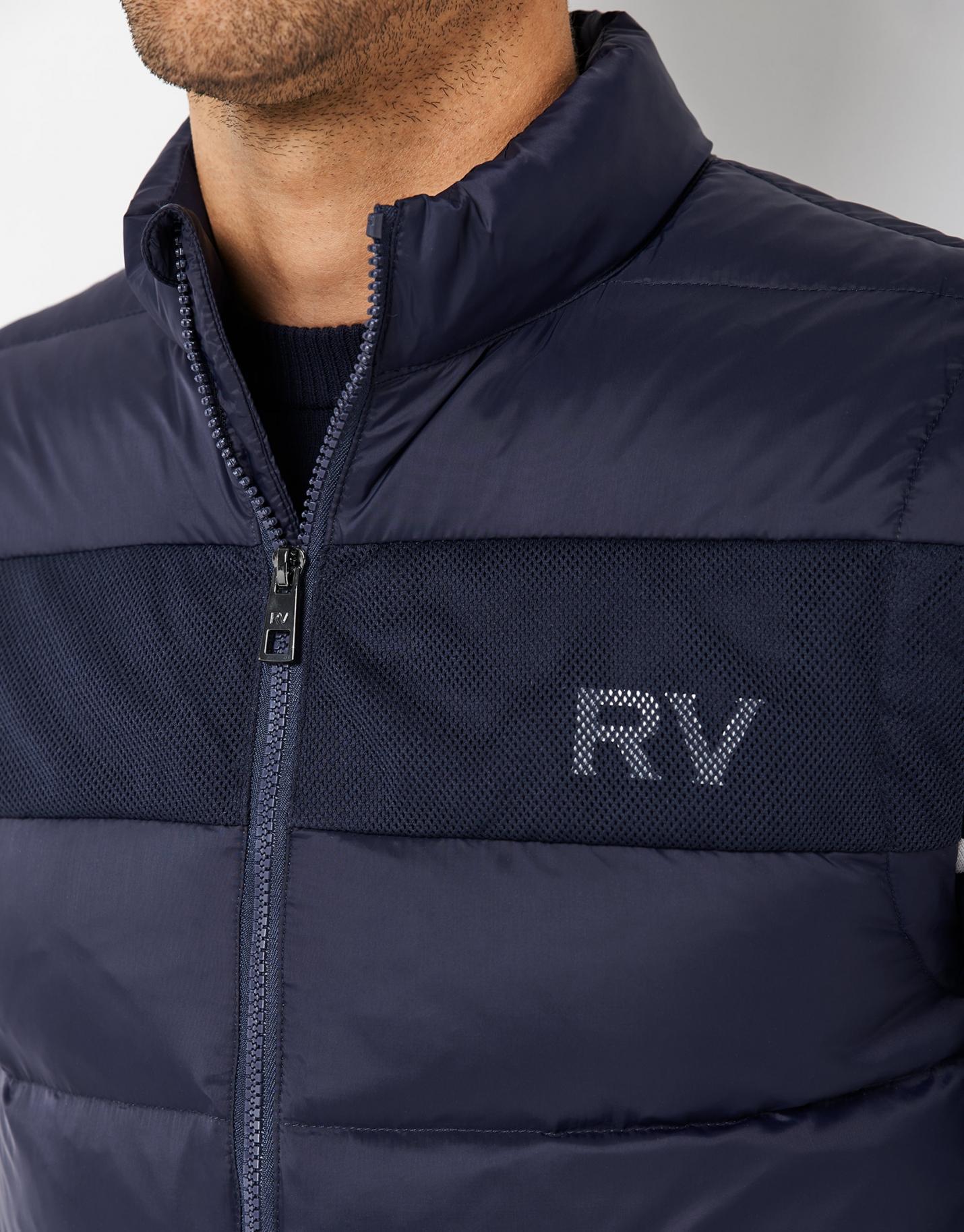 Chaleco acolchado confeccionado en un tejido técnico de nailon color azul marino con personalización de RV en pecho. Cuello subido, cierre con cremallera y dos bolsillos de cremallera en frontal.