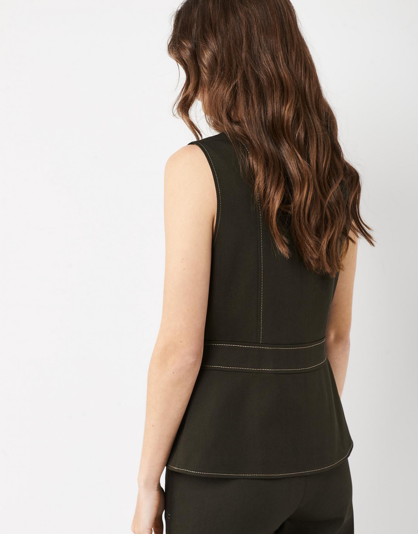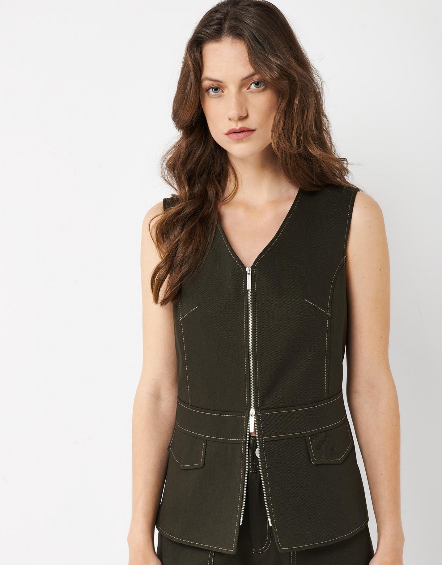 Chaleco con escote pico confeccionado en un tejido de algodón color verde. Cintura ancha pespunteada con dos bolsillos de tapeta y cierre en delantero con cremallera de doble cursor a la vista.