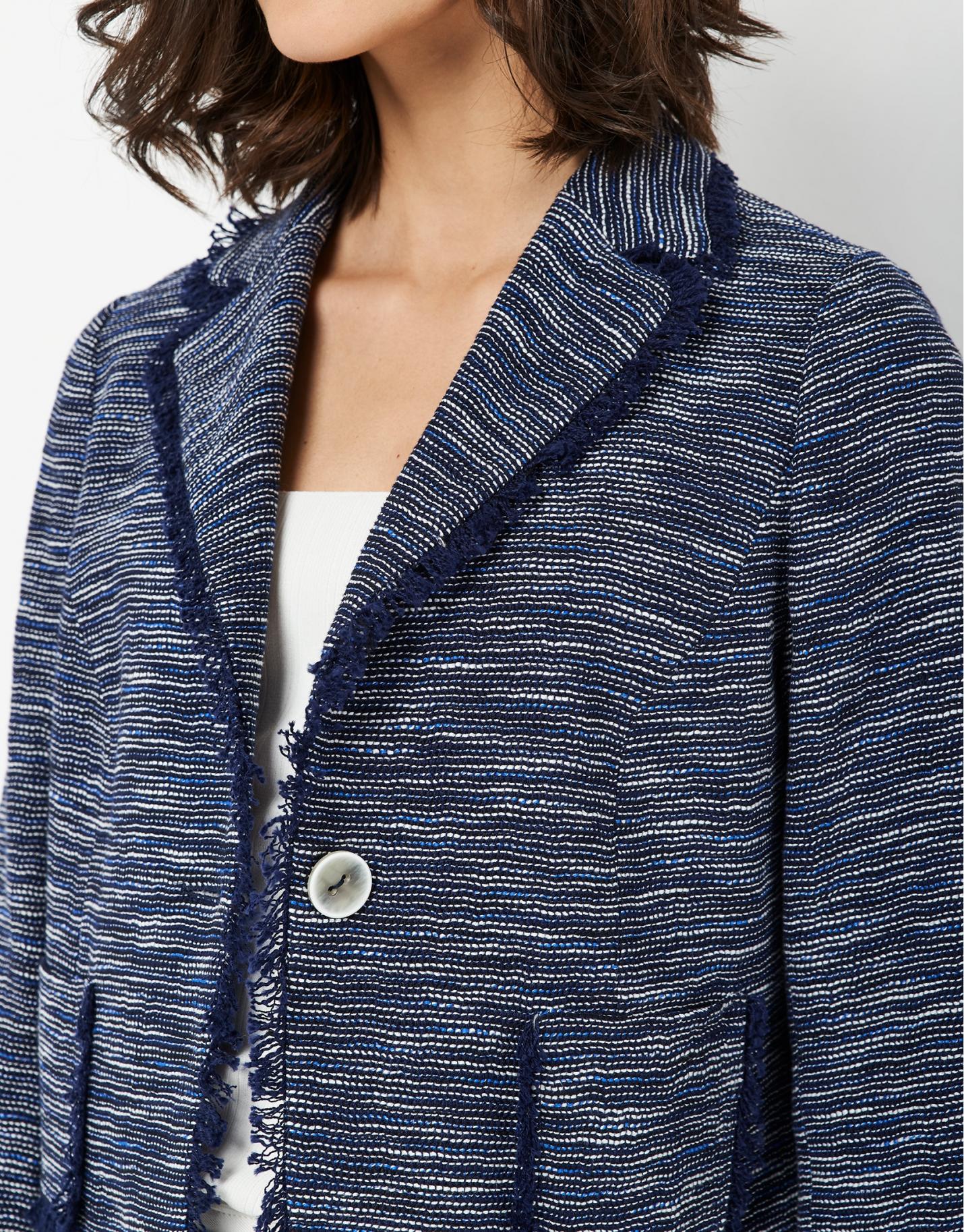 Chaqueta corta confeccionada en un tejido azul jaspeado con desflecados en los contornos. Cuello solapa y dos bolsillos de plastón en delantero.