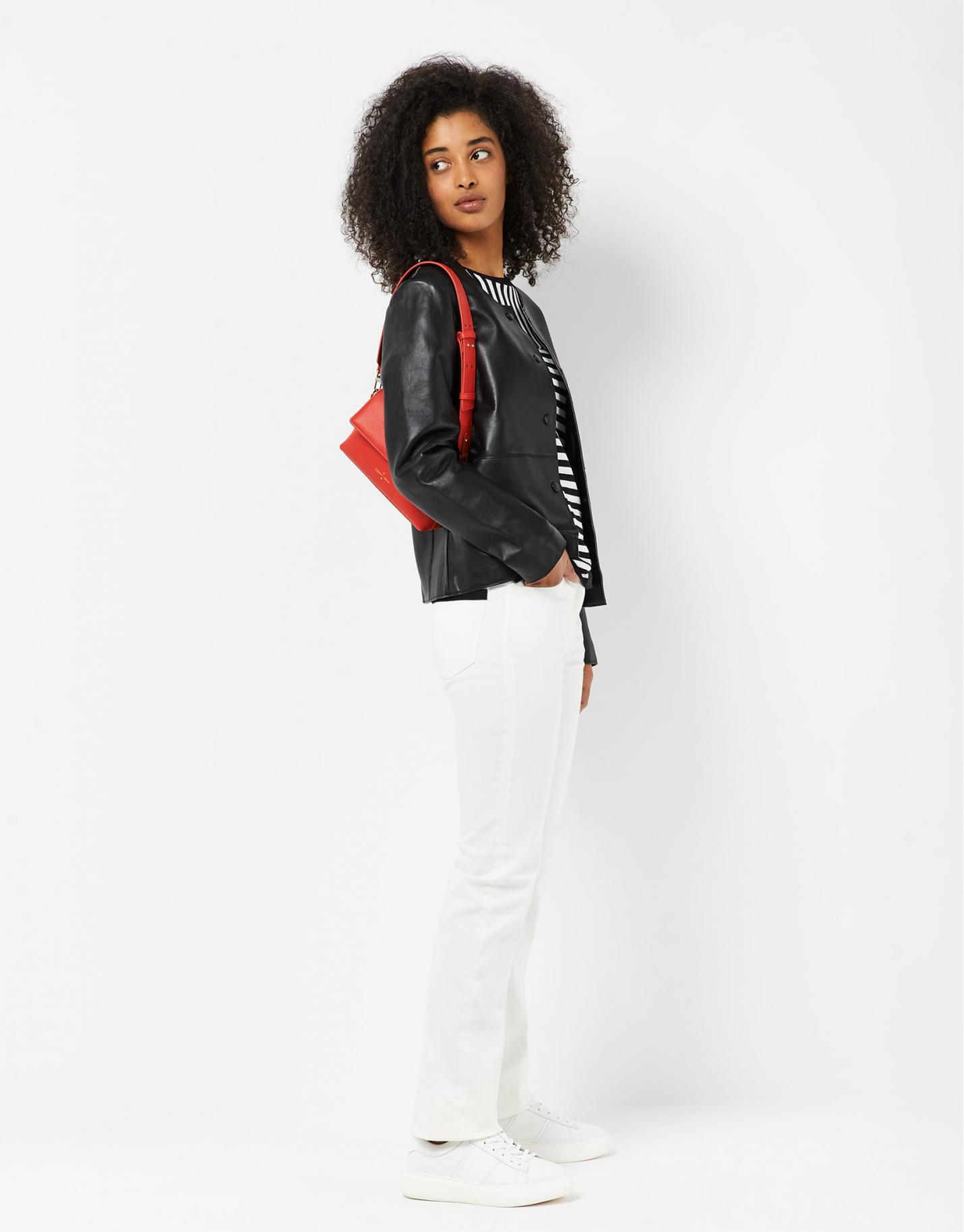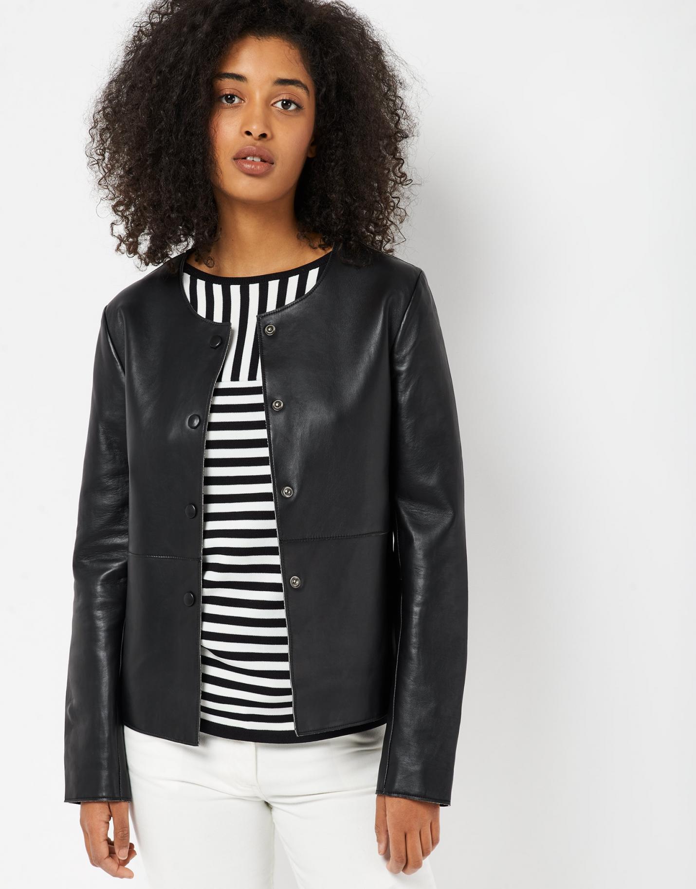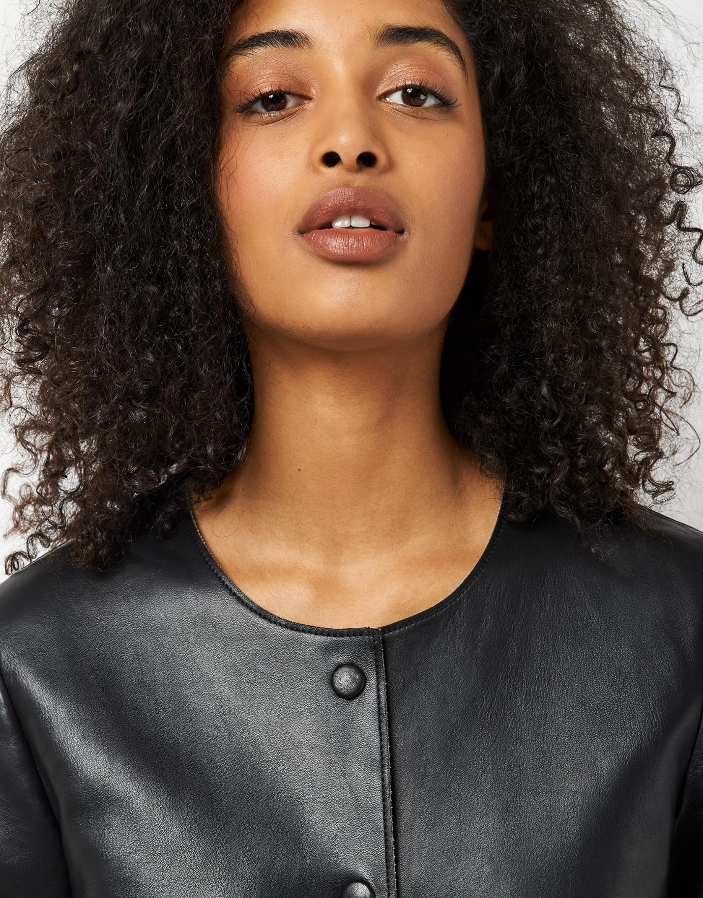 Chaqueta corta confeccionada en napa color negro con interior forrado en tejido de punto y botones forrados.