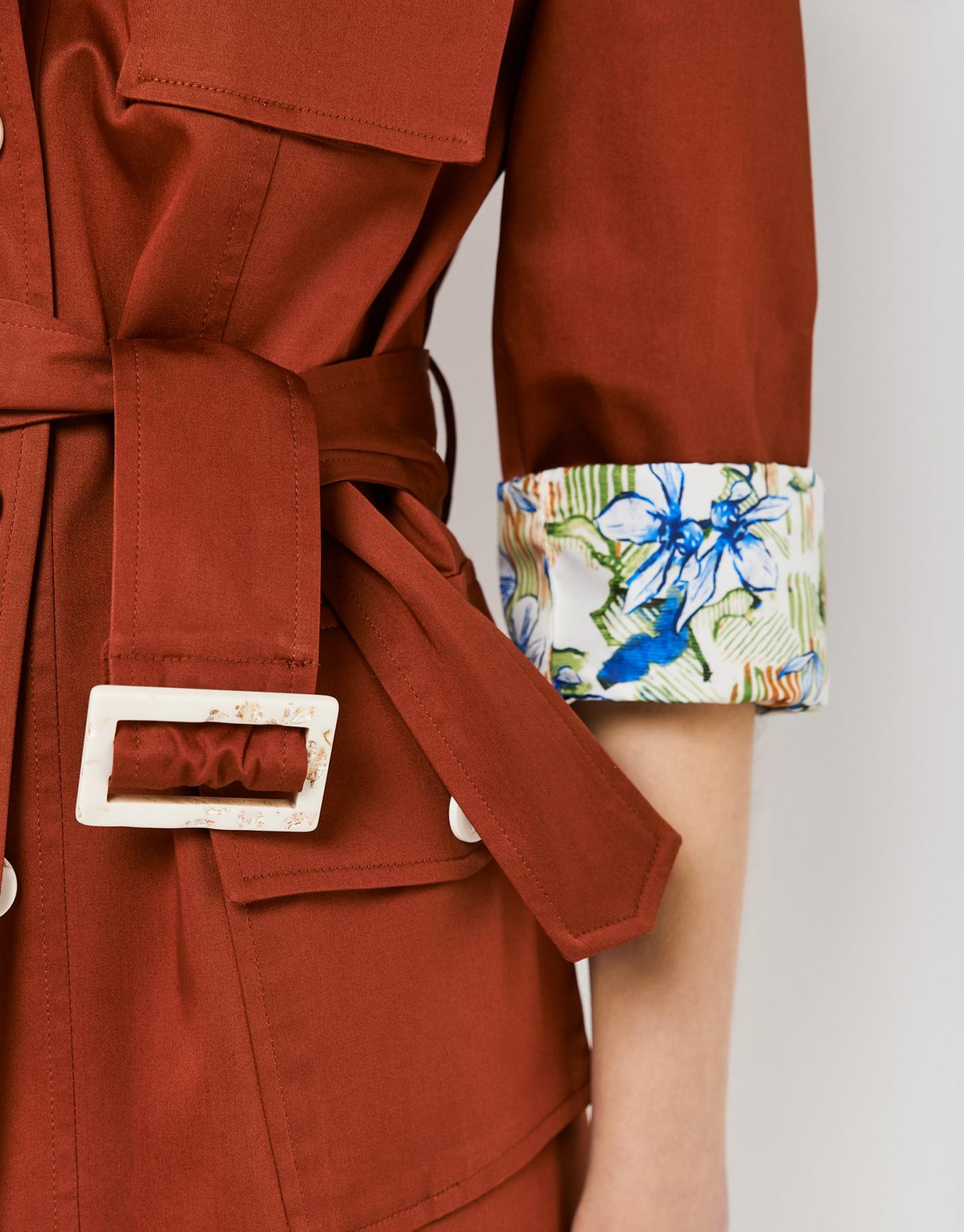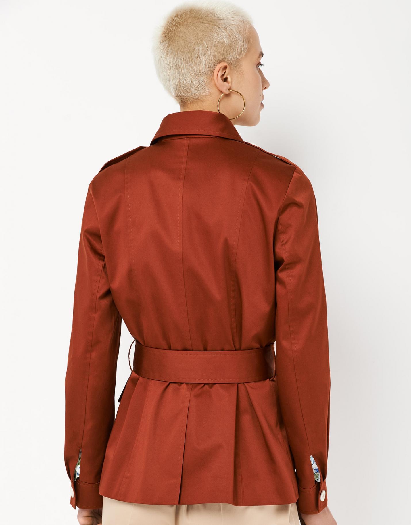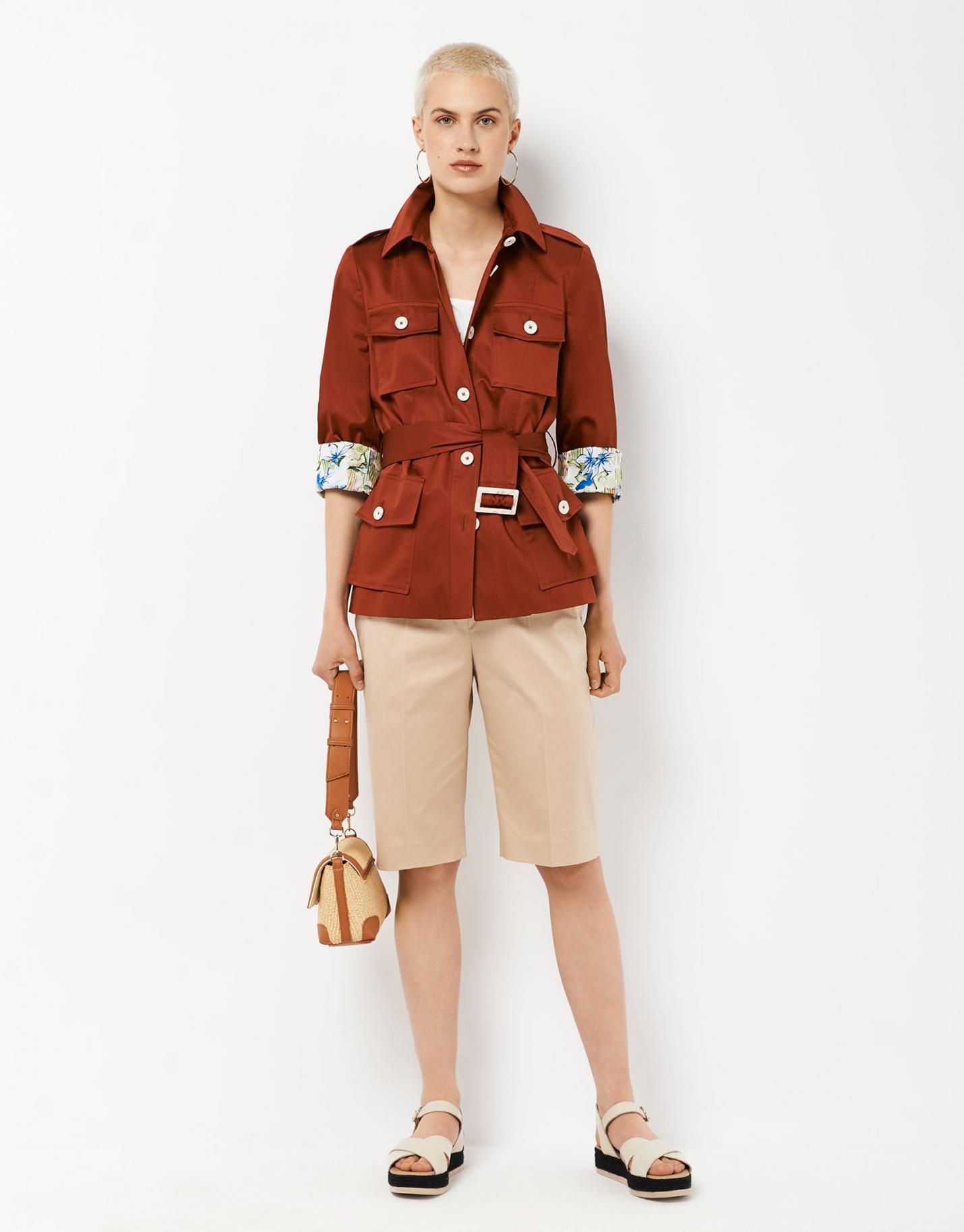 Chaqueta estilo sahariana confeccionada en un tejido de algodón color teja. Cuello camisero, trabillas en hombro y cierre con botonadura en delantero y con cinturón del mismo tejido. Cuatro bolsillos de tapeta con botón en delantero y manga rematada en puño con botón.