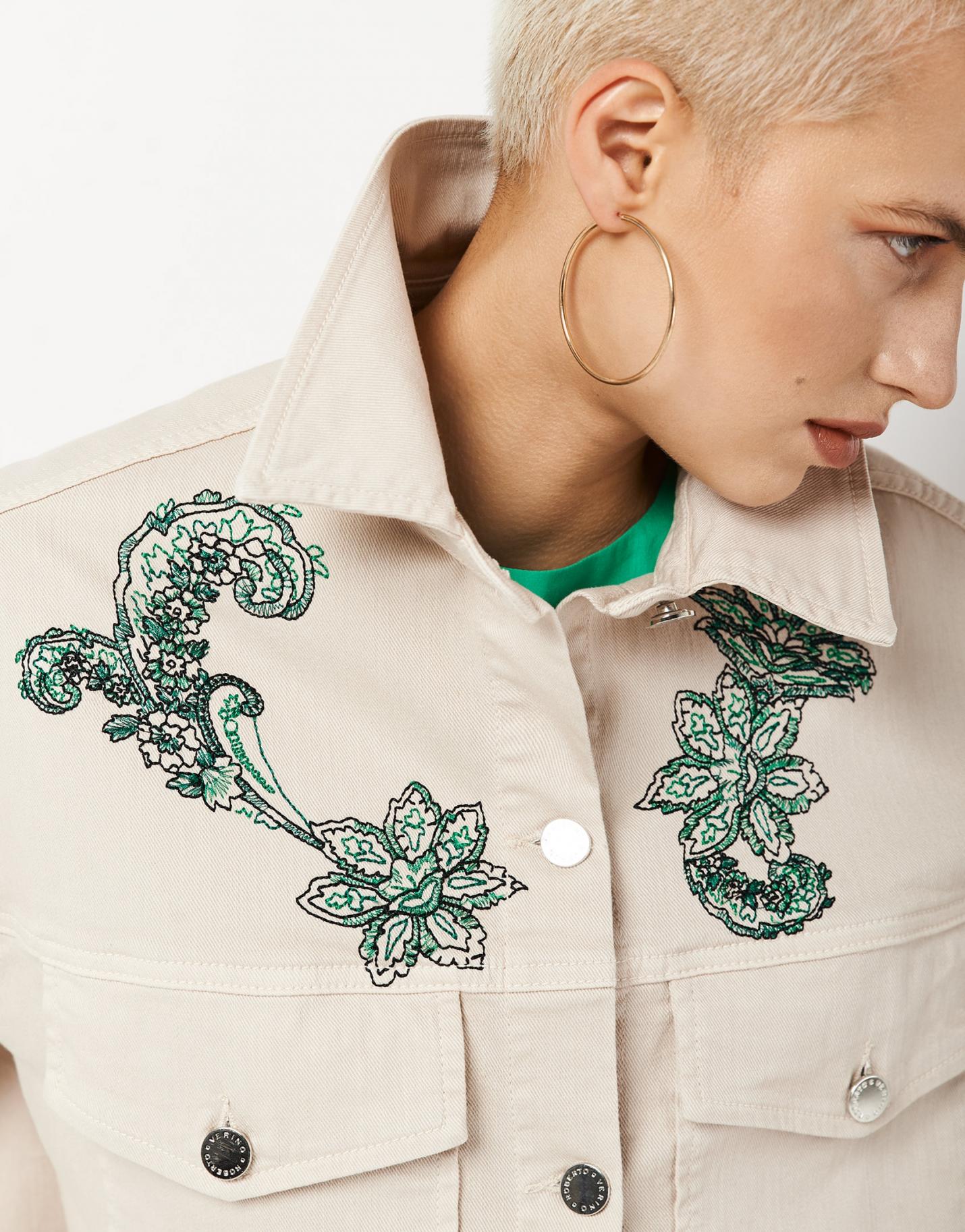 Chaqueta estilo sobrecamisa de corte vaquero confeccionada en un tejido color beige claro con bordado floral en tonos verdes en pecho. Cuello camisero, canesú en hombros, cortes en pecho y dos bolsillos de tapeta con botón en delantero. Manga larga rematada en puño con botón, bajo redondeado y cierre con botonadura frontal.