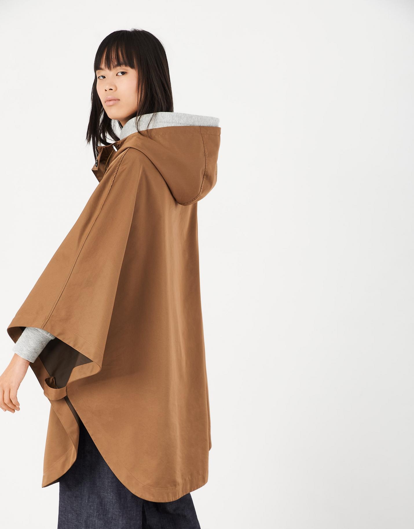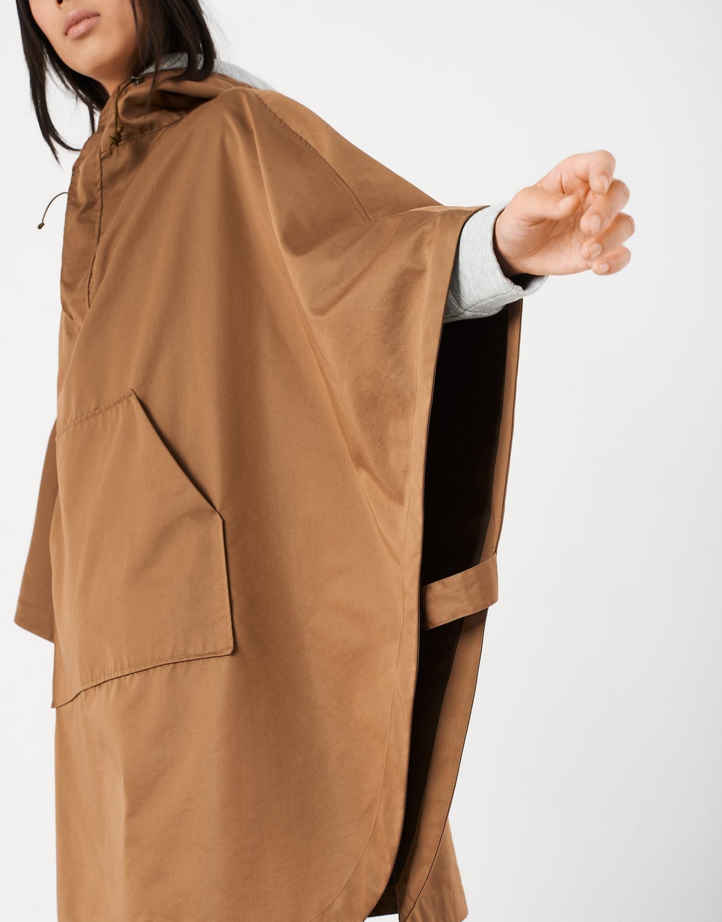 Poncho gabardina confeccionado en un tejido técnico marrón. Cuello subido con capucha, bolsillo tipo canguro en delantero, cierre con broches ocultos bajo tapeta y bajo redondeado con aberturas y cierre con trabilla y broche.