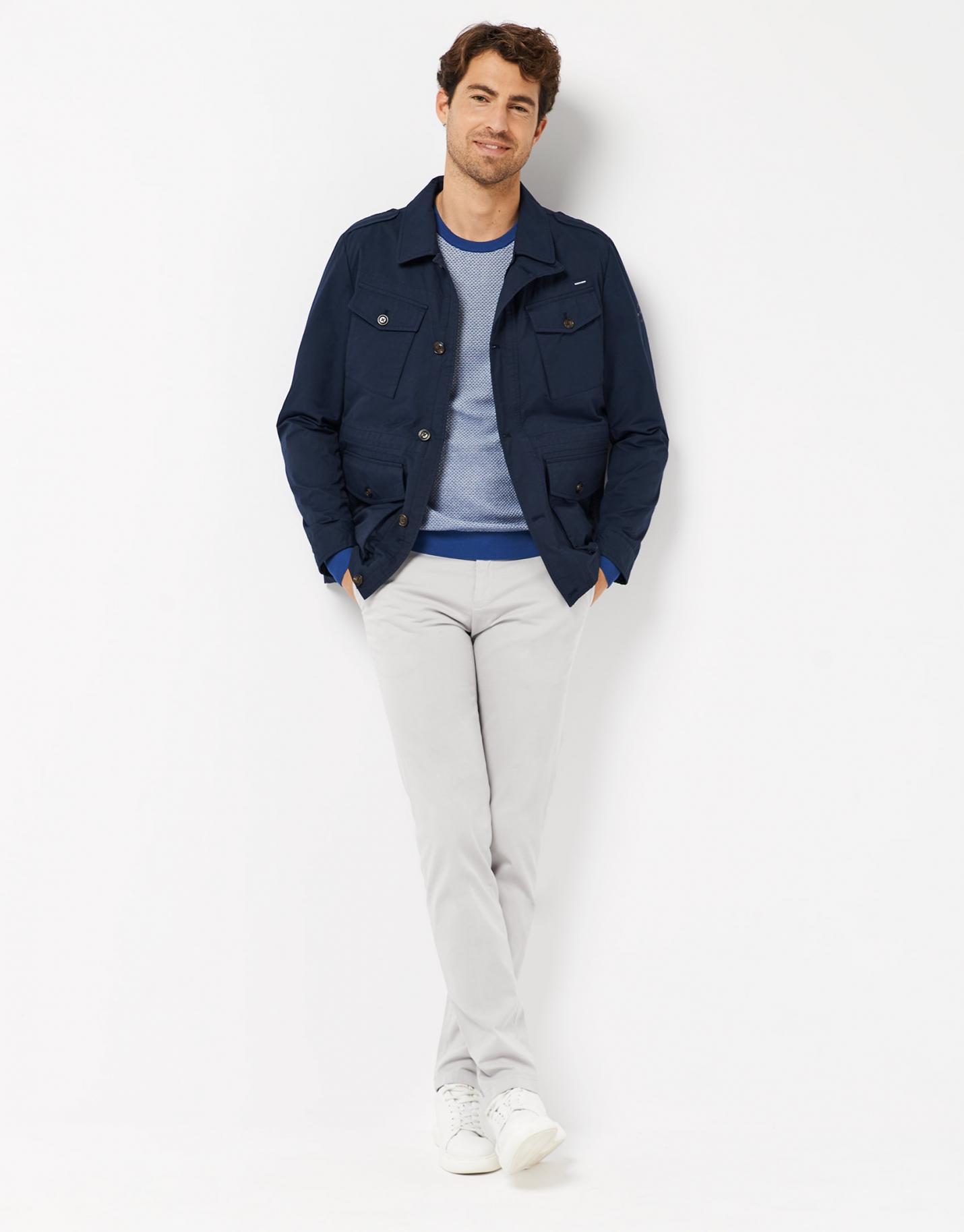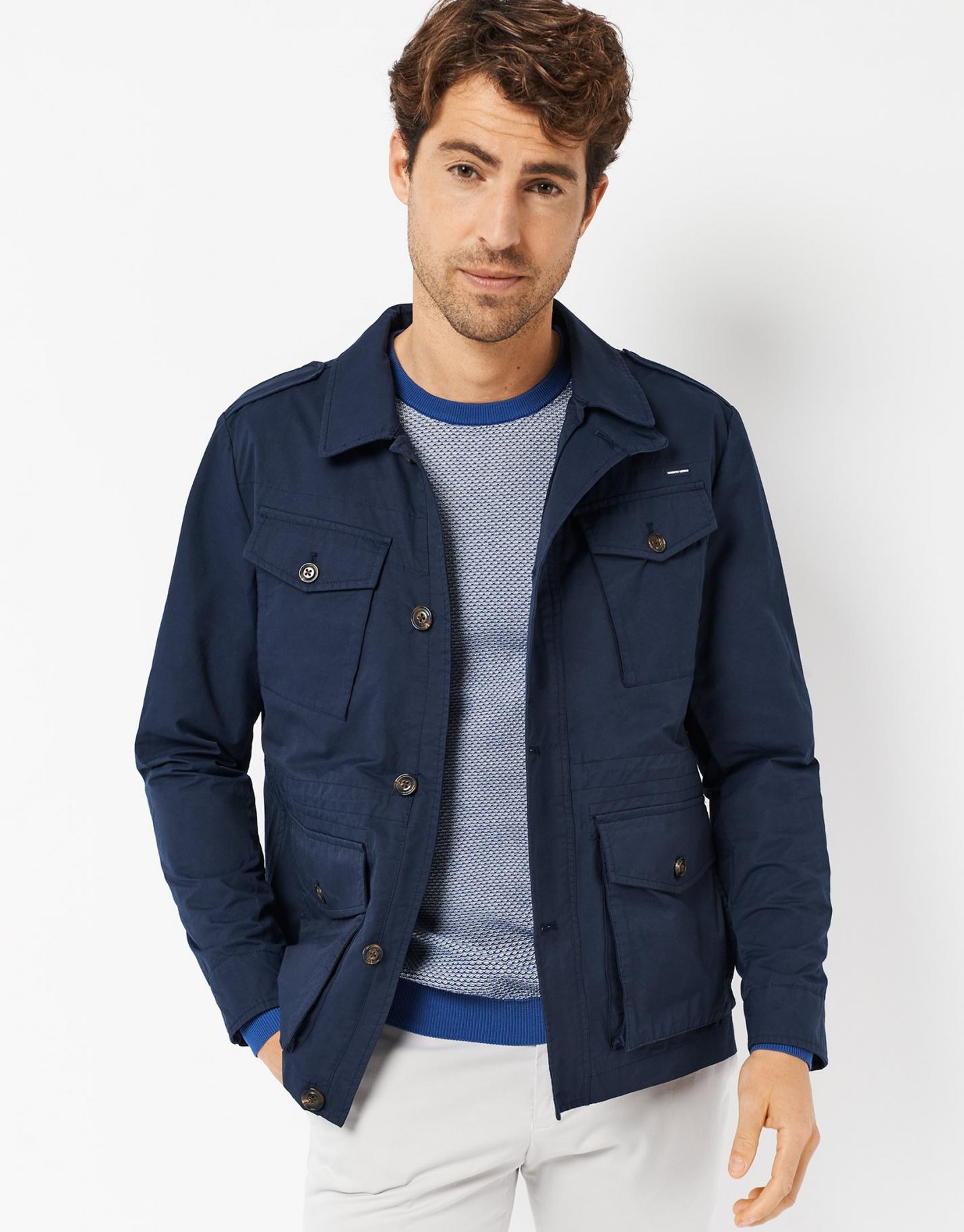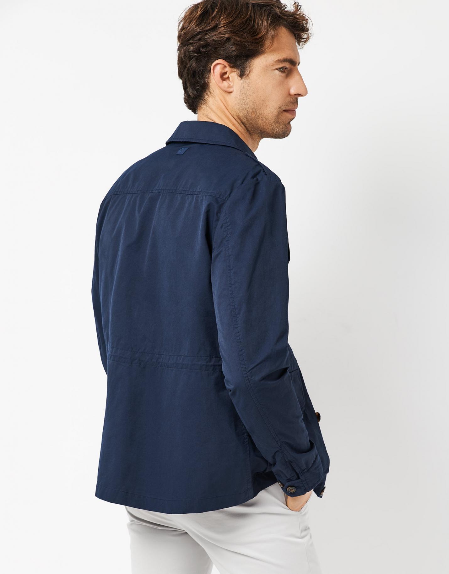 Chaqueta estilo sahariana confeccionada en un tejido de algodón y nailon color azul marino. Cuello camisero, cierre oculto con cremallera y con botones a la vista. Cuatro bolsillos de parche en delantero y cintura con ajustador interior para ceñir.