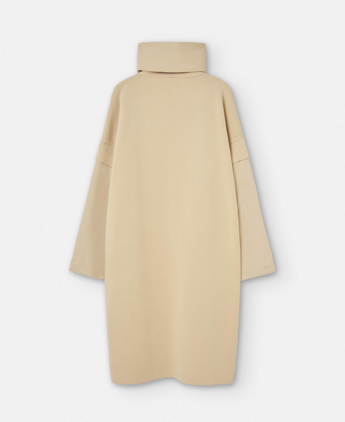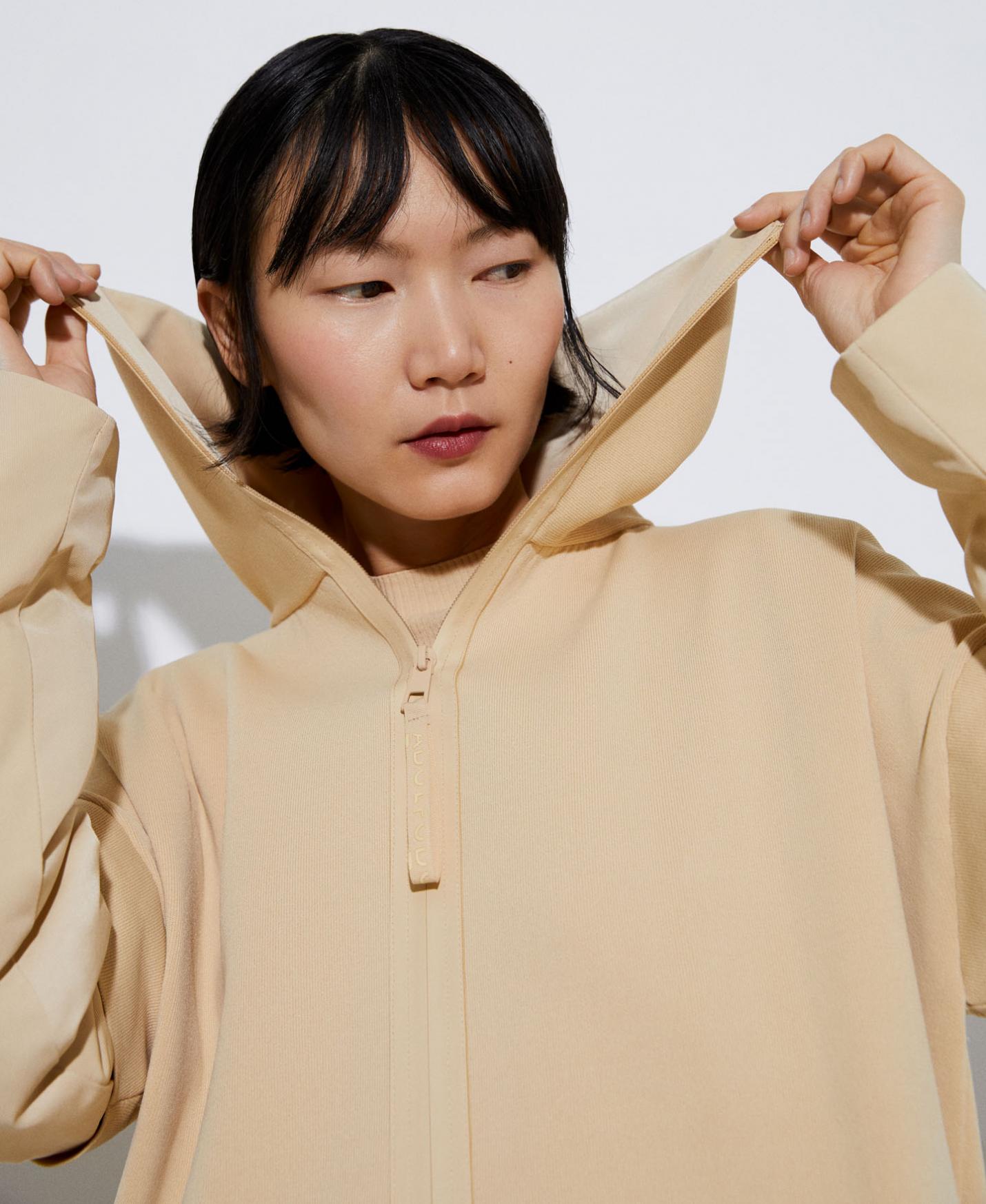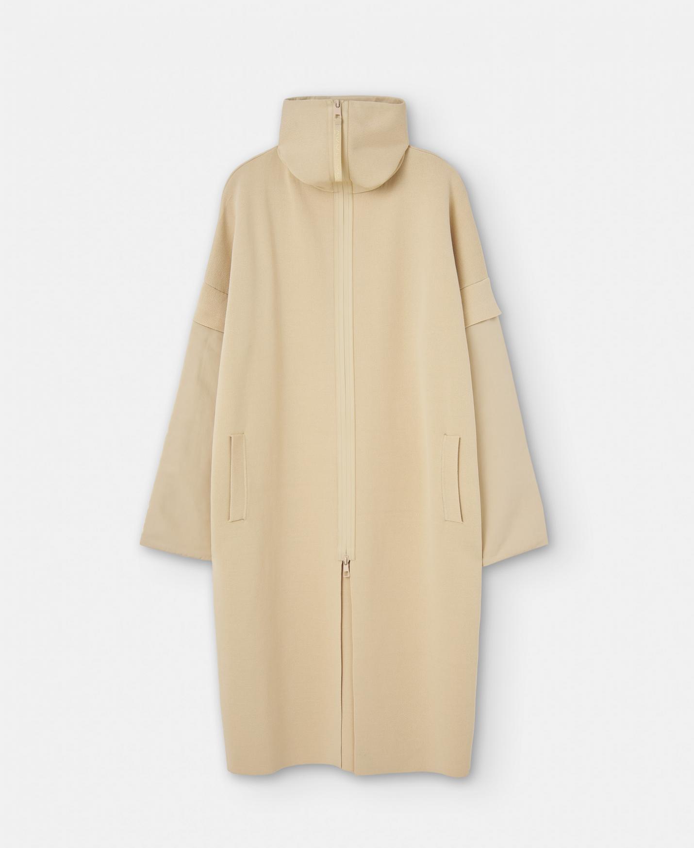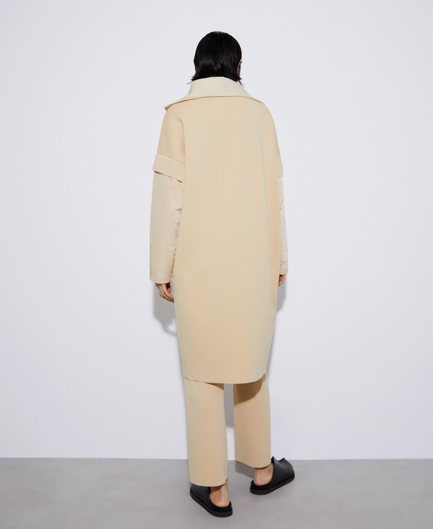 Abrigo de doble frontura en punto en viscosa y nylon reciclado. Tiene cuello alto, cierre de cremallera termosellada y mangas.