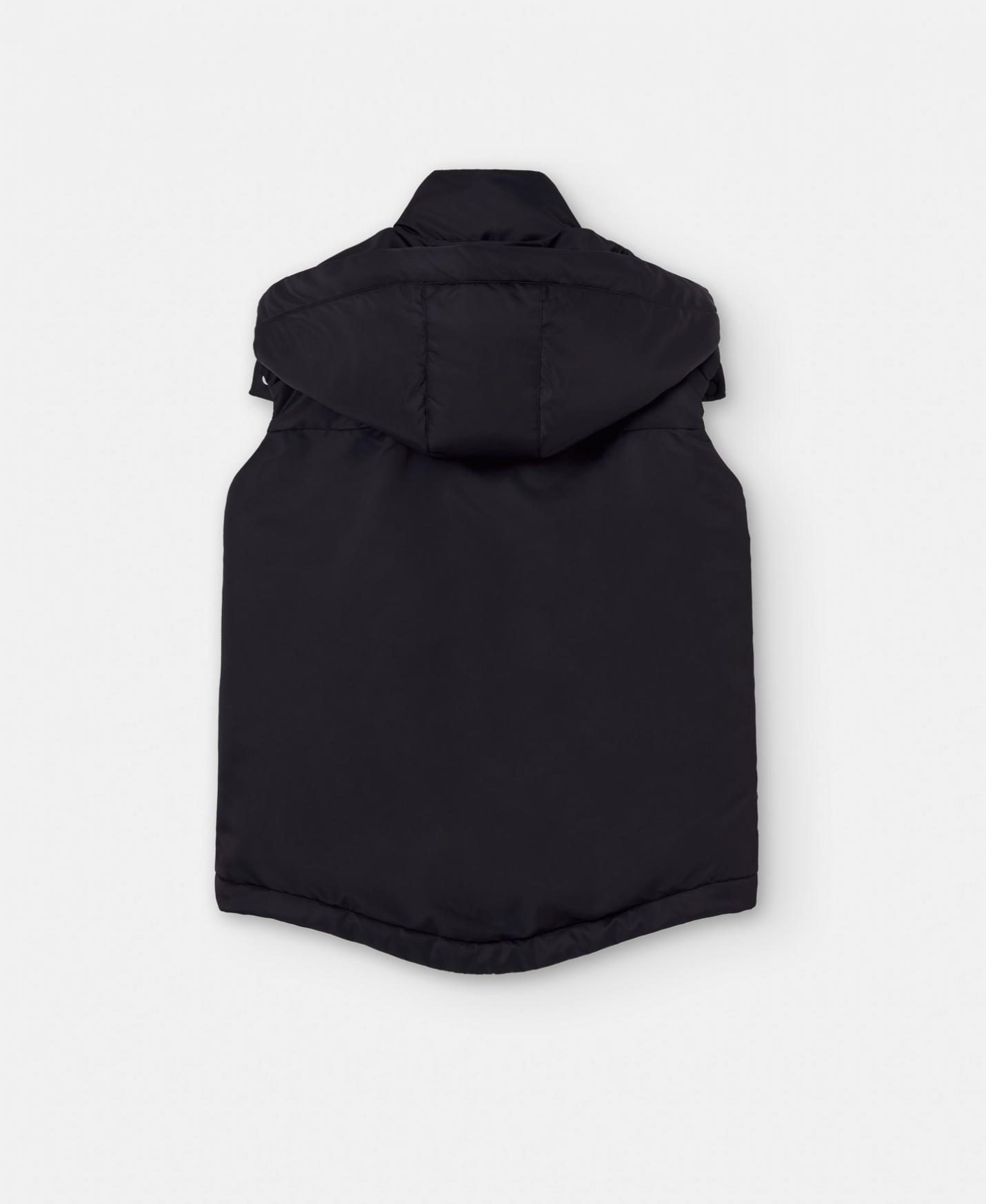 Chaleco con capucha desmontable en nylon. Está acolchado con relleno sintético y tiene cierre por cinta de nylon, cremallera y bolsillos laterales oblicuos.