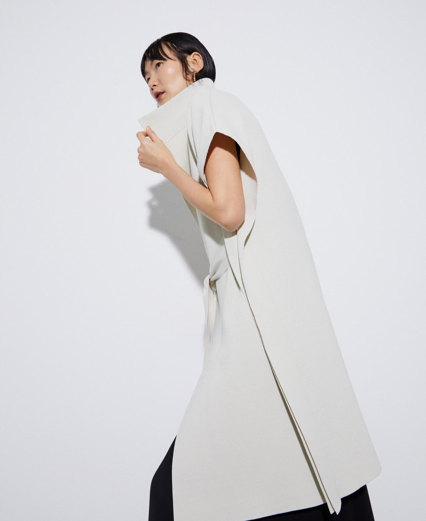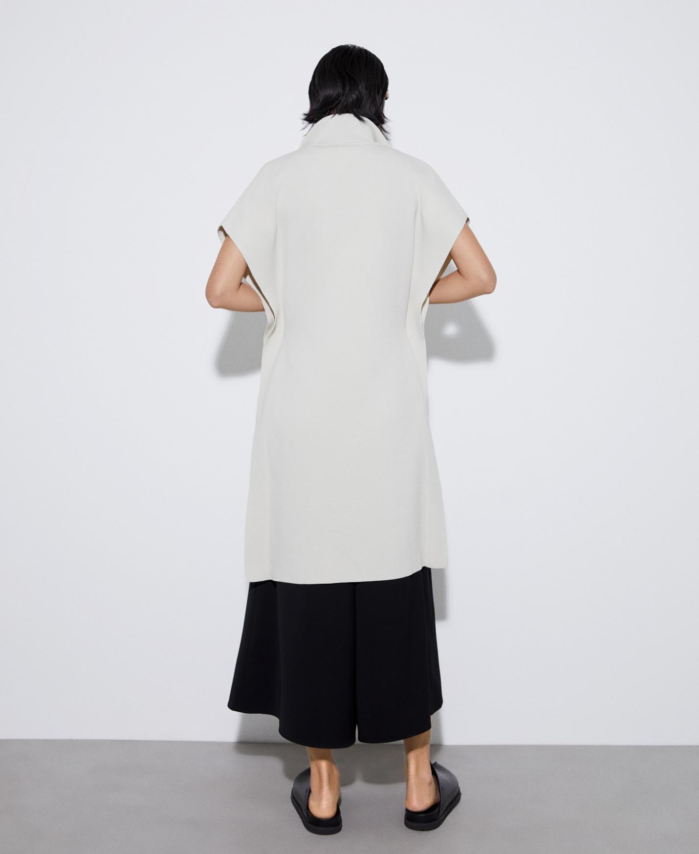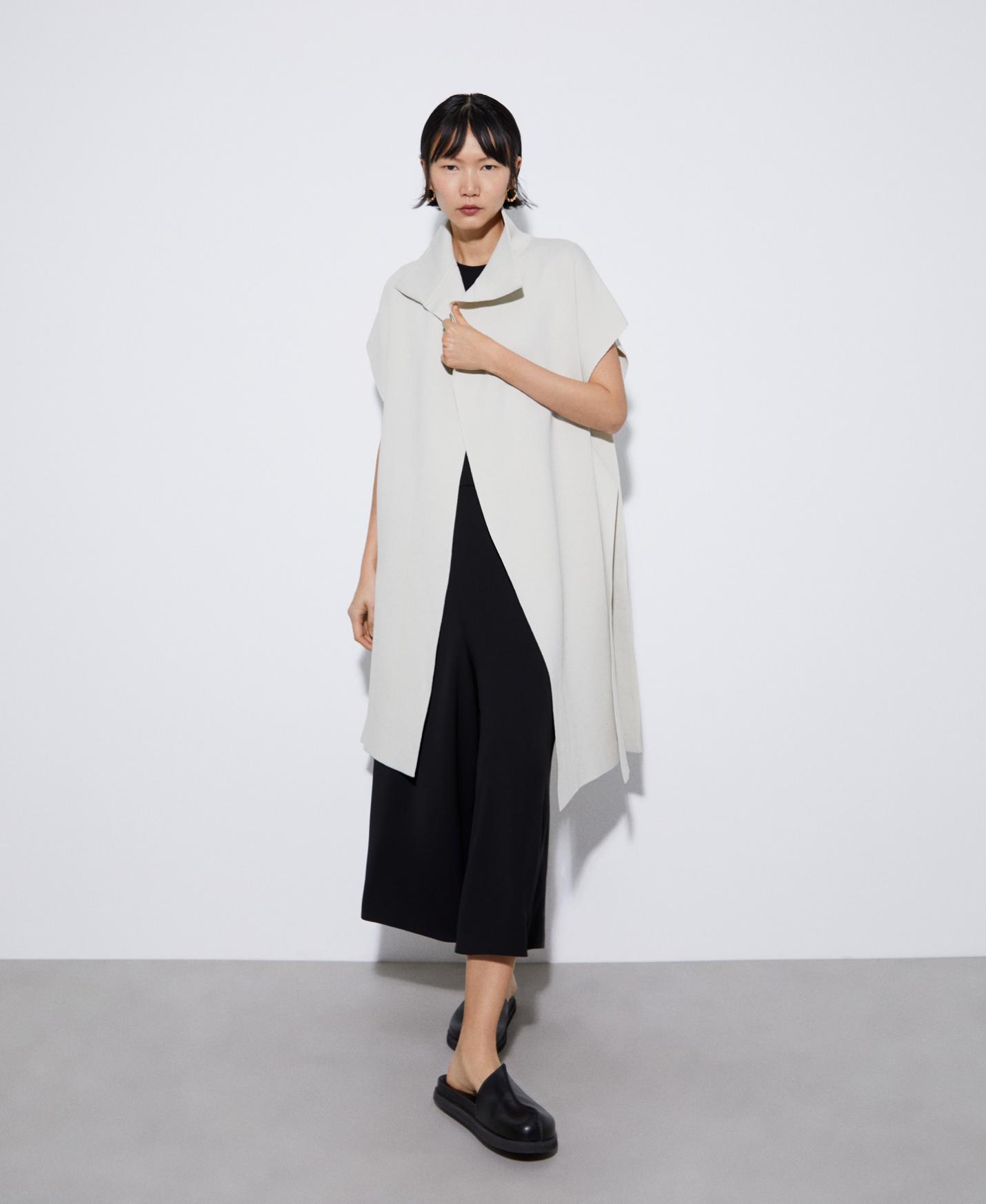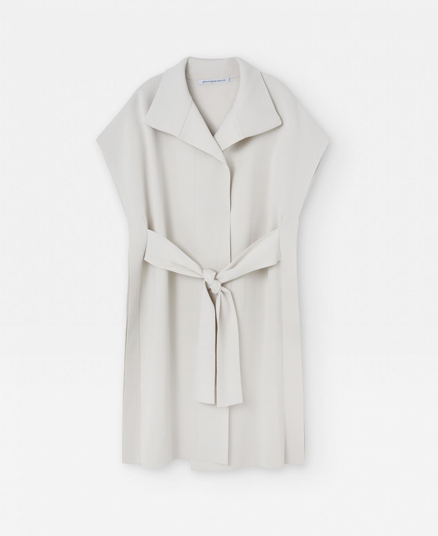 Capa en punto doble cara de nylon reciclado. Corte recto. Cinturón a tono en delantero.