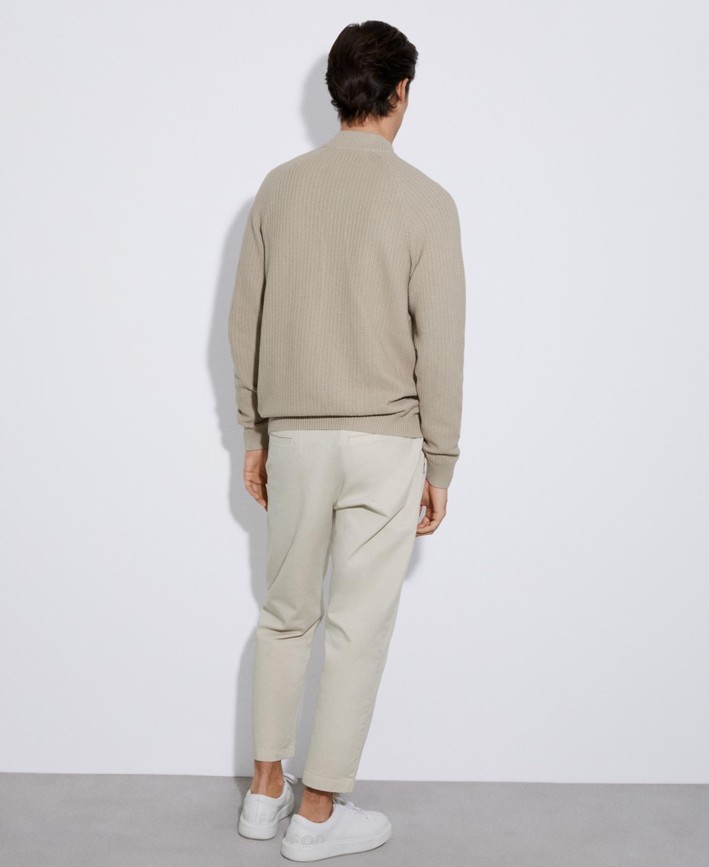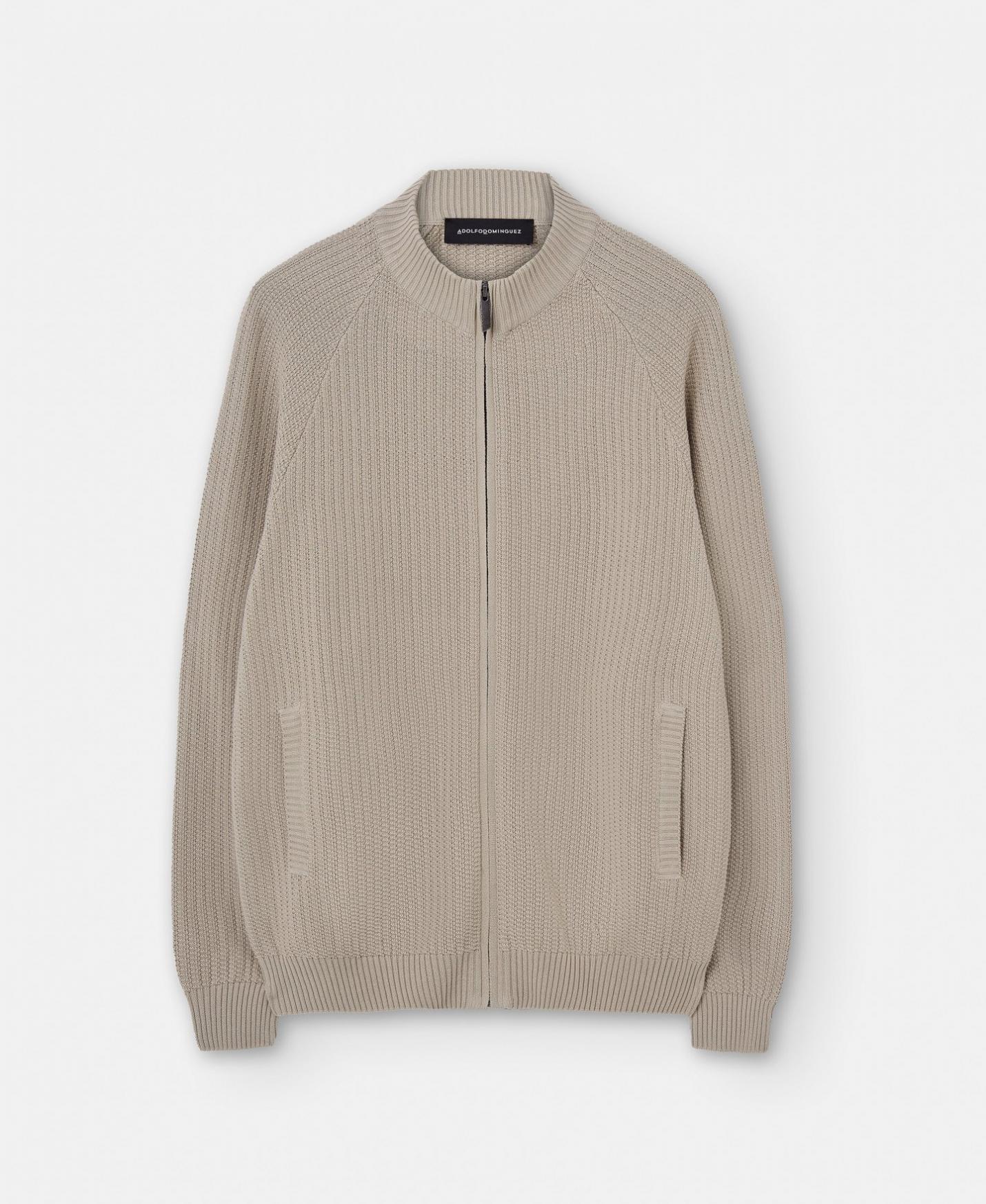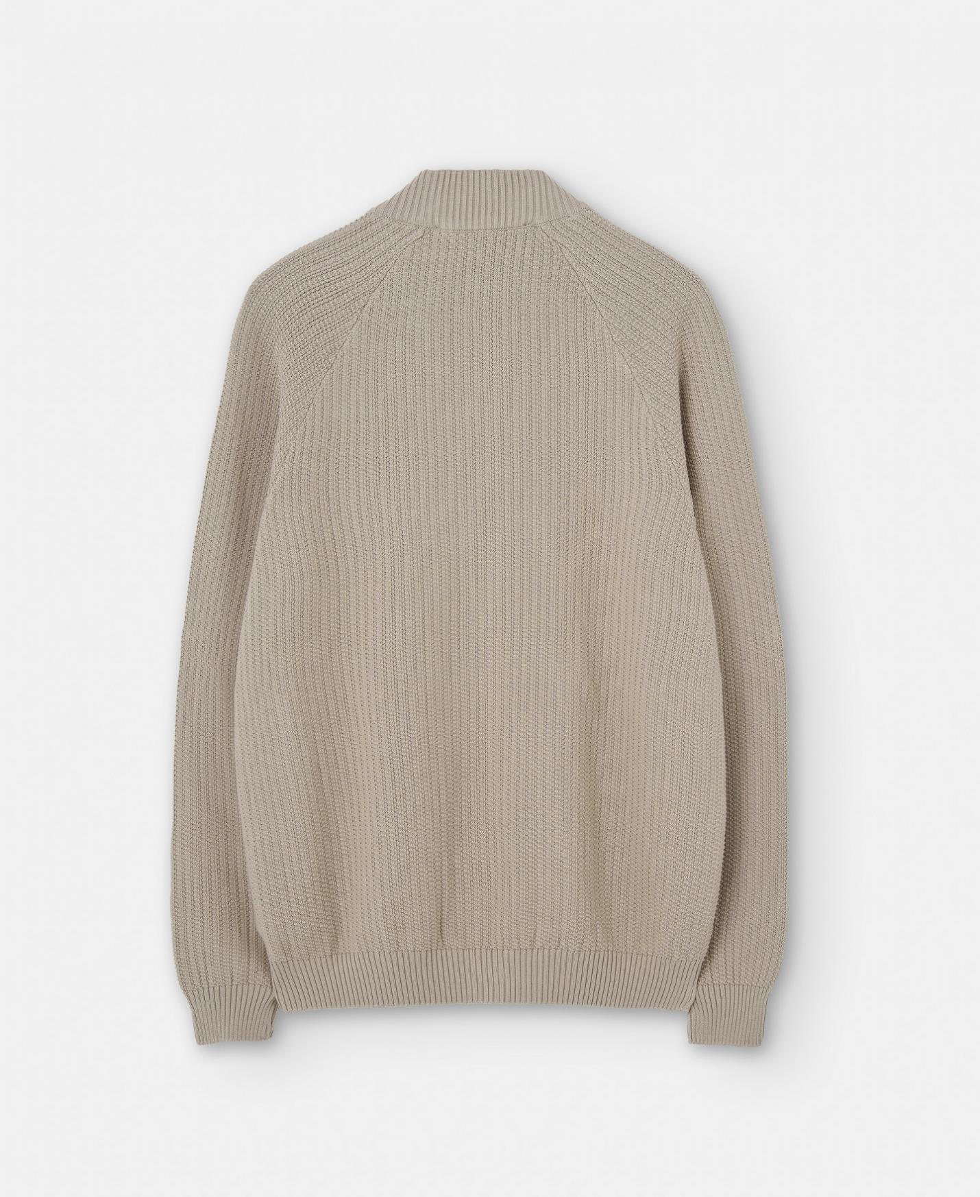 Chaqueta cuello caja cremallera central en punto de algodón responsable. Tiene manga ranglán, bolsillos laterales en vivo y remates en rib.