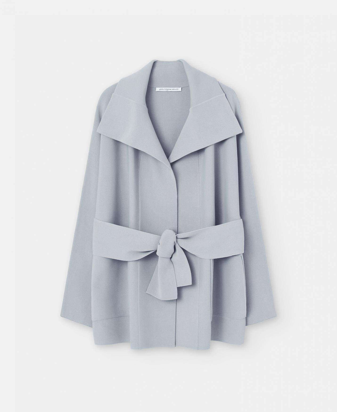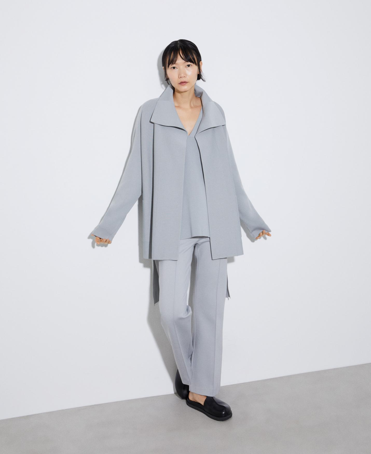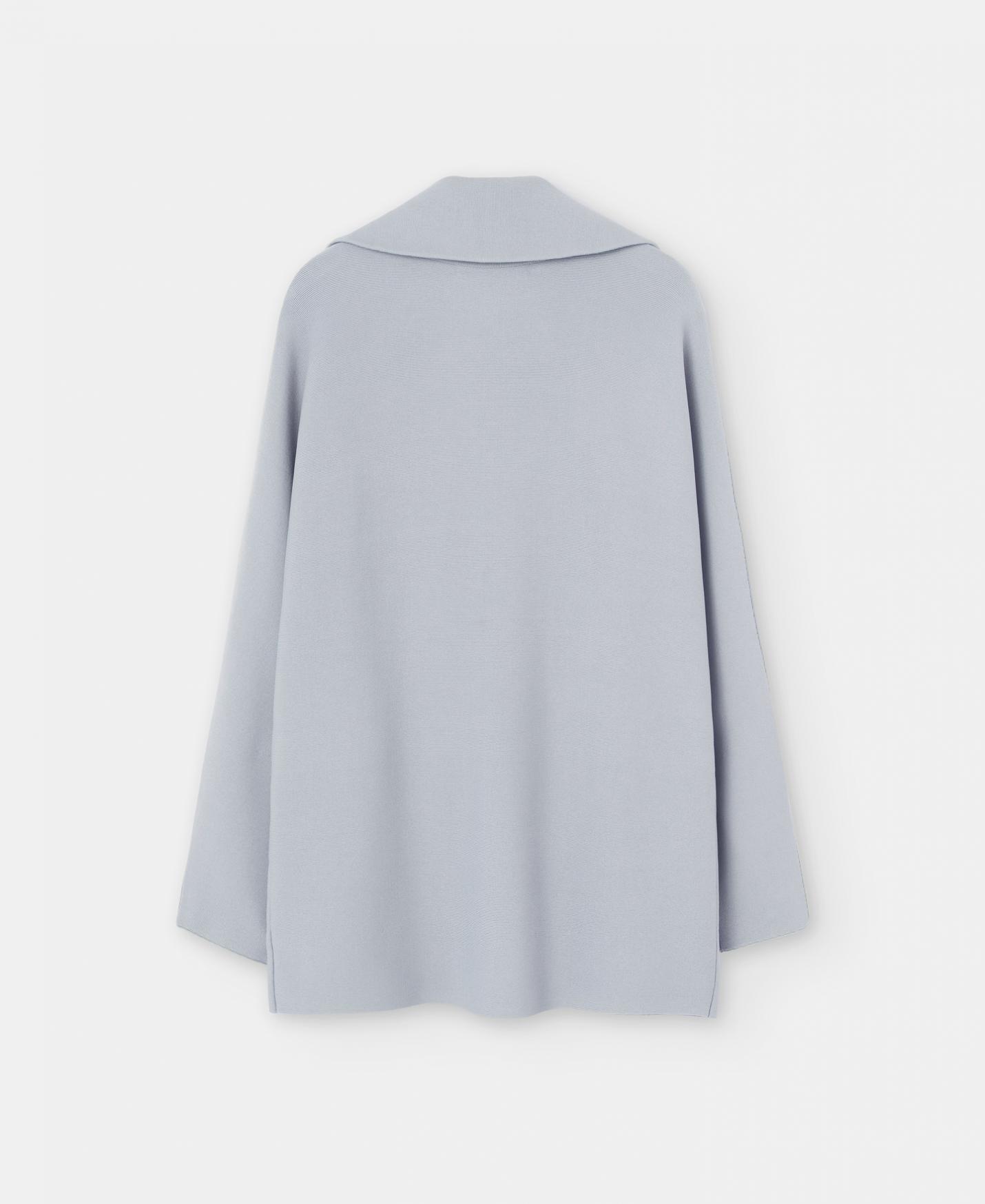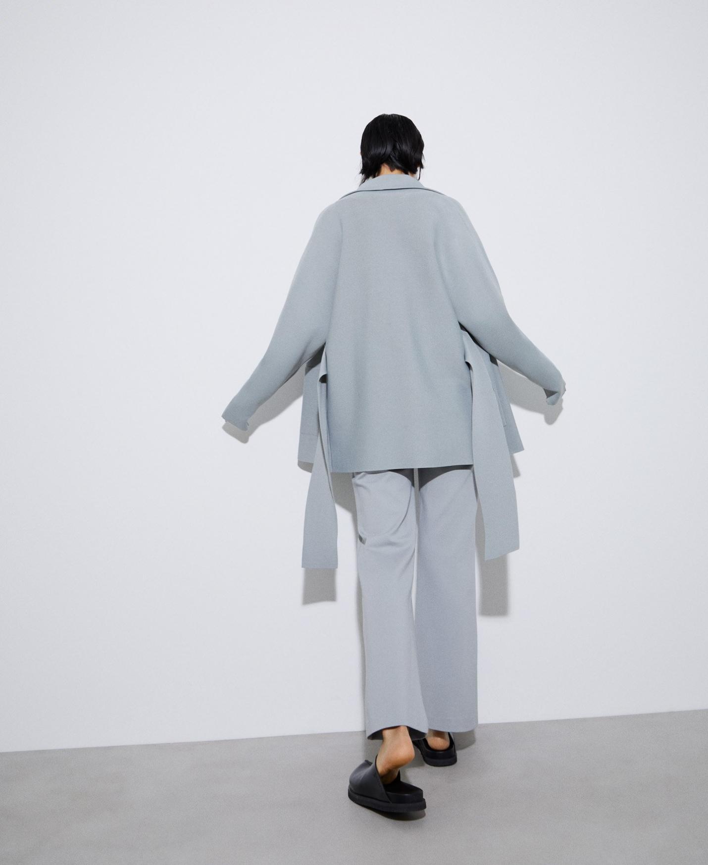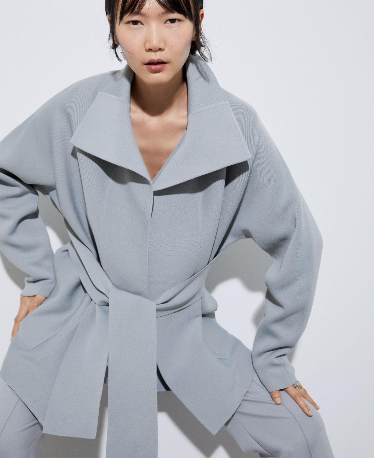 Chaqueta punto doble frontura en viscosa y nylon reciclado. Tiene cuello solapa, manga japonesa, cierre de cinturón y bolsillos parche laterales.