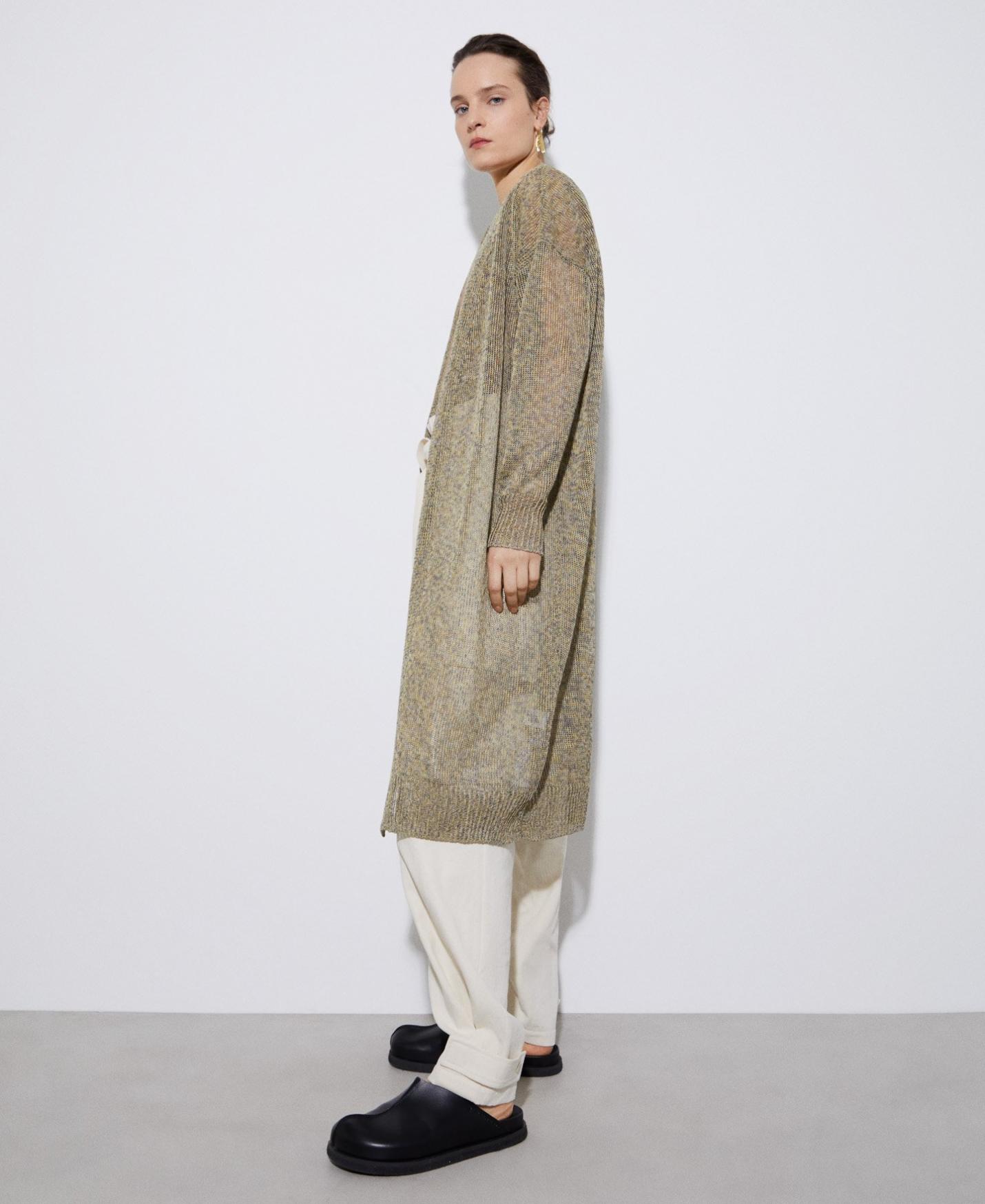 Chaqueta extralarga en punto de lino y nylon. Sin cierres y manga larga.