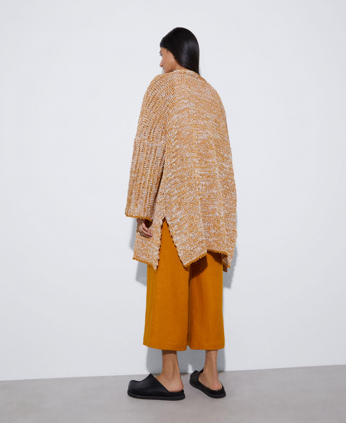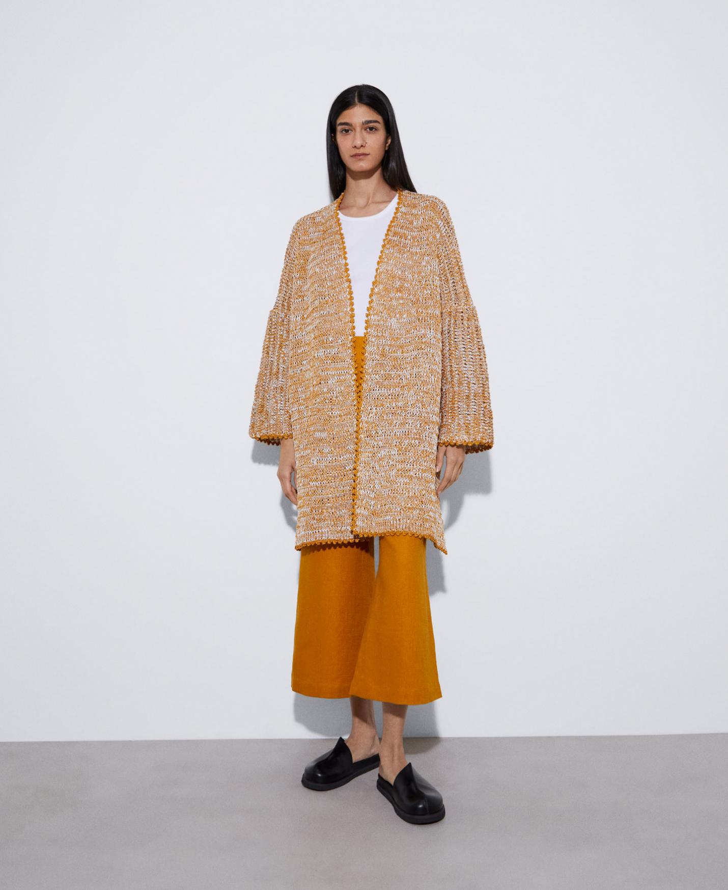 Chaqueta kimono larga en punto de doble frontura. Manga larga recta.