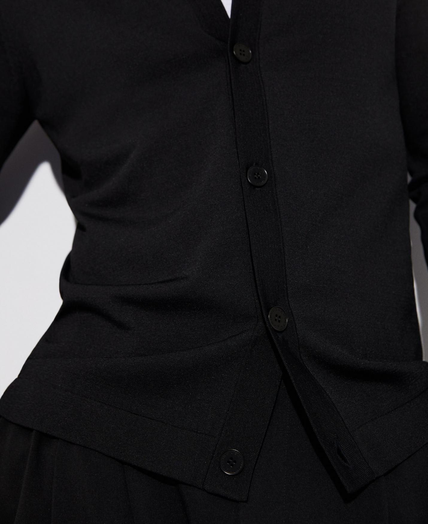 Chaqueta de punto en viscosa y nylon reciclado. Tiene cierre de botones, corte recto y manga larga.