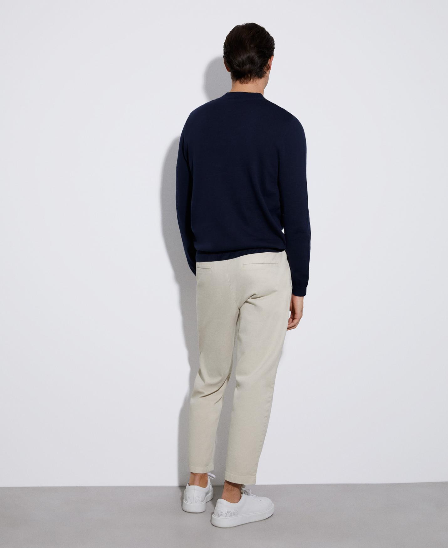 Jersey cuello pico en algodón responsable. Tiene cuello pico, manga larga y remates en rib.